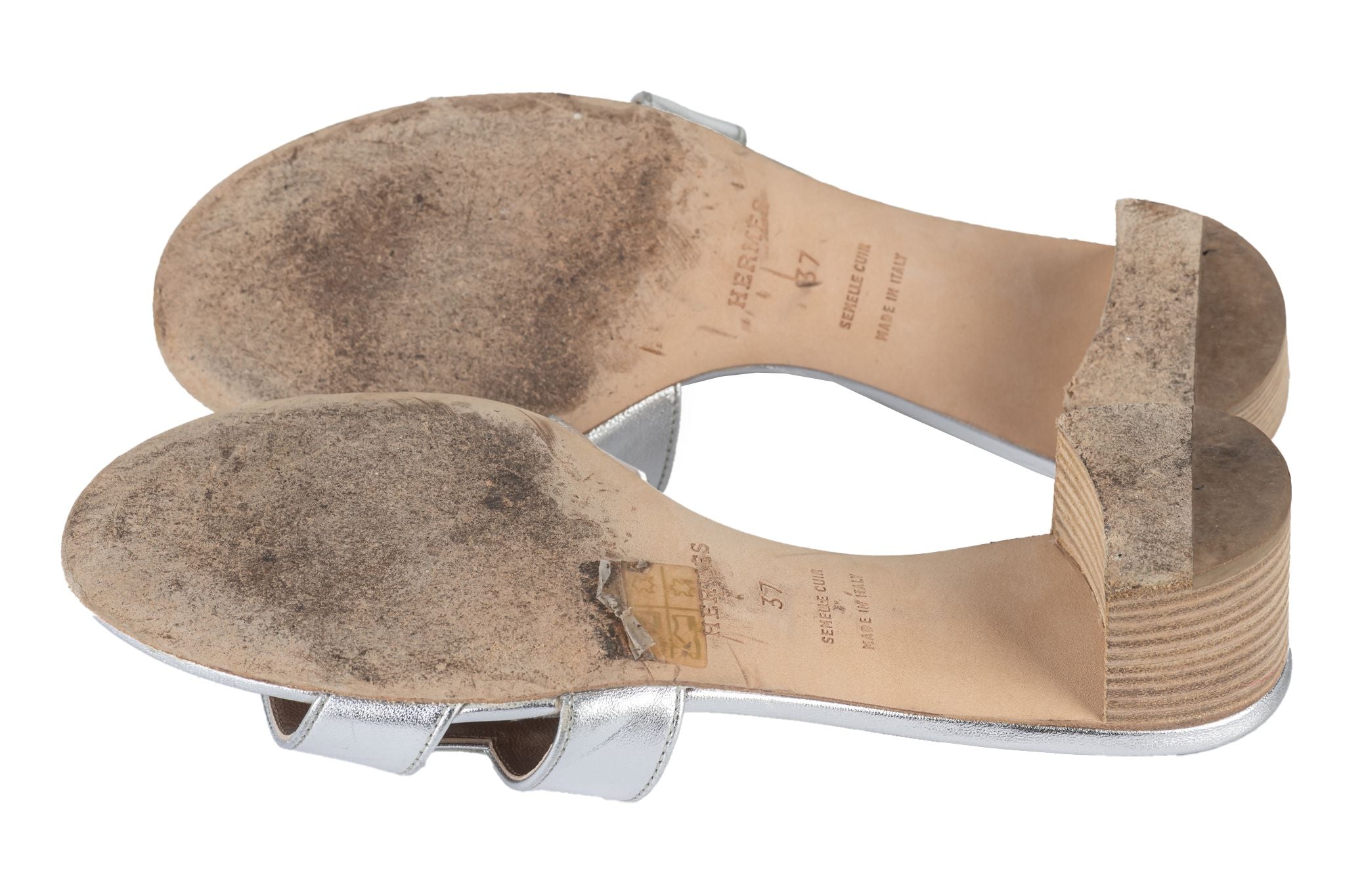 These Hermès Oasis sandals have been crafted of leather and feature the iconic H. Size are European number 37. Heel measures 2". Small scratch on top front of one shoe, please refer to photo. Store price $910 + tax. Comes with double original dustcover.