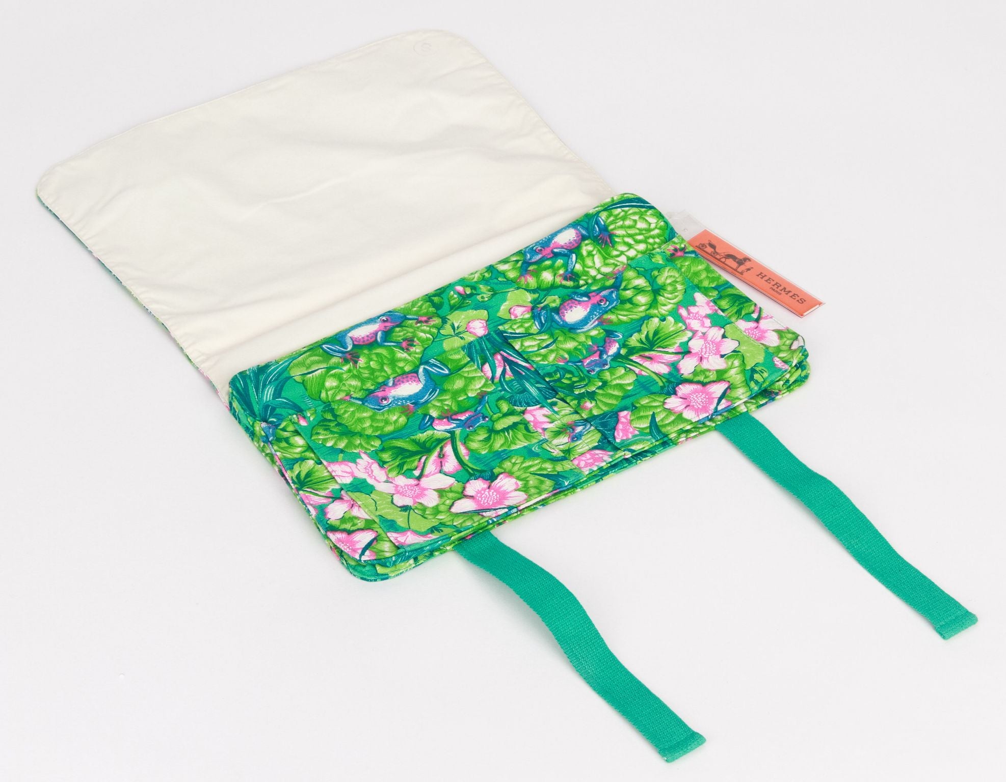 Hermès vintage green frogs toile clutch. 2 front pockets and 2 interior compartments. Stamped S on the label. Comes with generic dust cover and original tag.