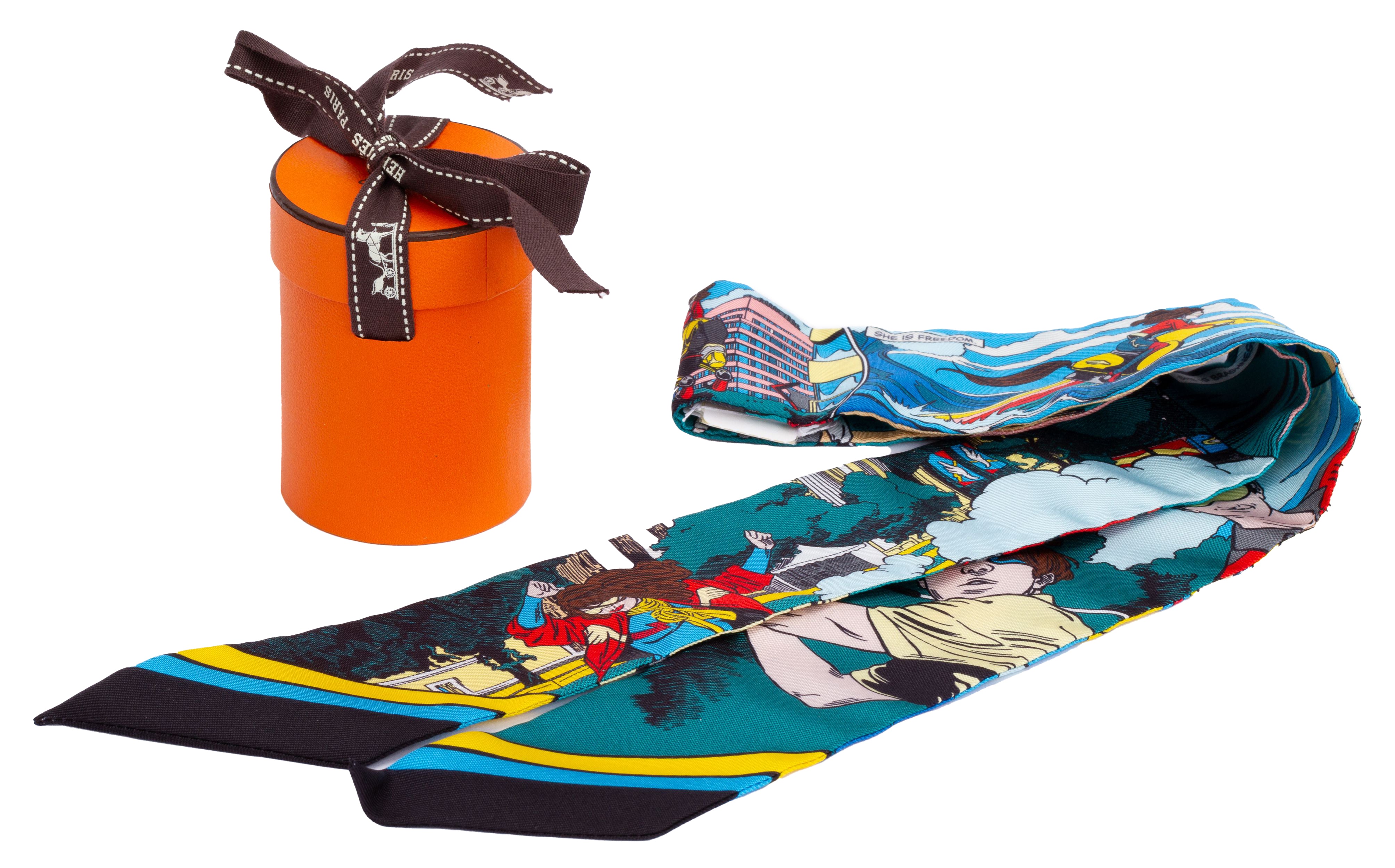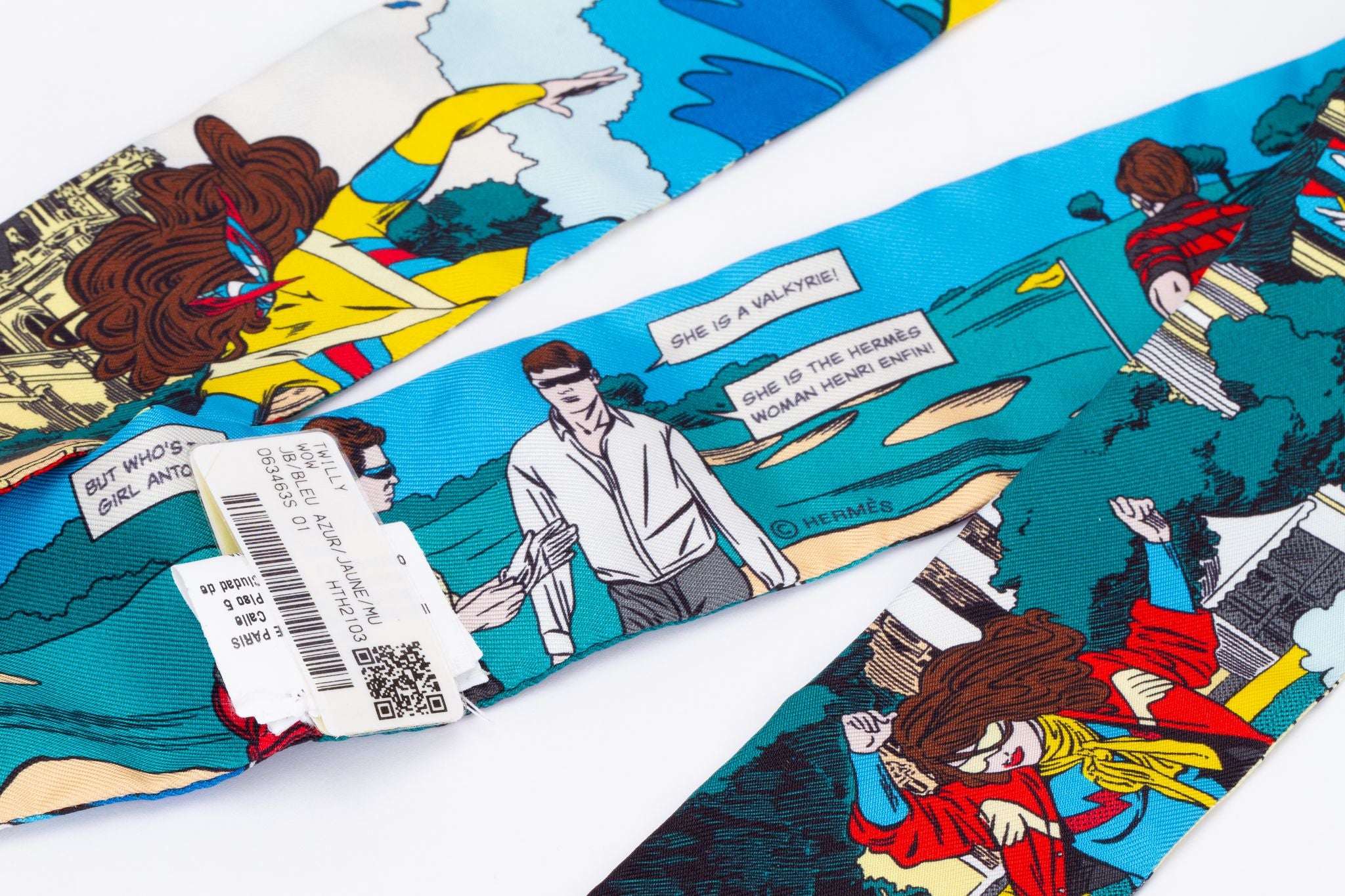 New Hermès Wonderwoman Comic Twilly. This scarf is made out of silk and the print shows a comic from superwoman. The pieces comes in the original box and is wrapped with the traditional Hermès ribbon.