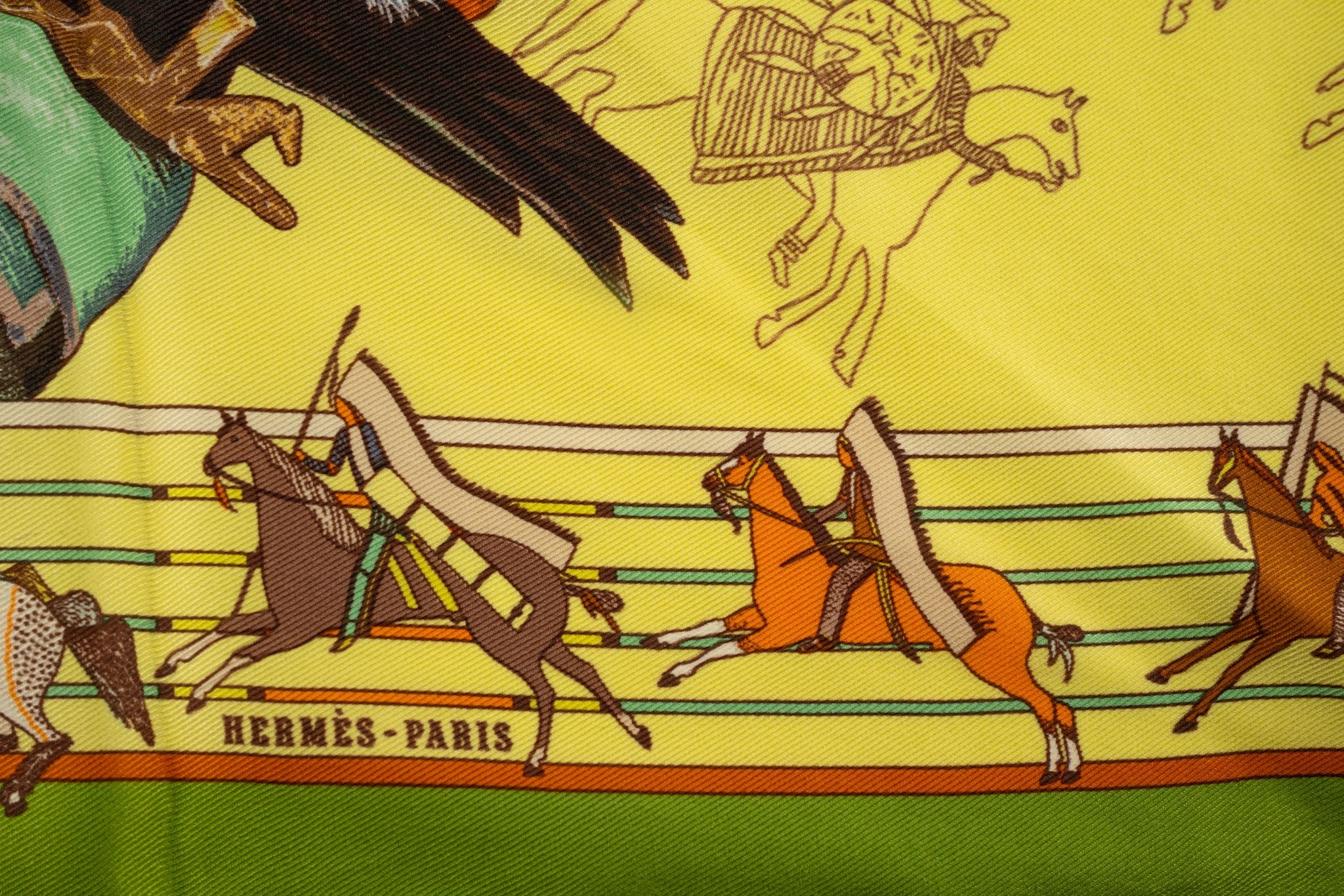 Hermès collectible design "Pani la Shar Pawnee " by Kermit Oliver. Unusual triangular shape in yellow 100% pure silk with green trim. Designed by Kermit Oliver in 1984. No tag.