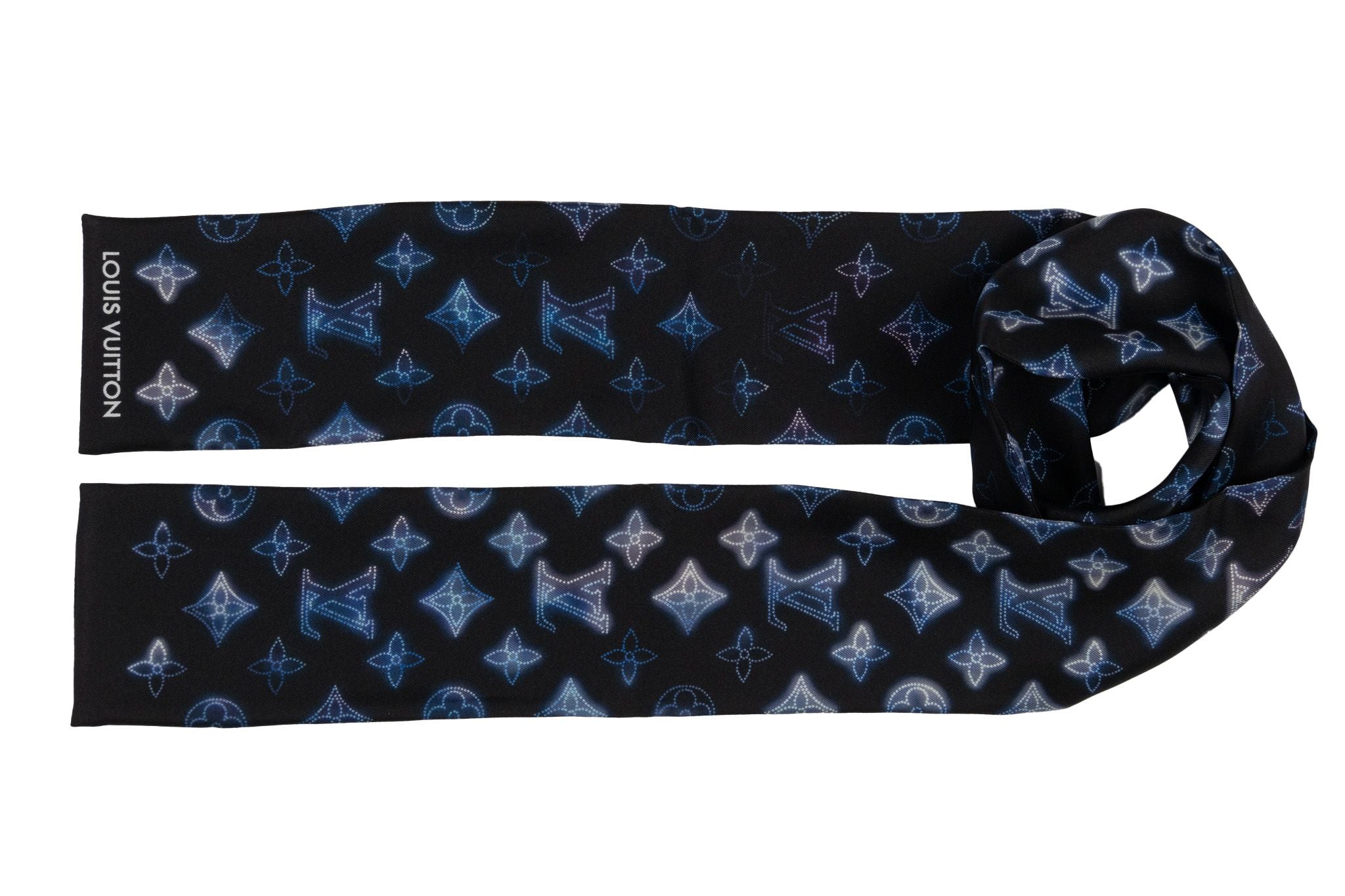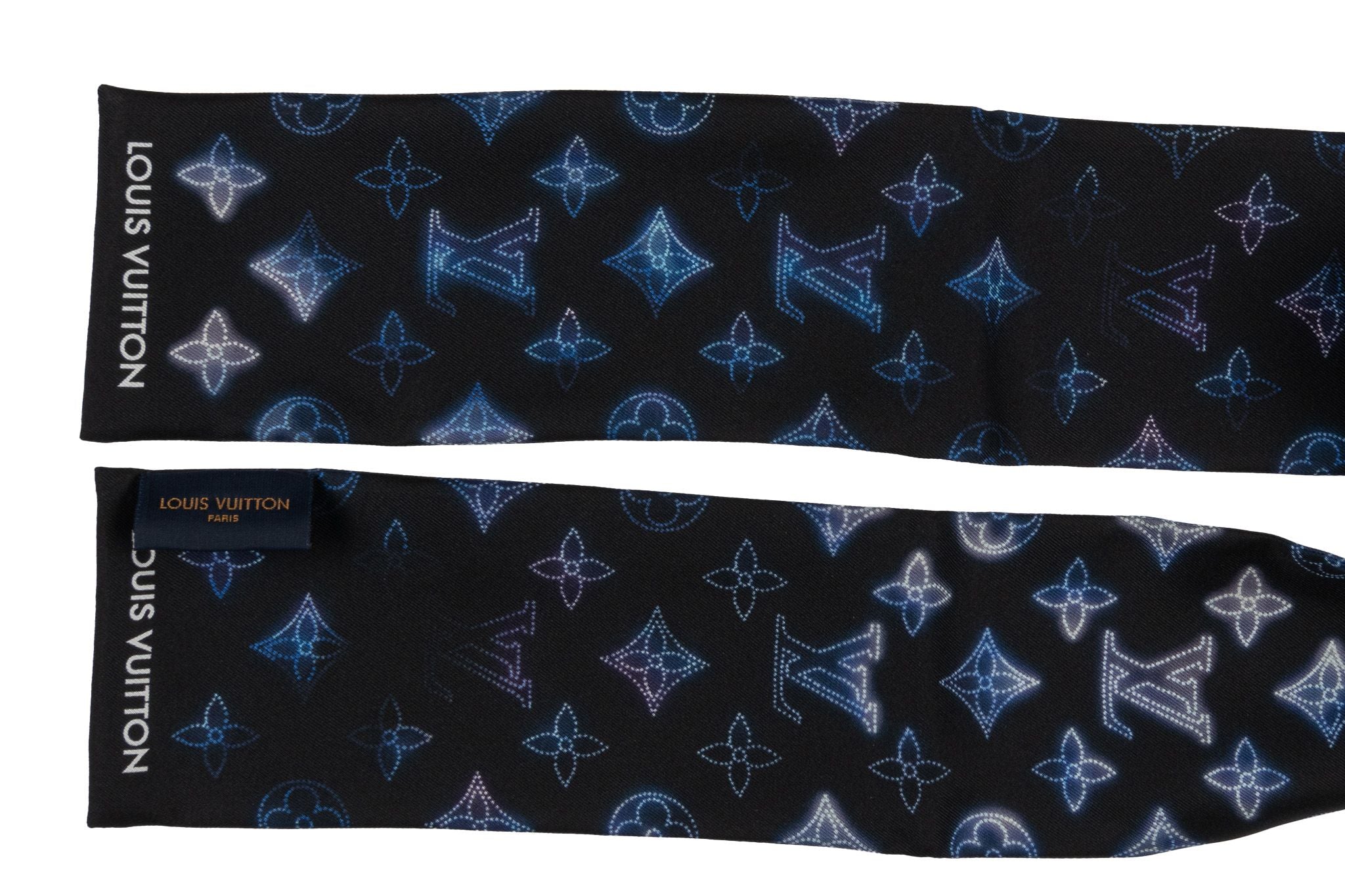This Silk Monogram Flight Mode Bandea, made from 100% silk with Blue LV logos on a black background. Comes with original box.