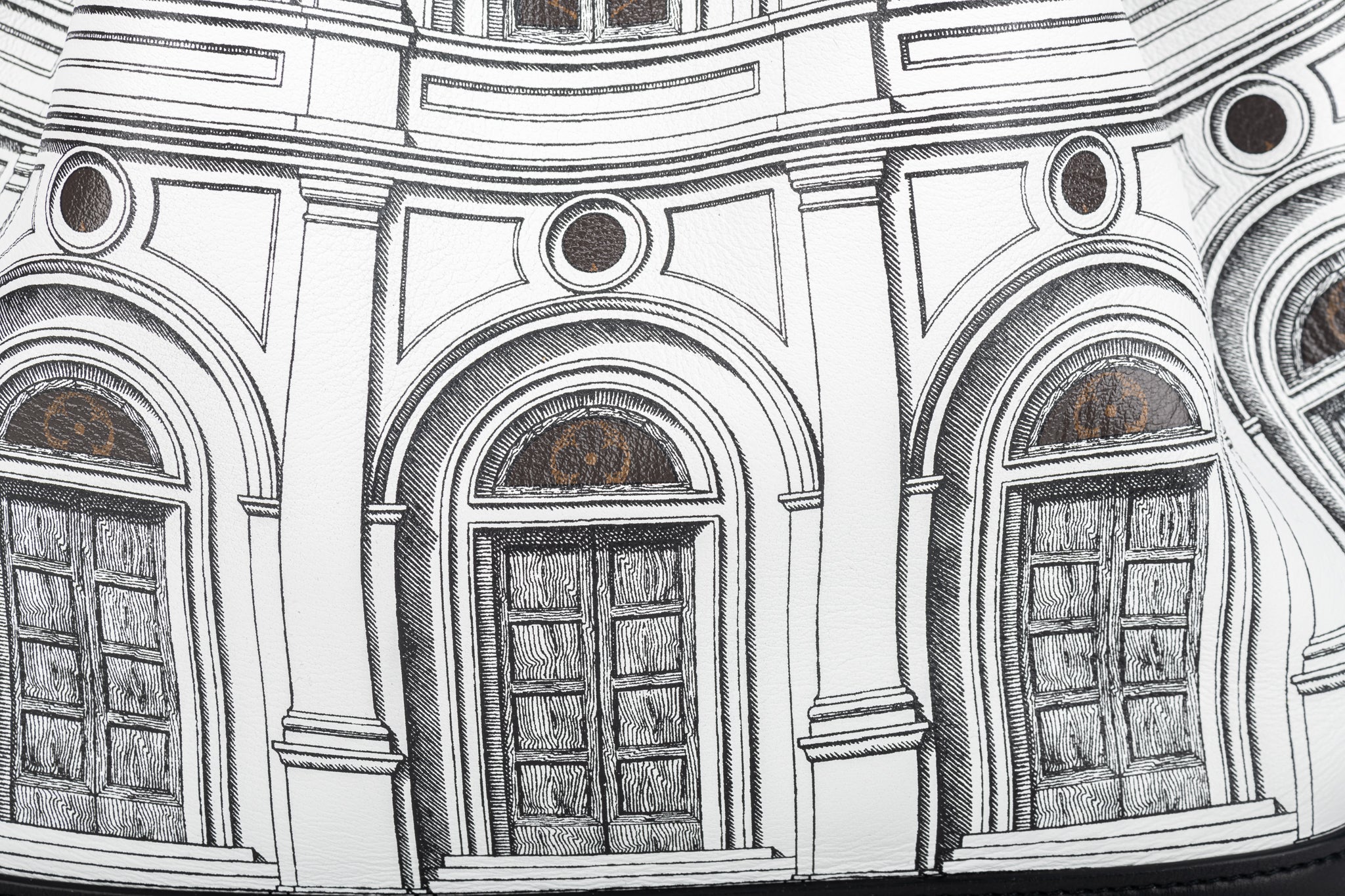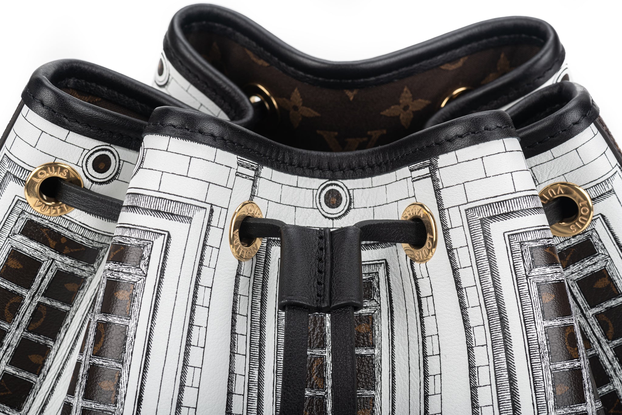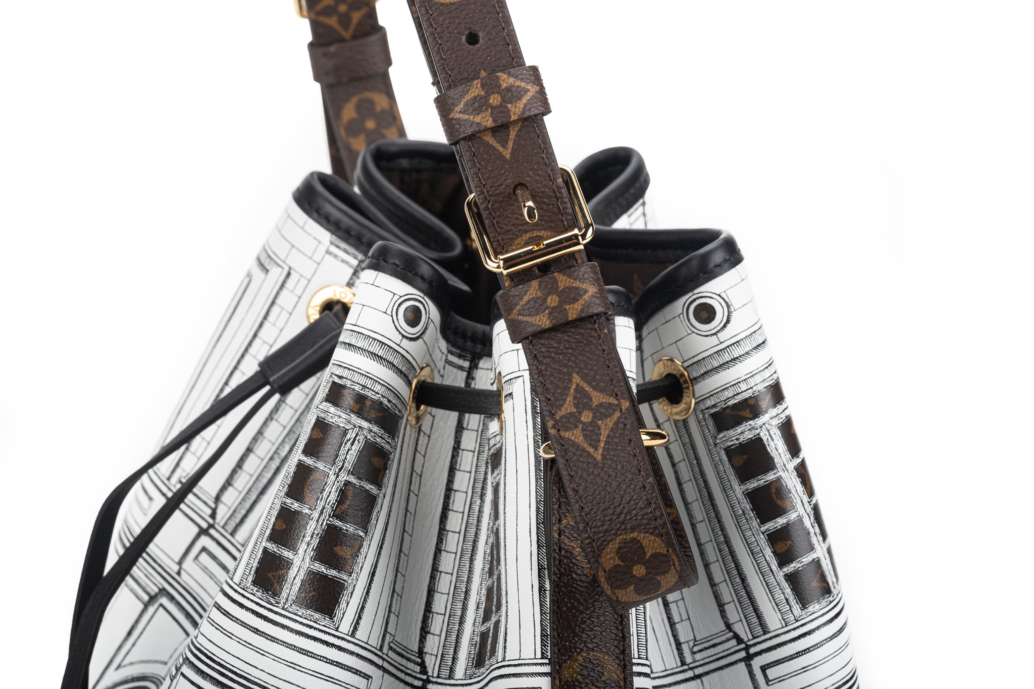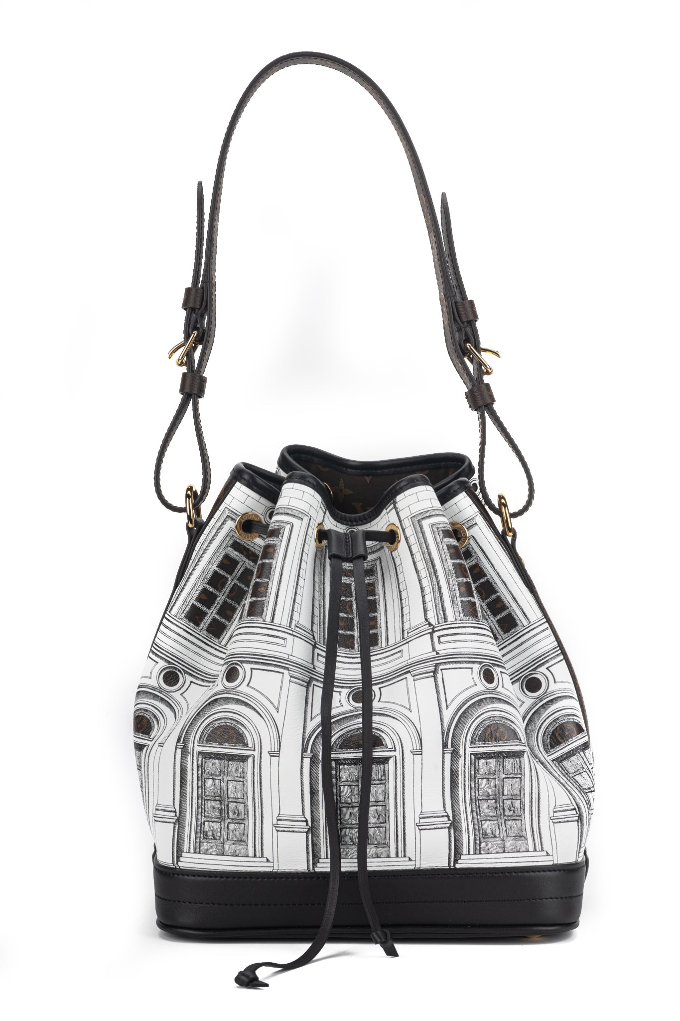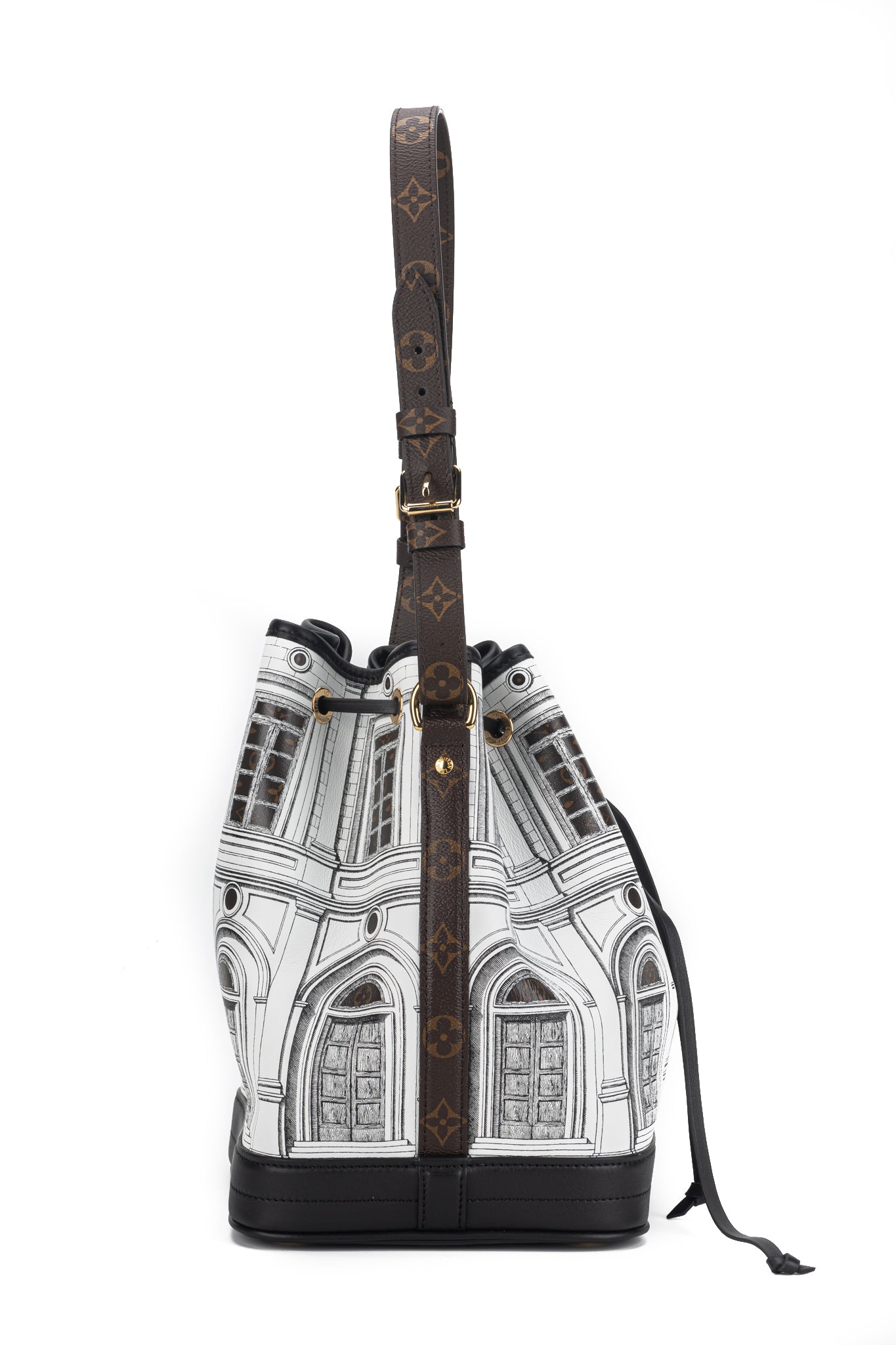 Louis Vuitton X Fornasetti Calfskin Monogram Architettura Noe NM in Black and White. This shoulder bag is a collaboration between Louis Vuitton and Fornasetti. The bag features a building print and Monogram coated-canvas trim and adjustable shoulder bag with polished gold hardware.