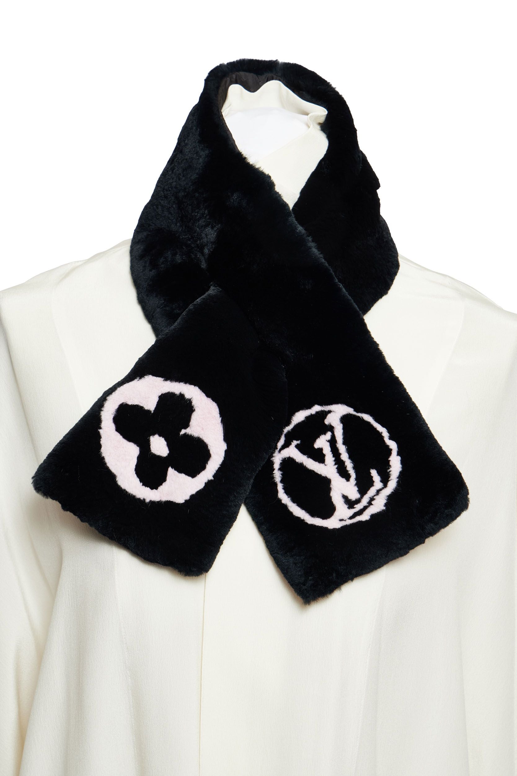 Louis Vuitton black rabbit scarf with pink logo. Characteristic Vuitton interlaced closure. Super soft neck warmer.