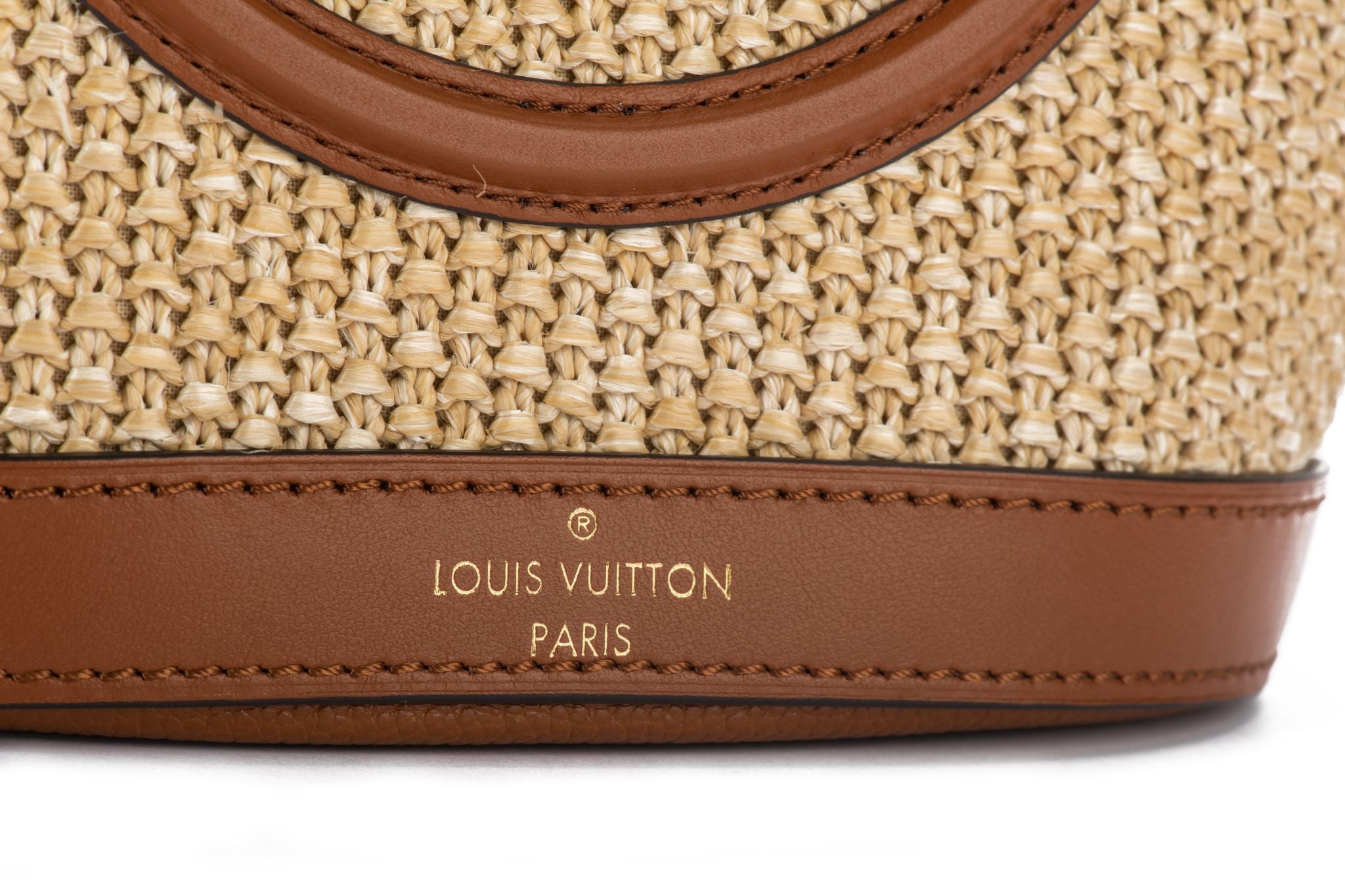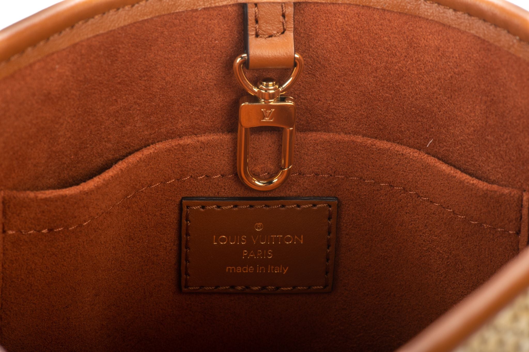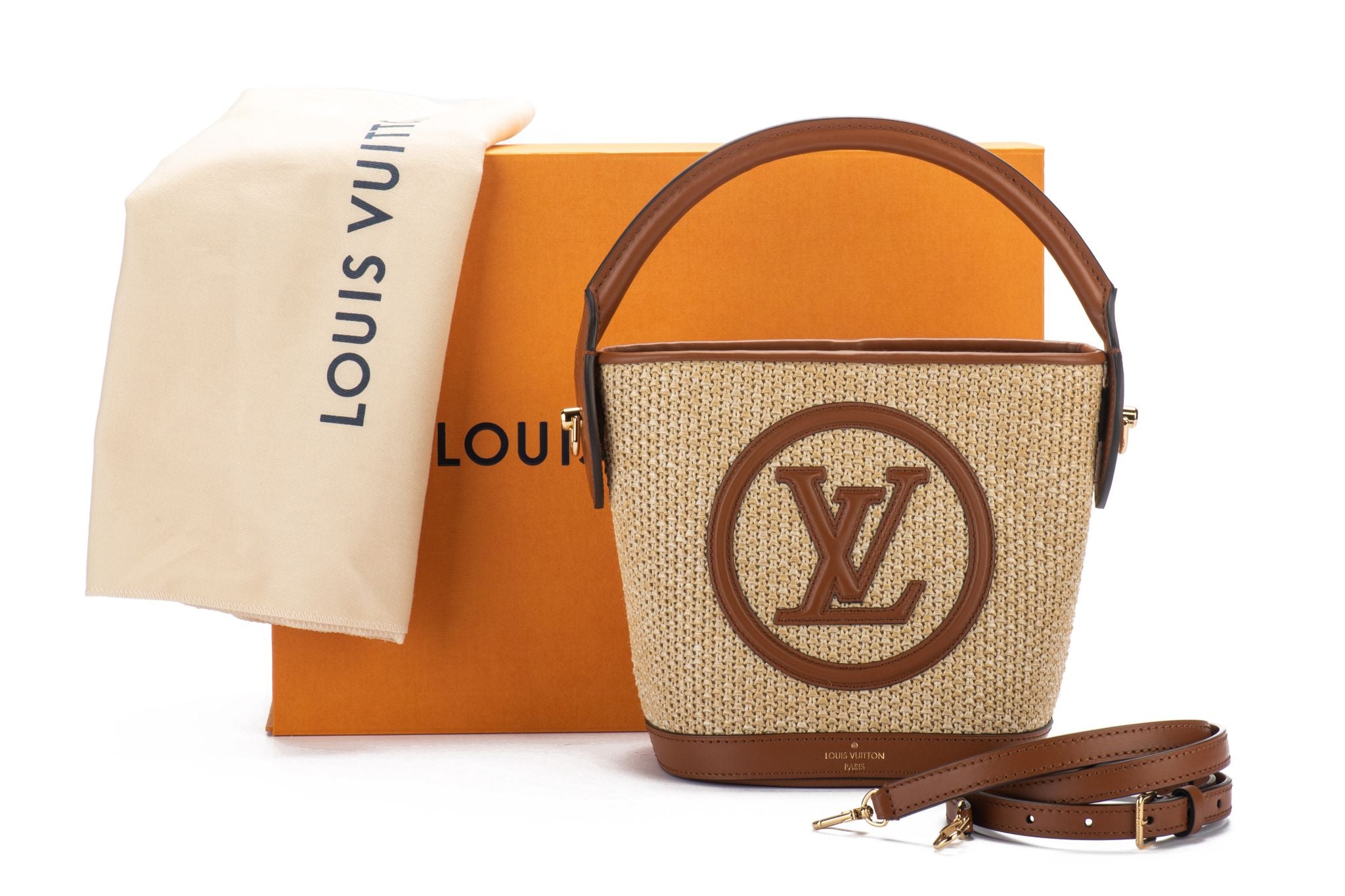 Louis Vuitton sold out worldwide petit bucket tote. Raffia bag with caramel leather trim. Handle drop 4.5". Shoulder drop 20" adjustable. Comes with original dust cover and box.
