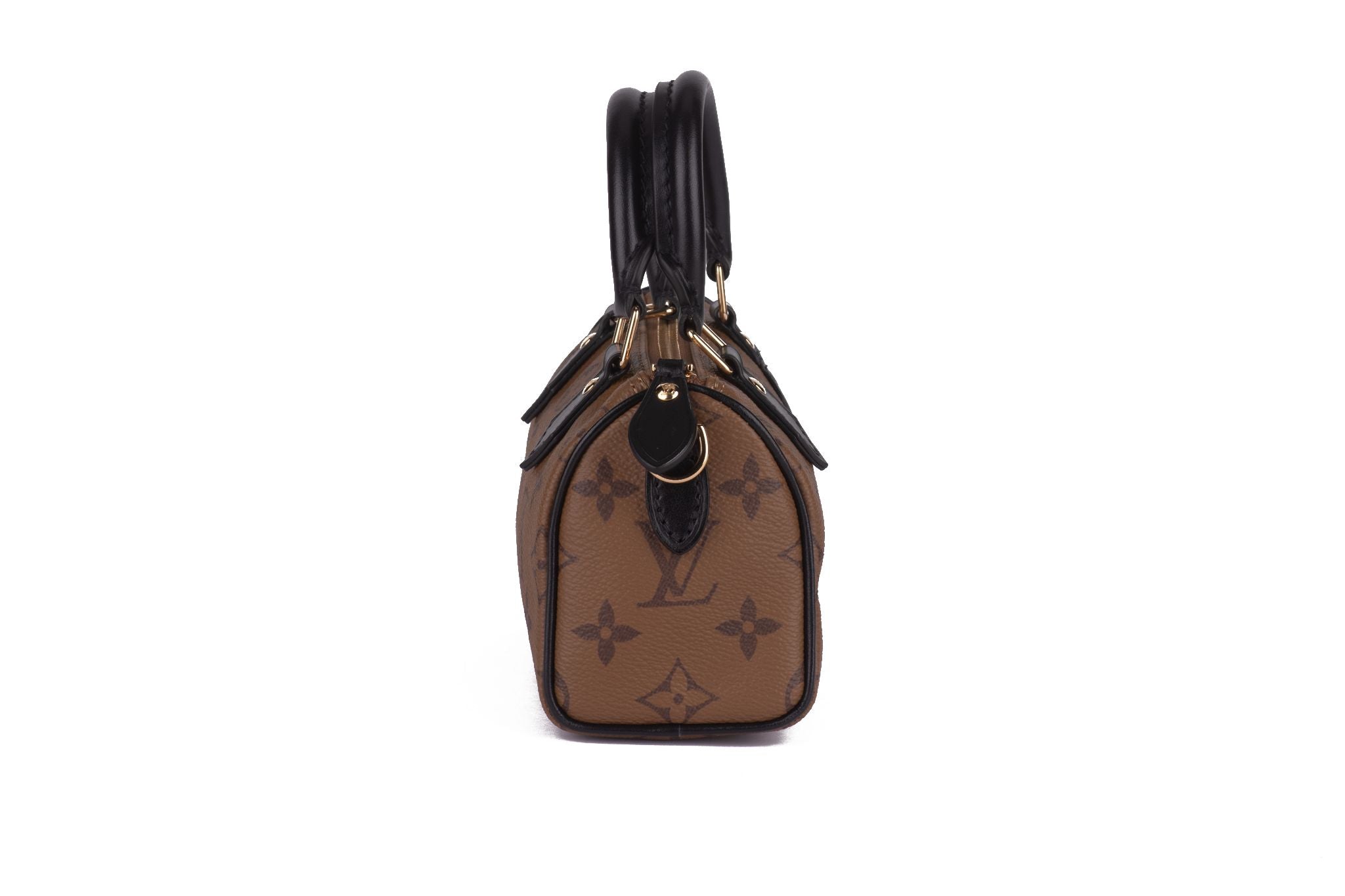 This exclusive Nano Speedy bag is part of a collaboration between the artist Sun Yitian, known for her colorful paintings of mass-produced toys, and Louis Vuitton Artistic Director Nicolas Ghesquière. Crafted from Monogram Reverse canvas, it features a calf-leather patch of a cute black and white dog. This playful, collectible piece comes with a red lining, relying on the background of the original artwork, and a removable shoulder strap. Brand new with original dust cover and box.