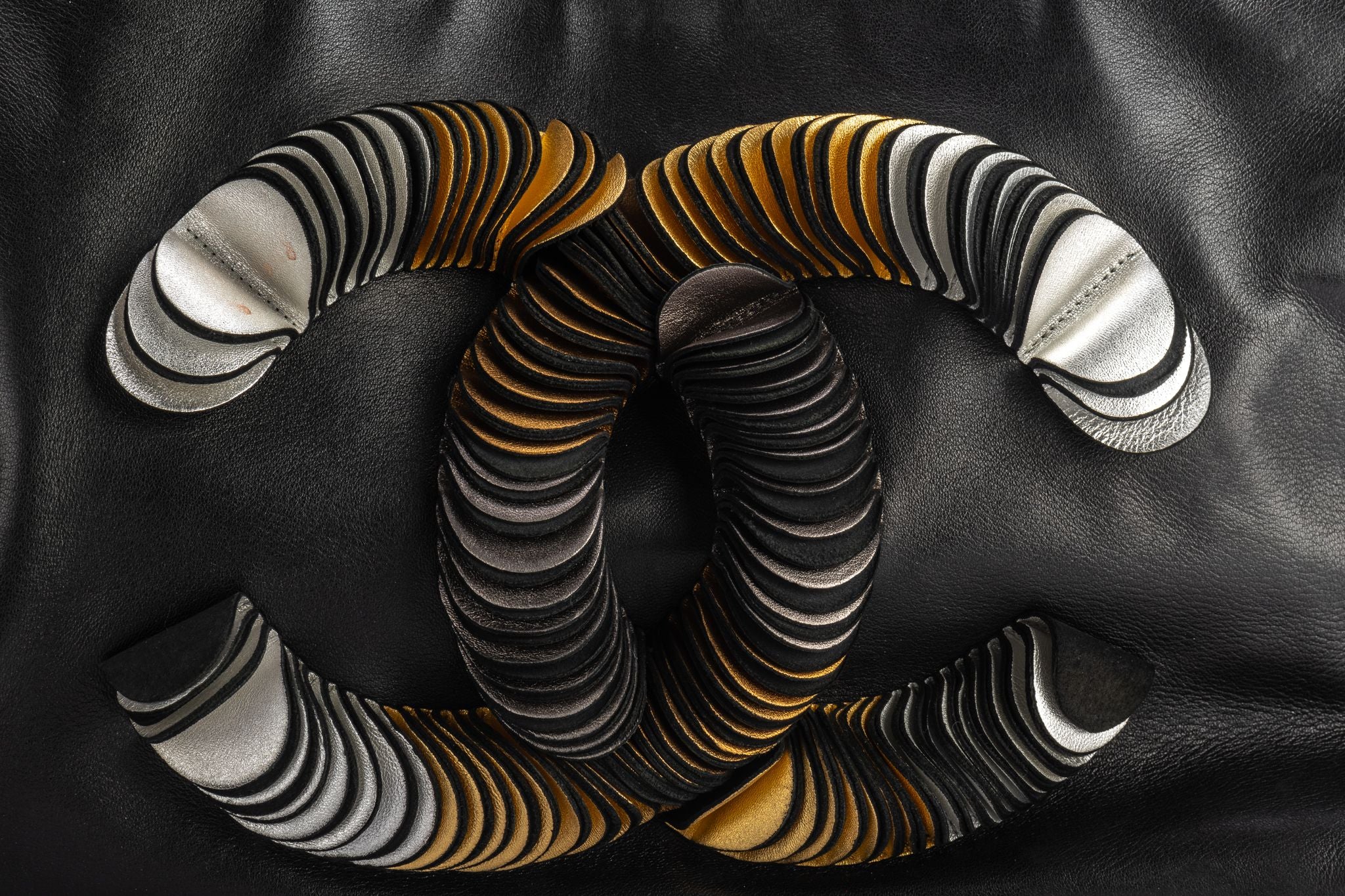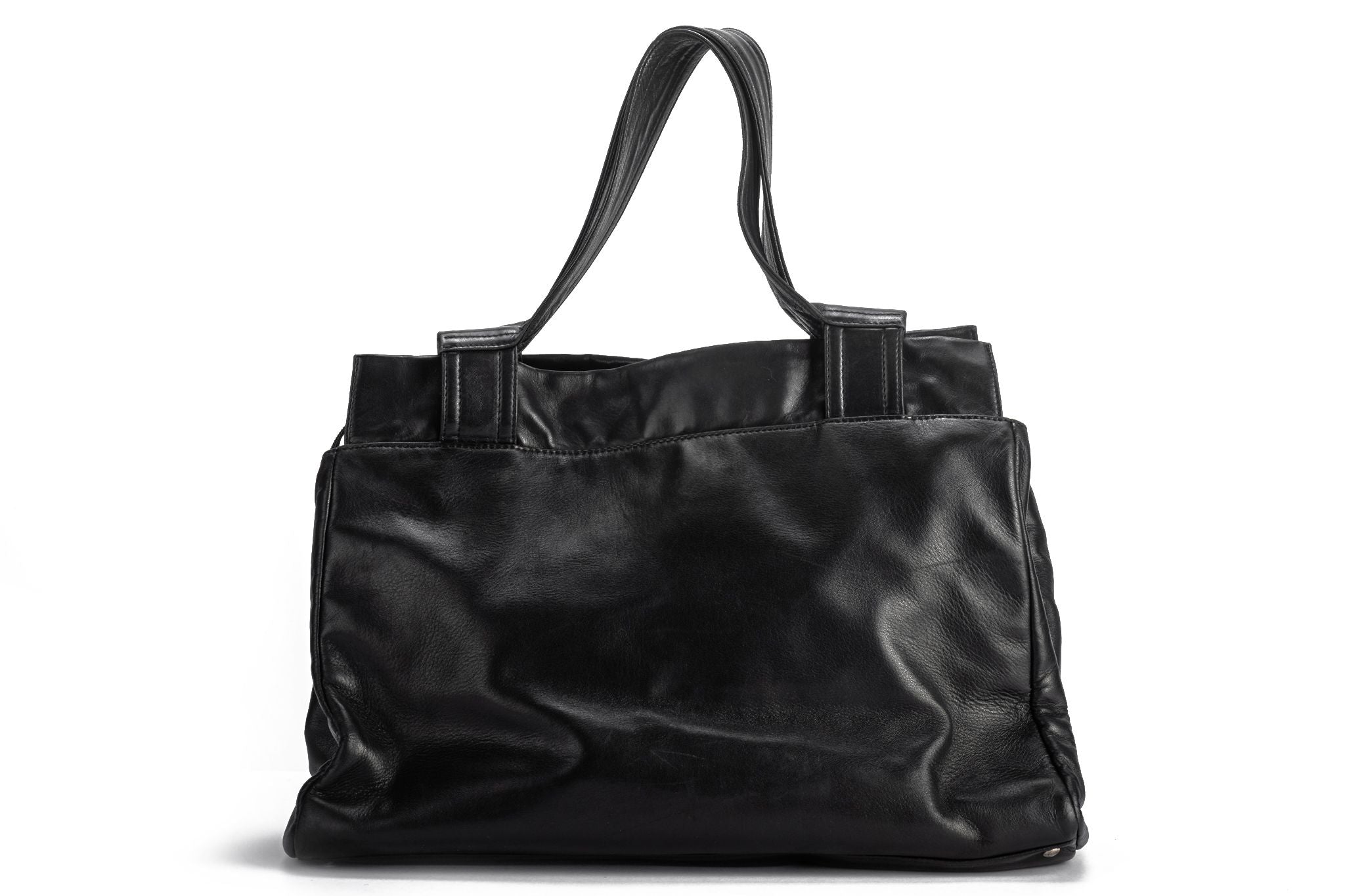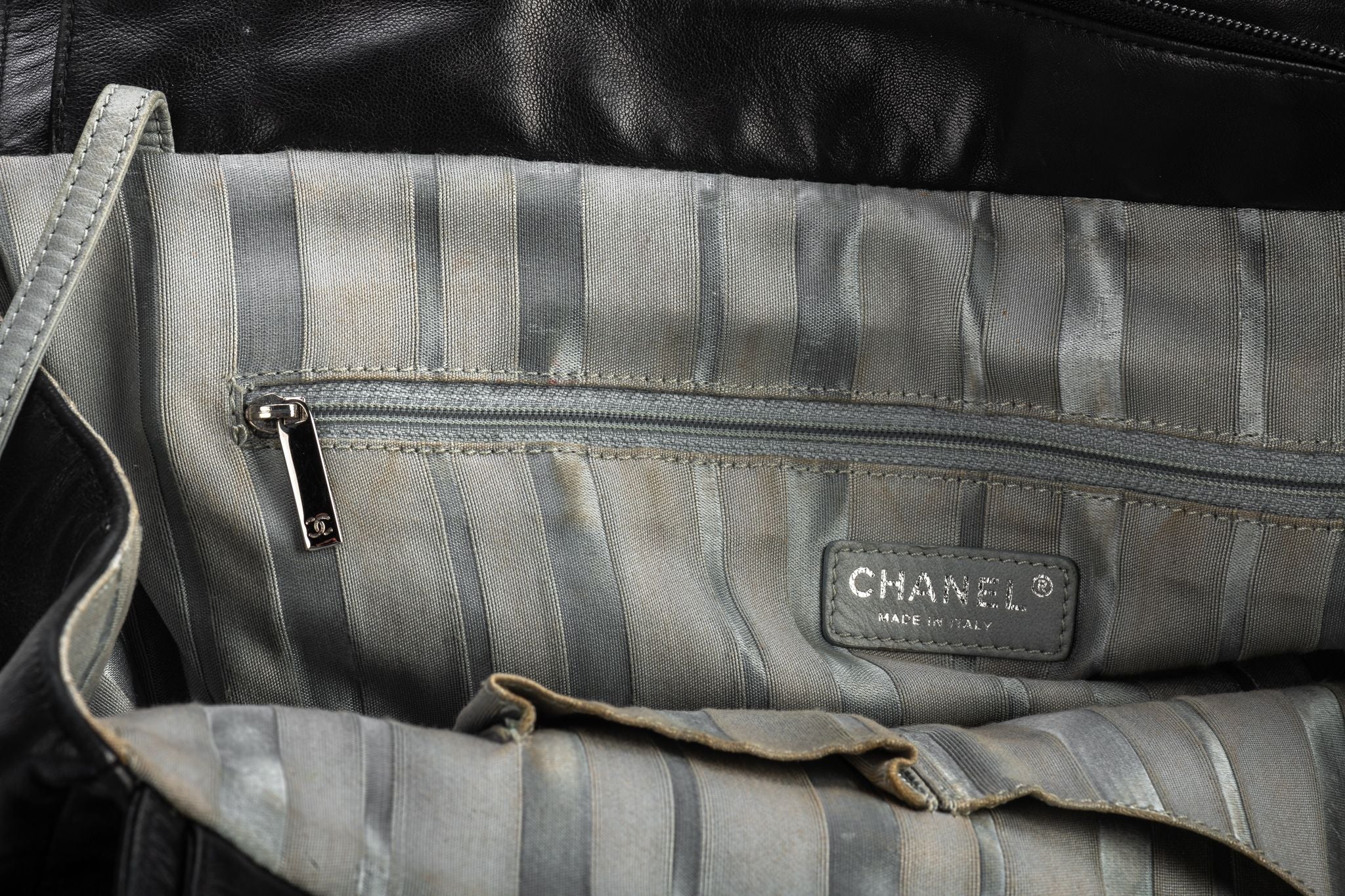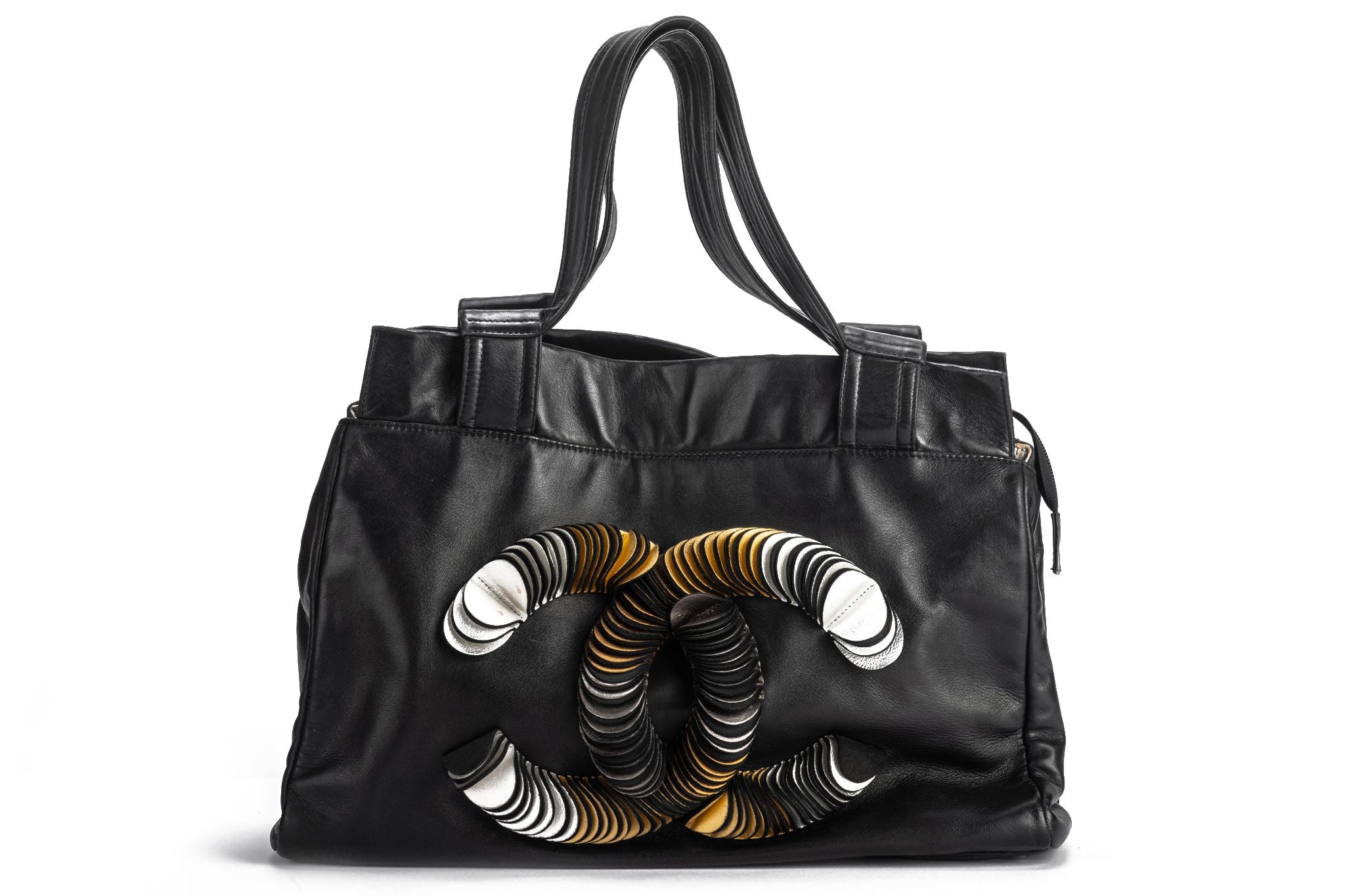 Chanel black Lambskin shoulder tote with gold discs from logo design. Shoulder drop 7”. Collection 12. Comes with hologram and original dust cover.