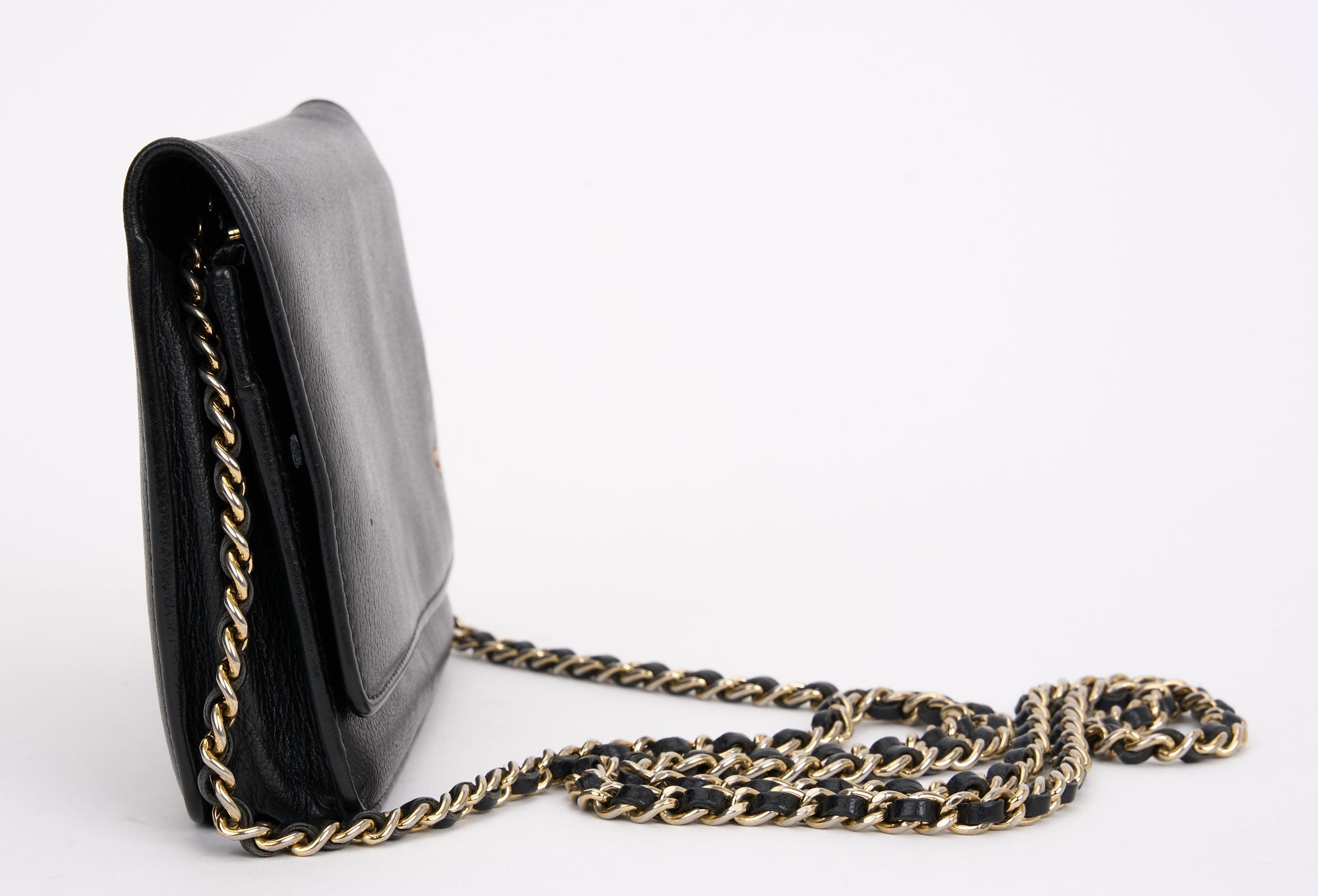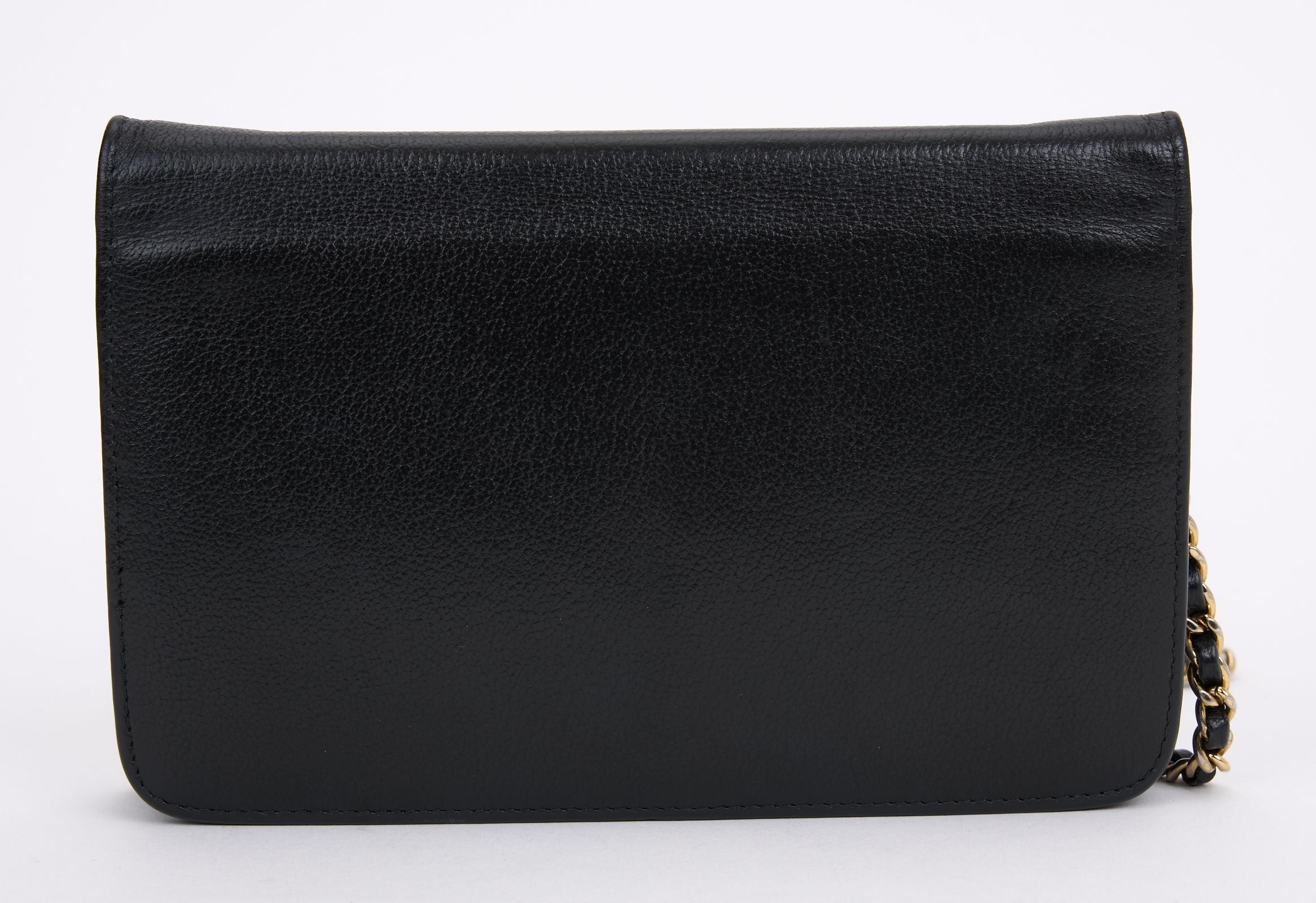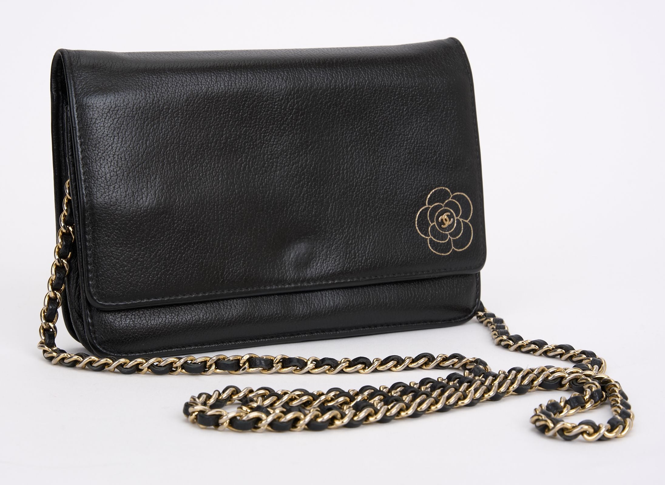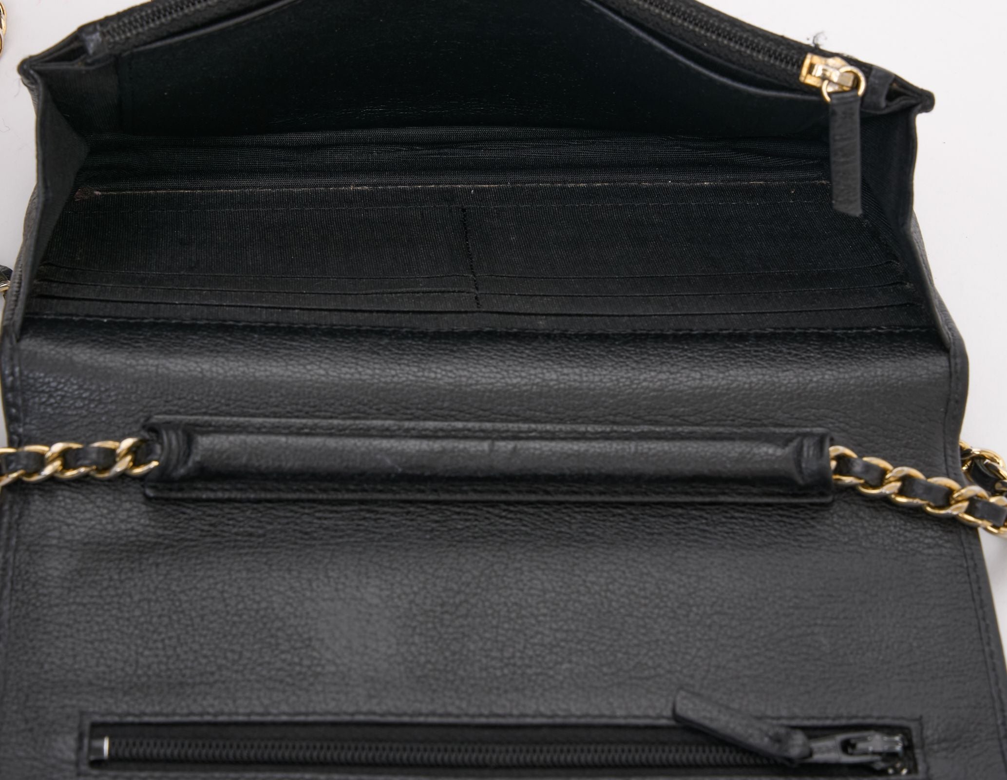 This Chanel Caviar Camellia Wallet on Chain Gold-tone hardware features black leather with CC flower logo at the front, a single chain-link and leather shoulder strap, leather under flap, black fabric lining, a single zip pocket at the front flap, three compartments inside, one with zipper, six internal card pockets and pin-lock closure at the front.