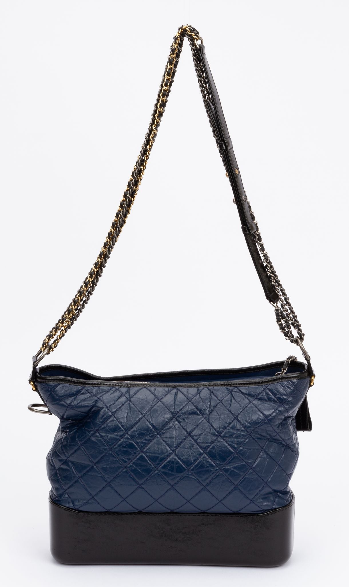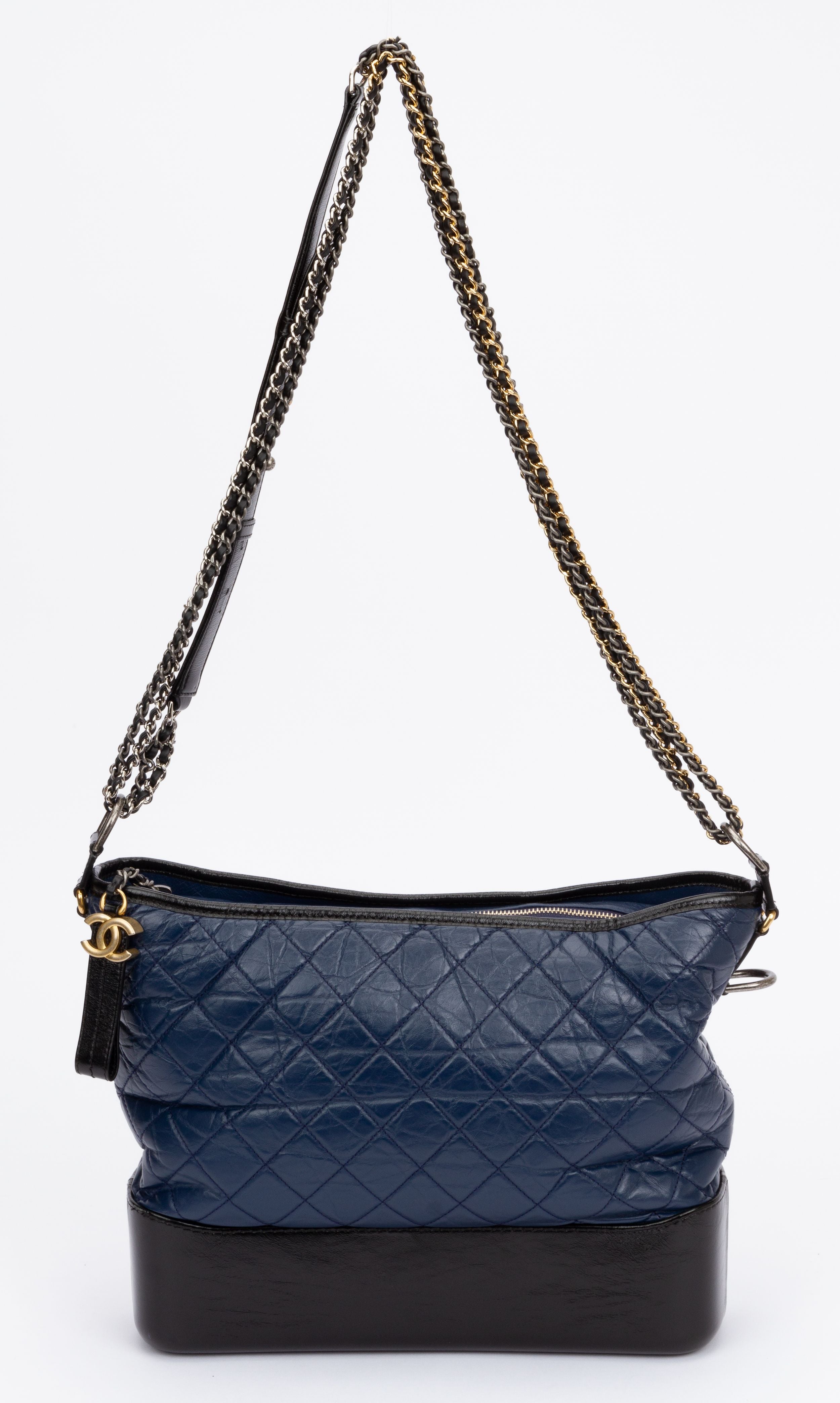 Chanel large Gabrielle bag in black and blu leather combination. Gold and ruthenium hardware. Shoulder strap drop 18.5" / 29". Collection 24. Includes key ring, hologram and original dust cover.