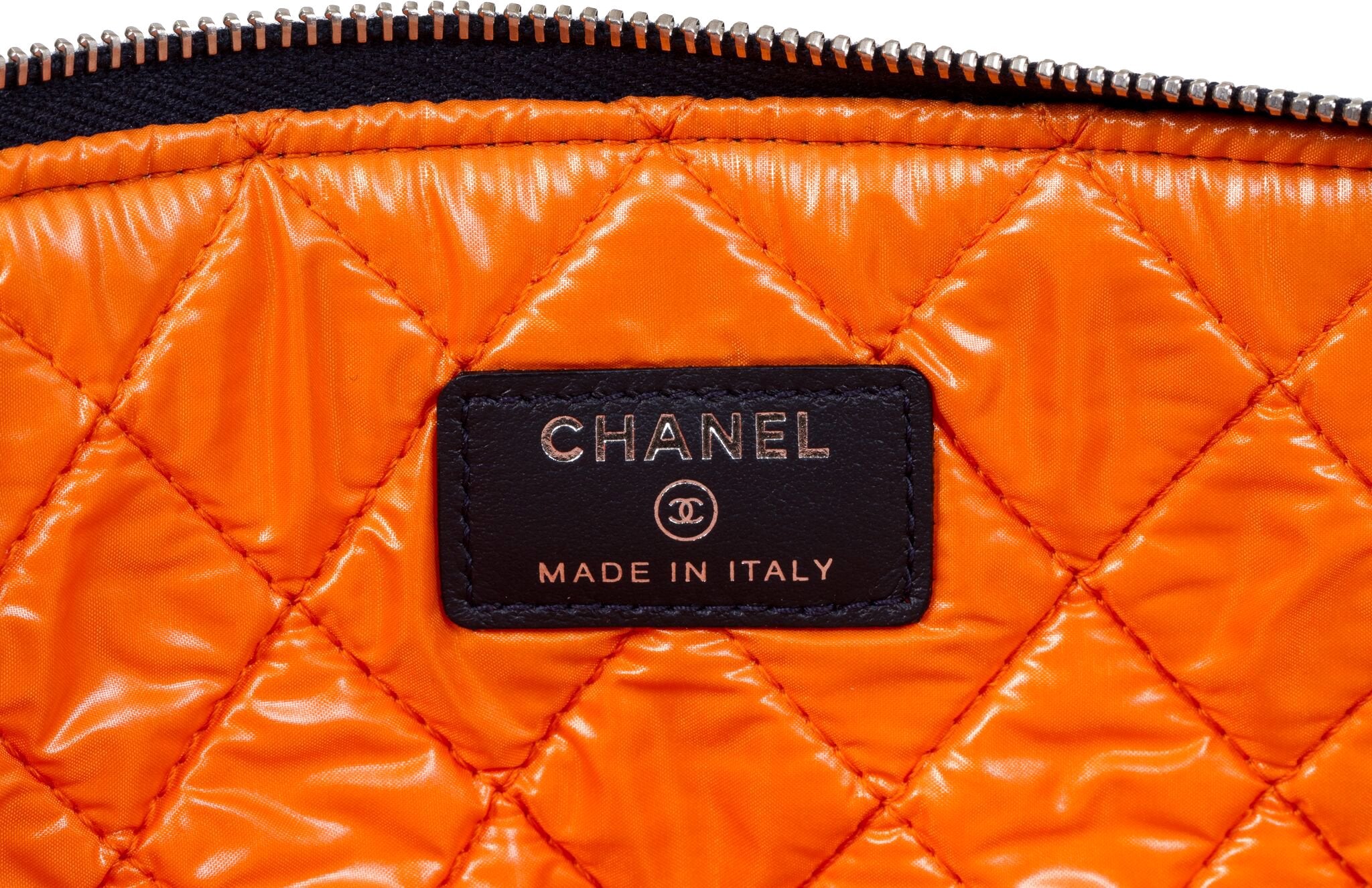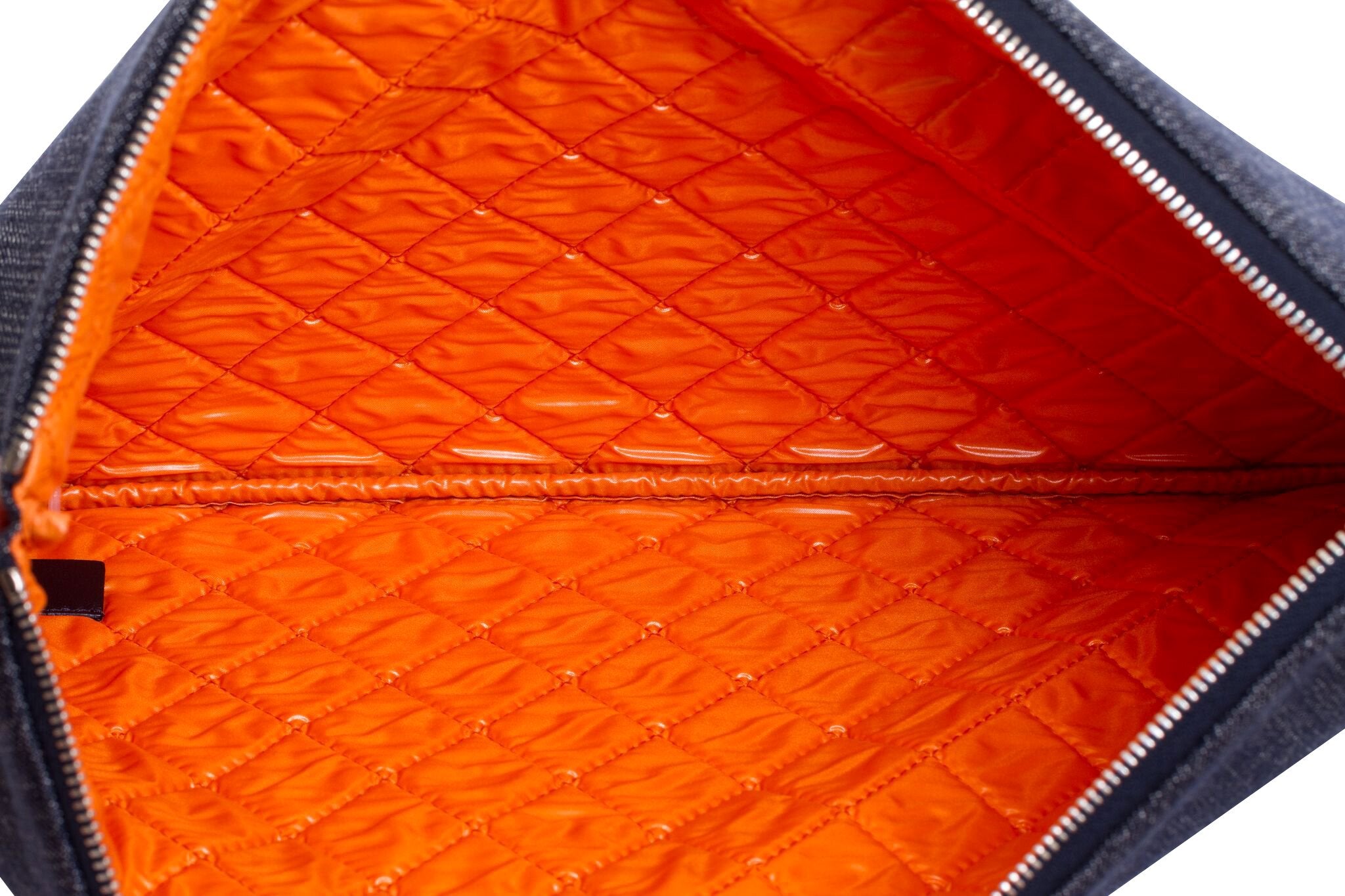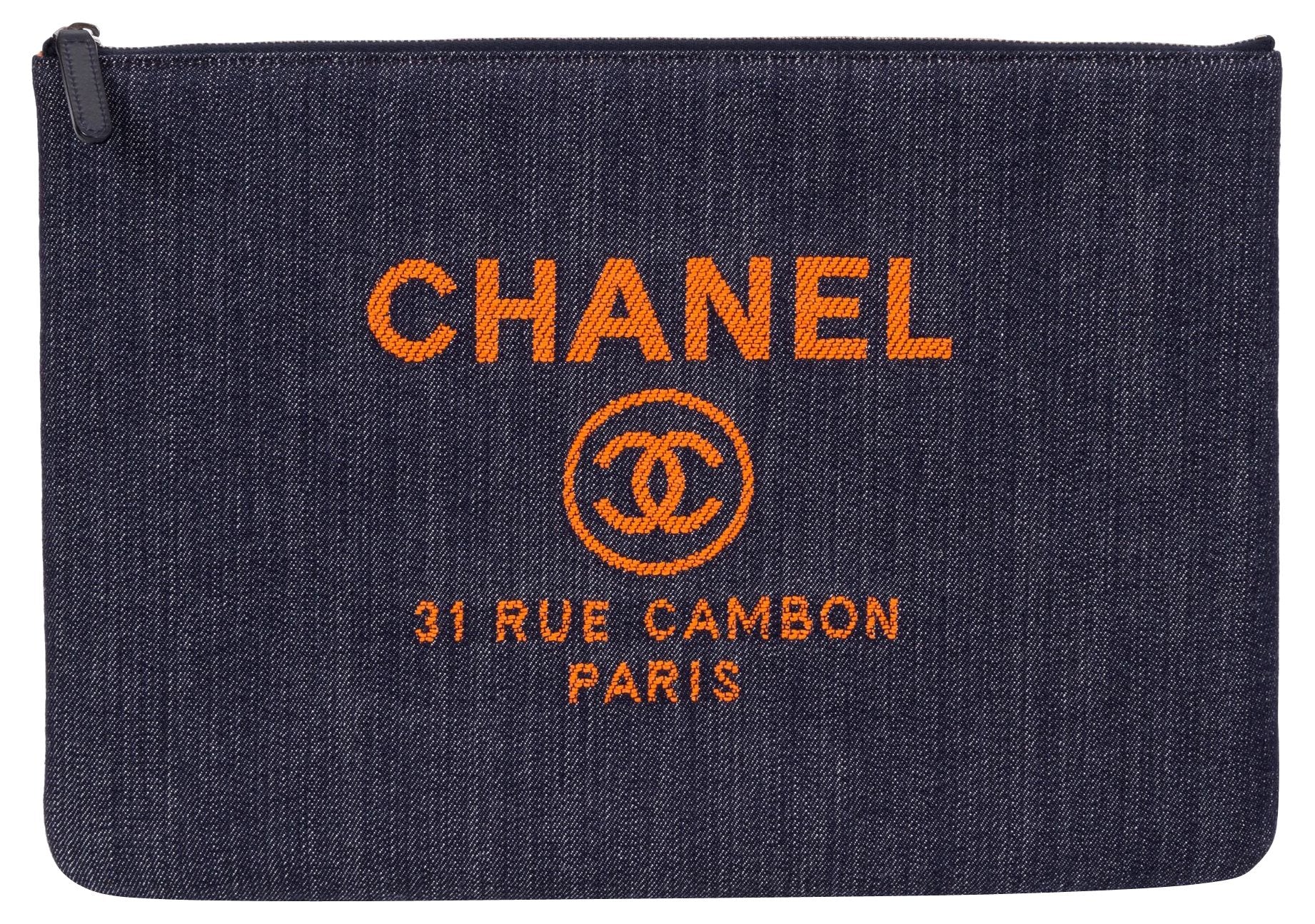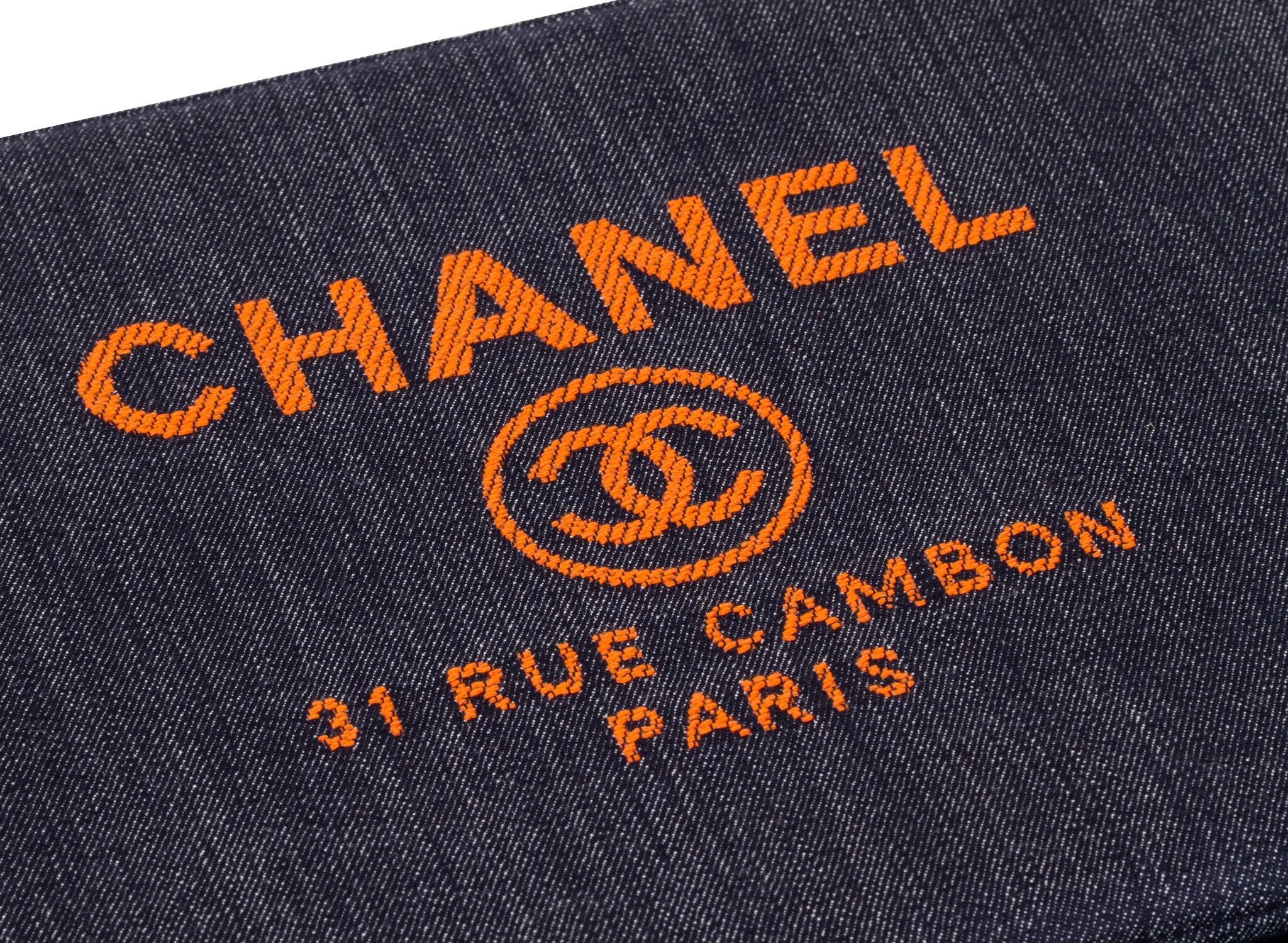 Chanel large denim clutch with orange signature logo and Chanel address. Spring 2017 collection. New in box with hologram, ID card, booklet, dust cover, box, and ribbon.