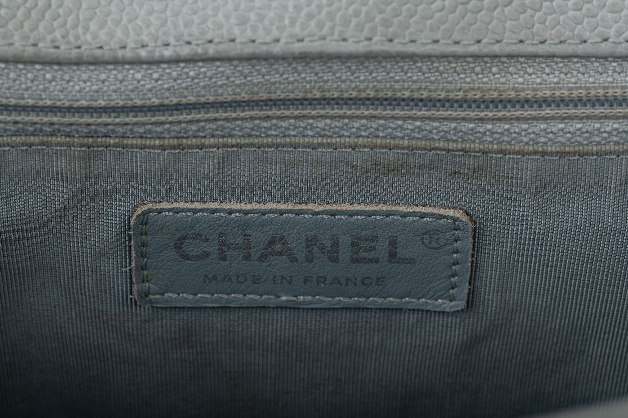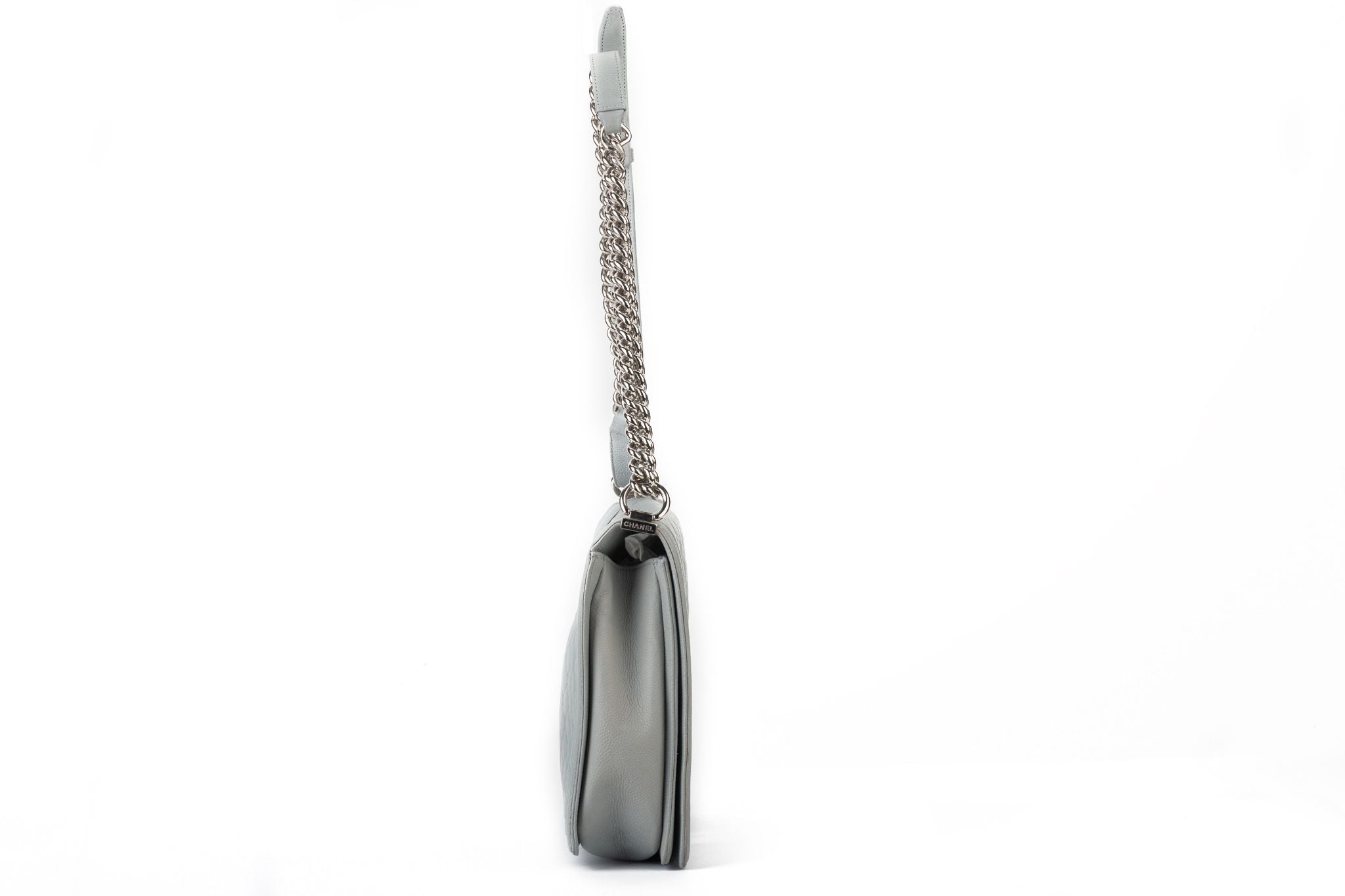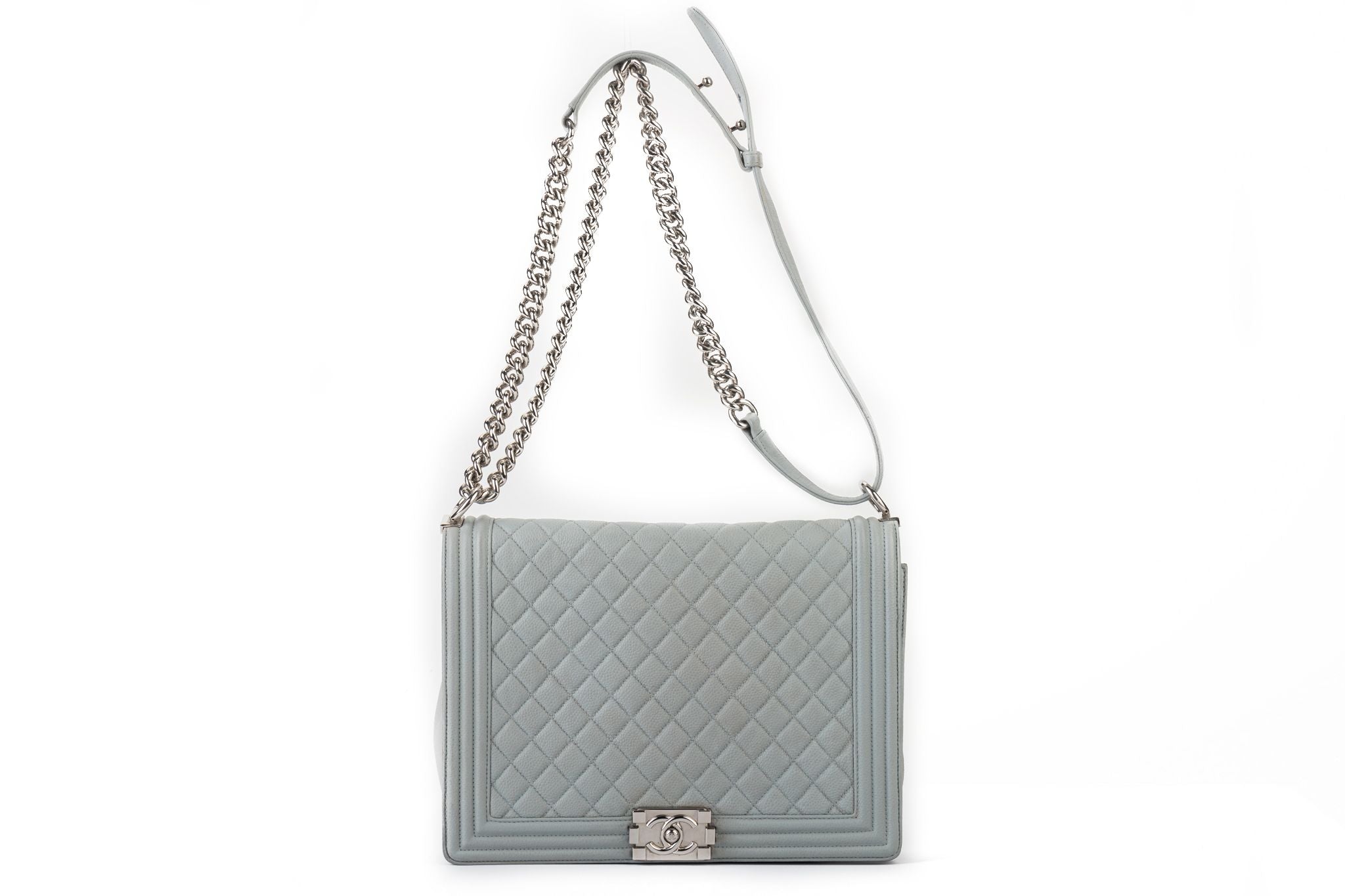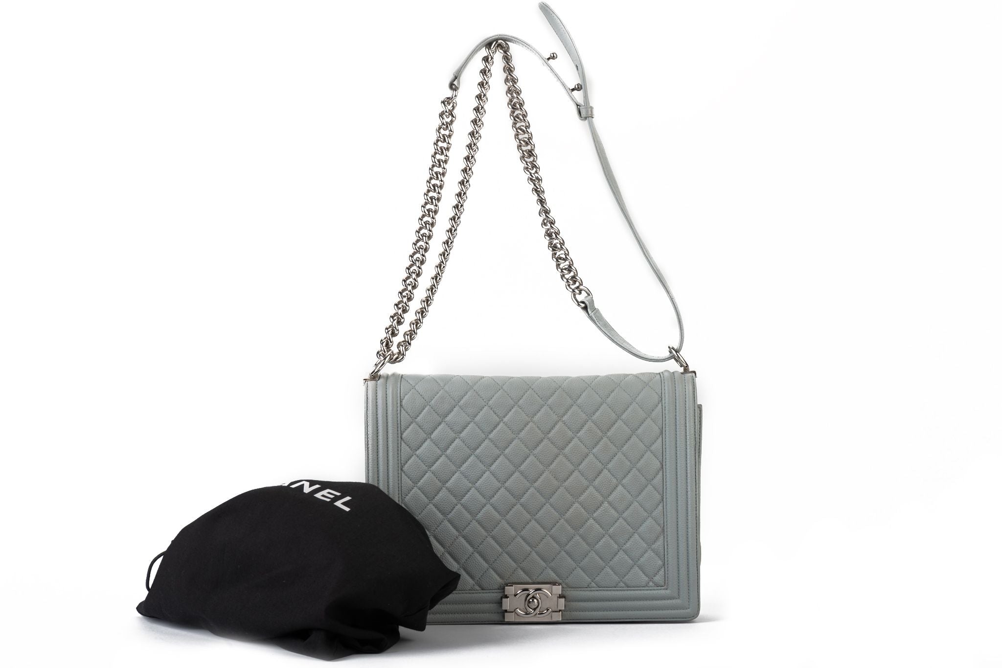 Chanel maxi grey caviar leather boy bag with silver tone hardware. Adjustable strap 20”. Collection 17. Comes with hologram and original dust cover.