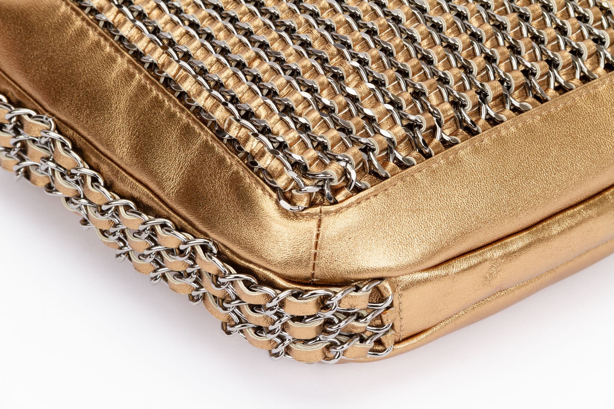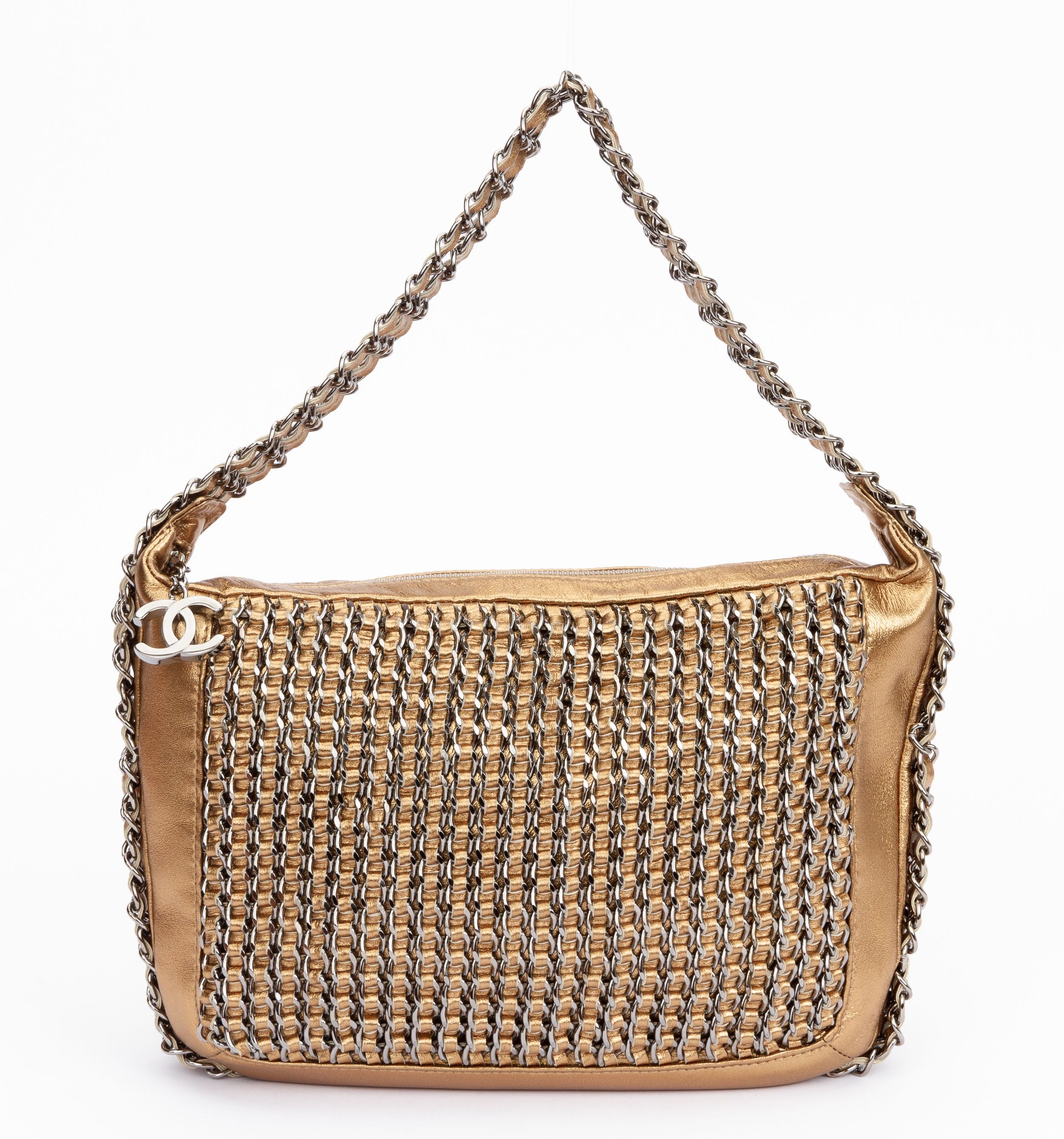 Chanel gold shoulder bag with ruthenium multi chain decoration. Handle drop 7". Comes with hologram and original dust cover. Collection 9.