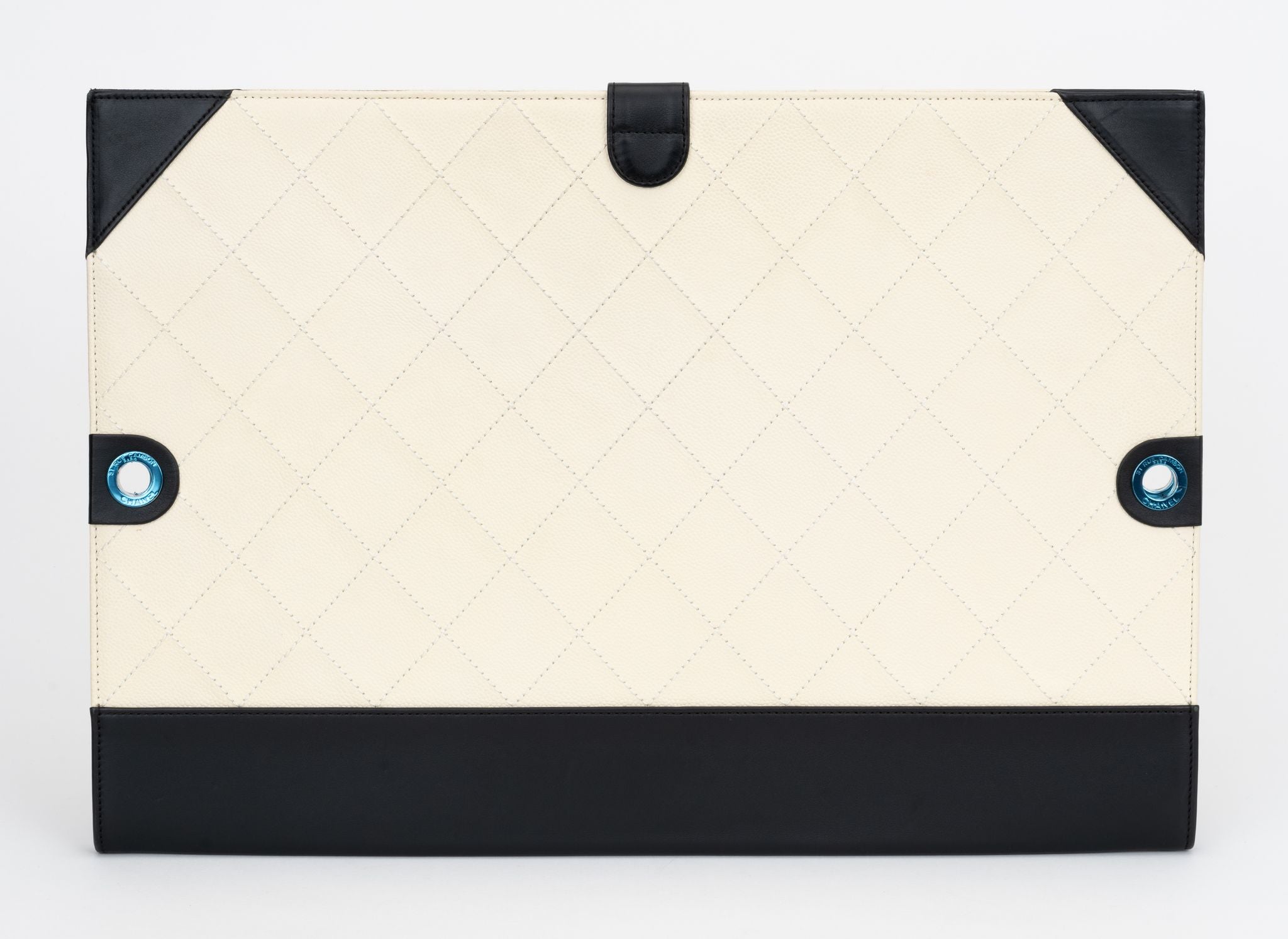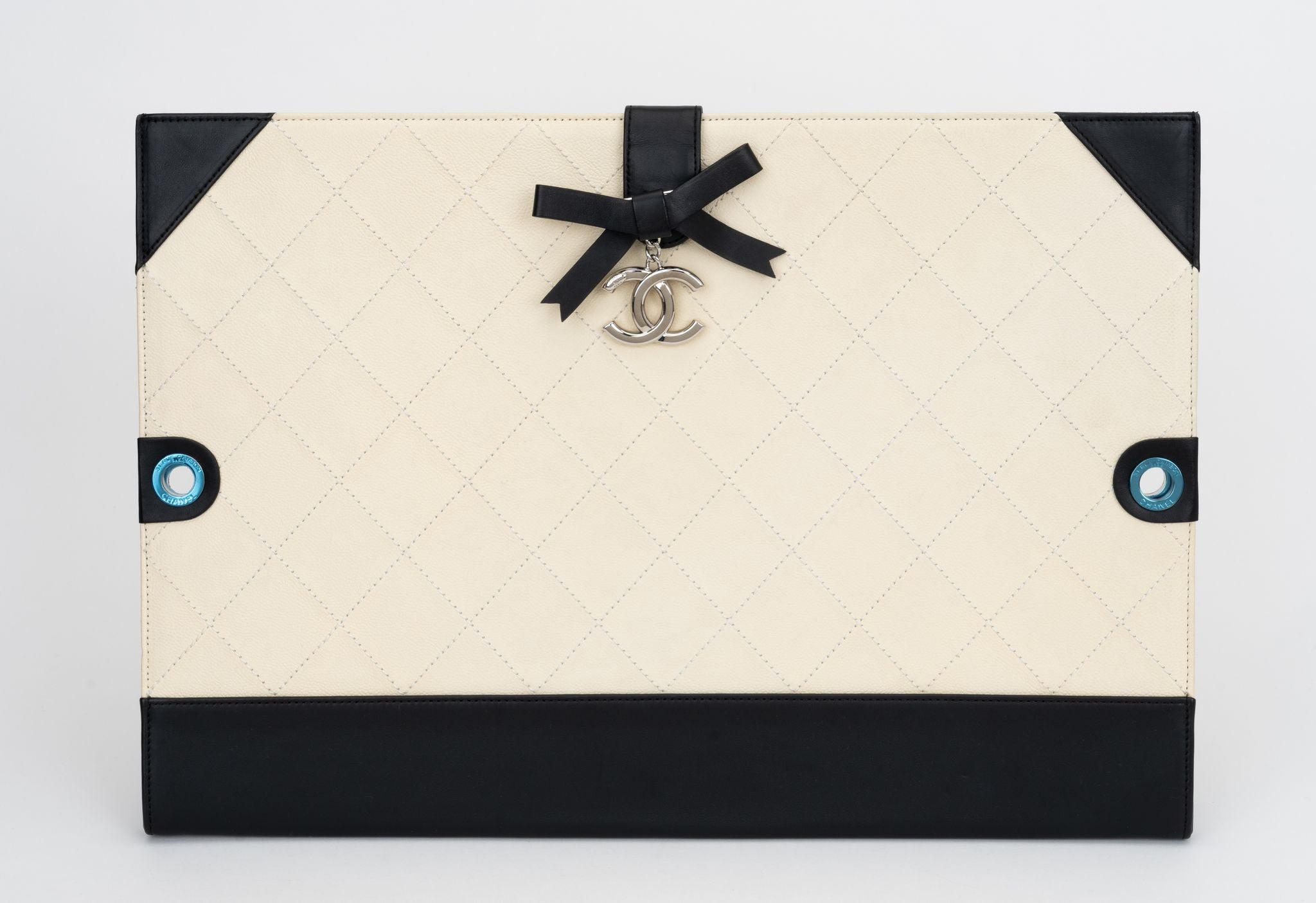 Chanel spring 2014 runway flat quilted portfolio clutch. White leather with black detail and interiors. Silver hardware with plastic on it. Collection 19. Comes with hologram and original dust cover. Photos not included.