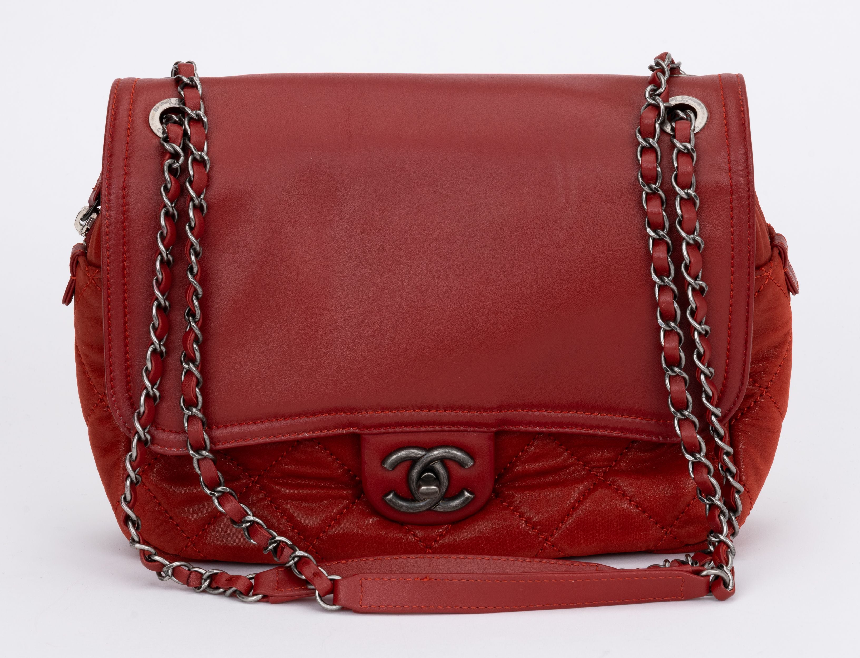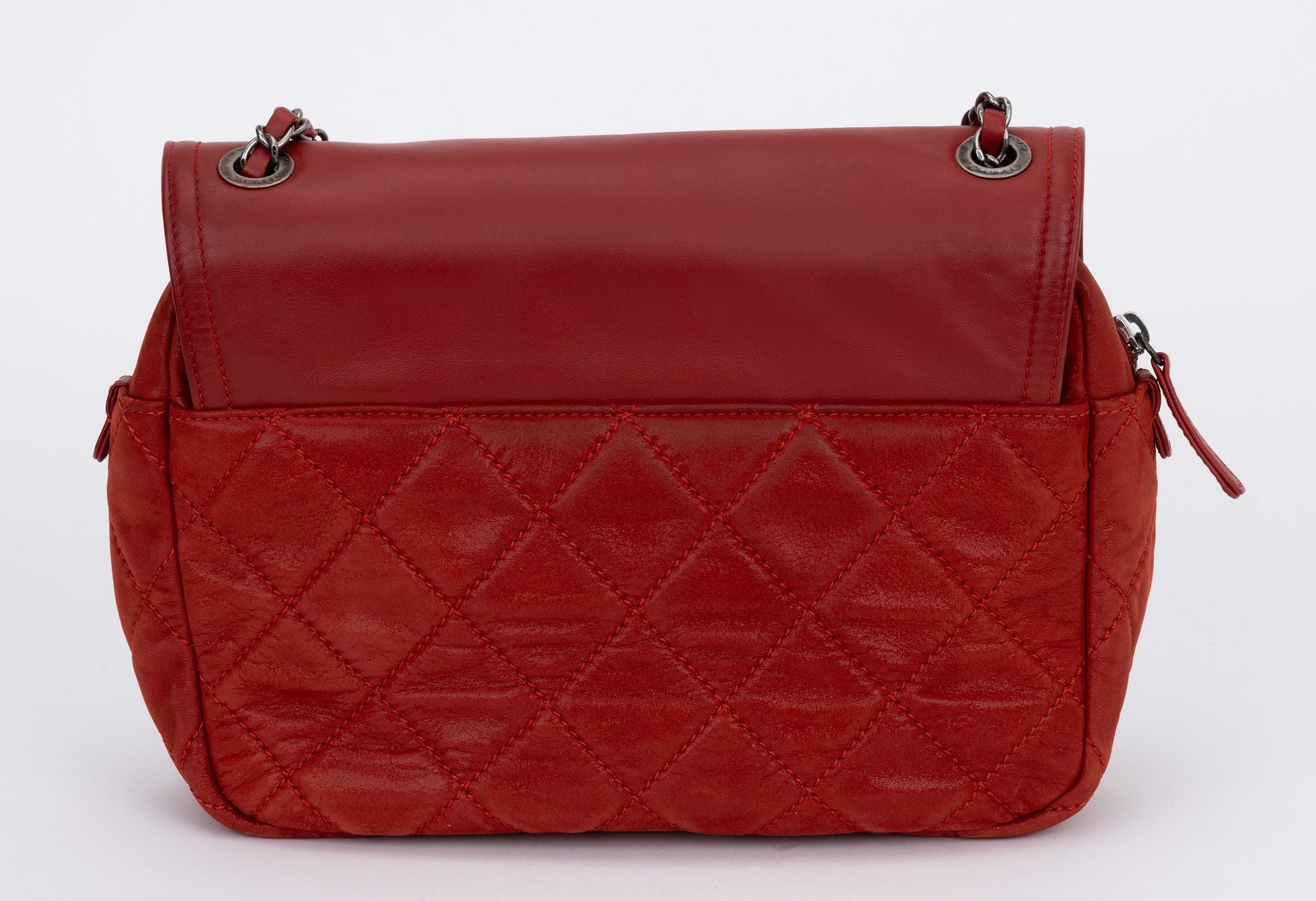 Chanel red brushed leather 2 way shoulder bag. Lower zipped compartment and classic top flap. Shoulder drop 12"/23". Collection 15. Comes with hologram, id card and original dust cover .