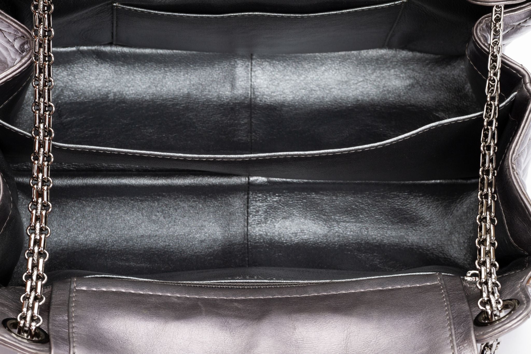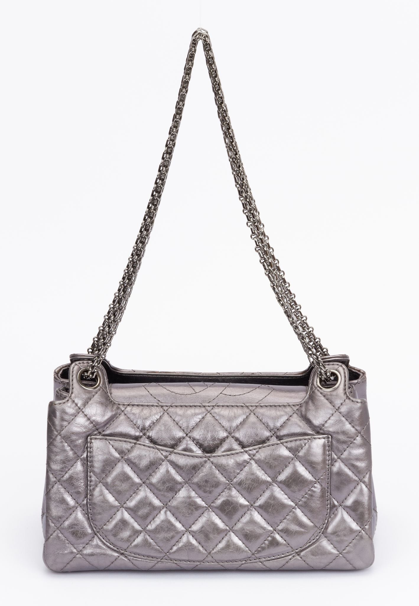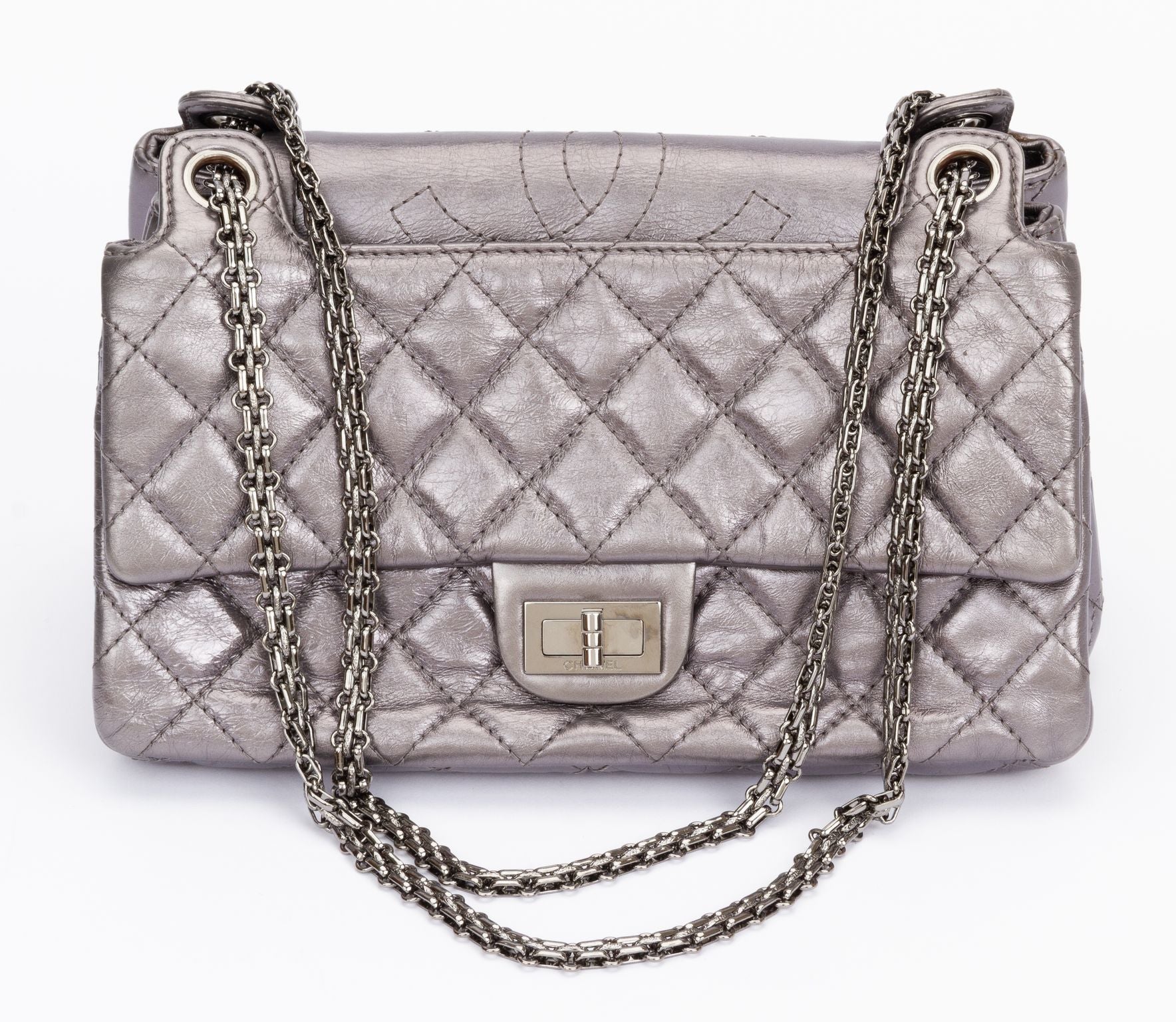 Chanel Reissue Medium Flap bag. The shoulder bag is crafted of quilted calfskin leather in a silver metallic tone. The clasp for closing the back is made of silver hardware and ti be twisted to lock the bag. The chain (11" / 19.5") is also made of silver hardware and is adjustable. The bag includes the hologram, authenticity card and original dust cover. It is in excellent condition. Collection 12
