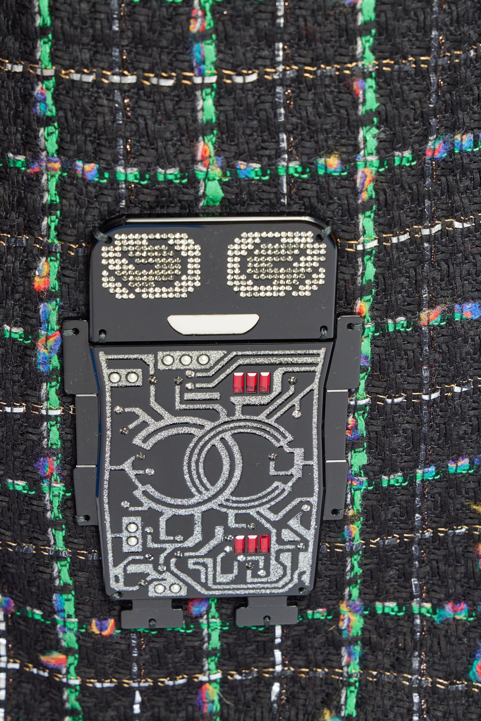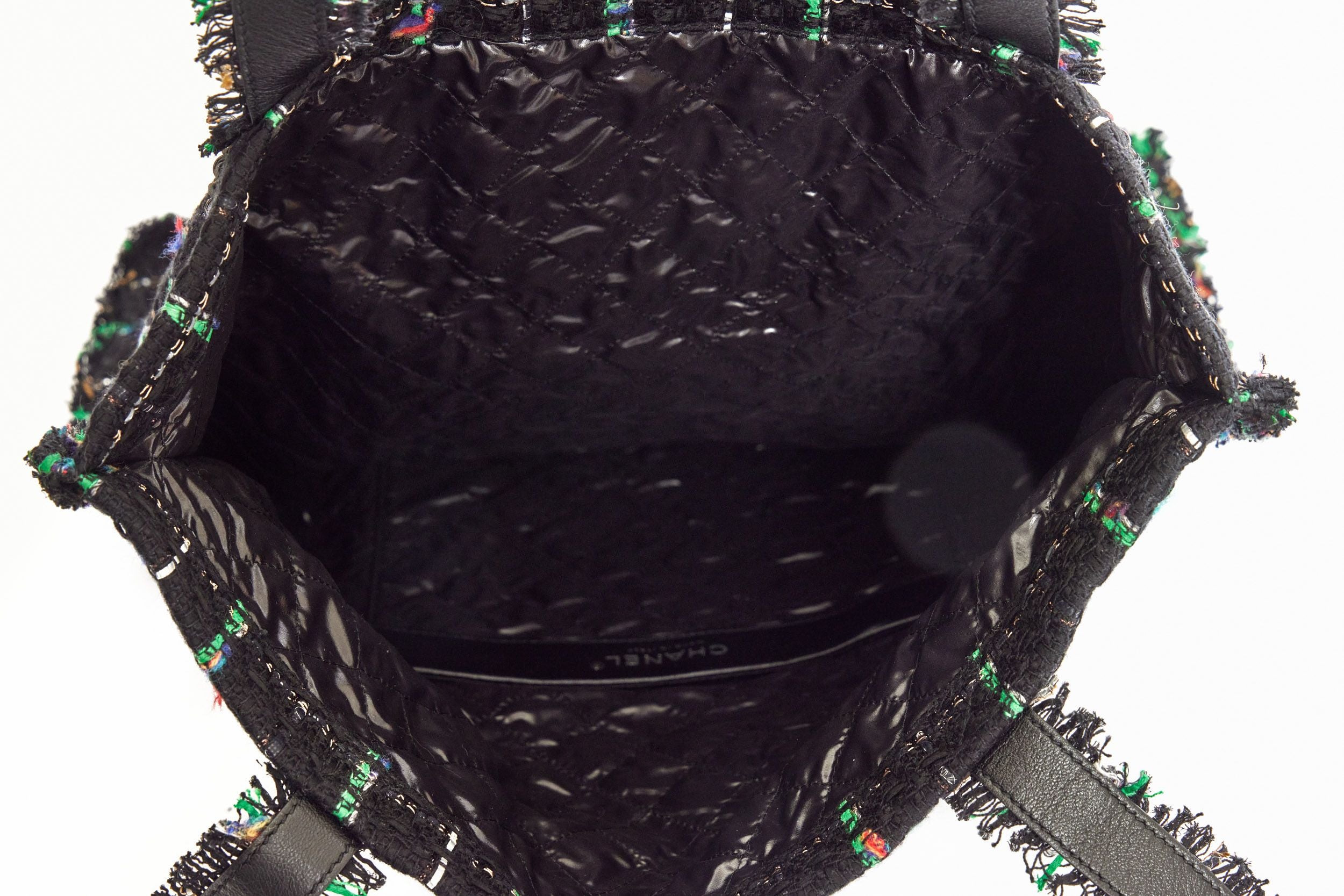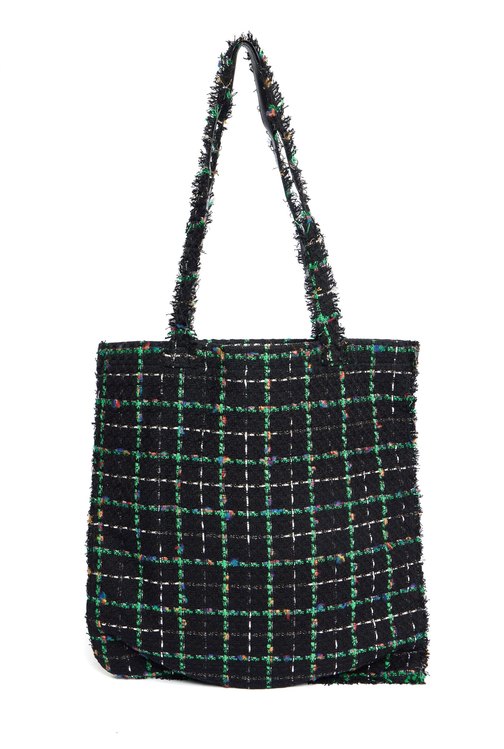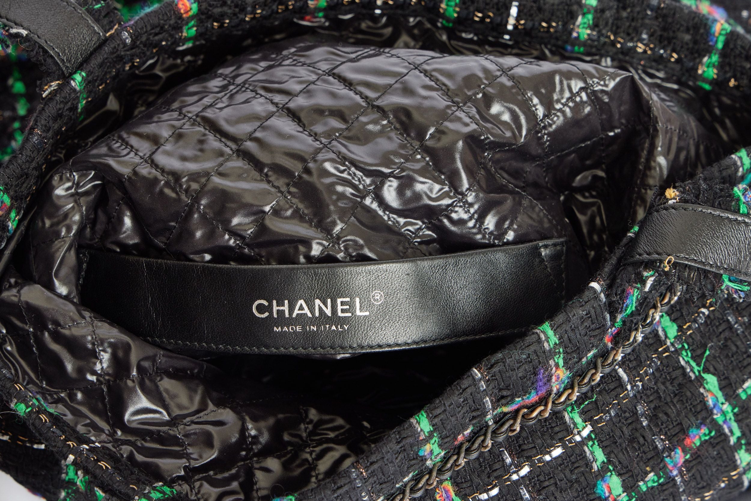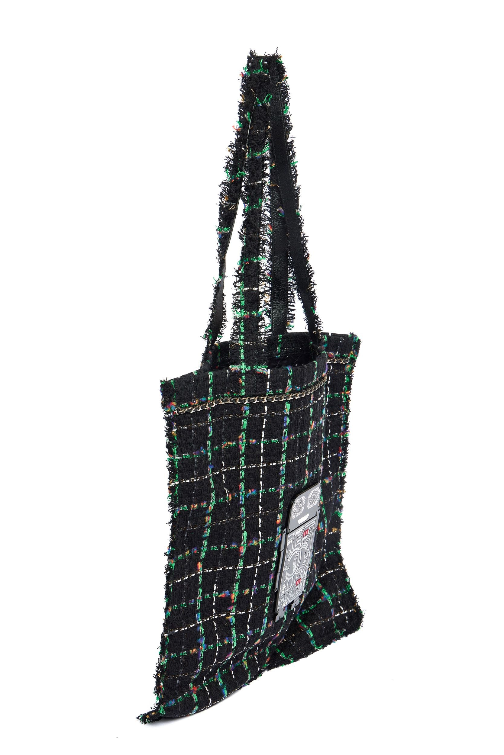 Chanel tote bag from the Robot Collection in black and green weaved tweed. On front of the bag is a robot attached whose body shows a big CC logo and his eyes are made of small rhinestones. The shoulder drop of the tweed and leather strap is 11’. The interior is made out of black PVC and has one pocket. The bag comes with the authenticity card (23, year 2017) is wrapped in paper and packed in the original dust bag.
