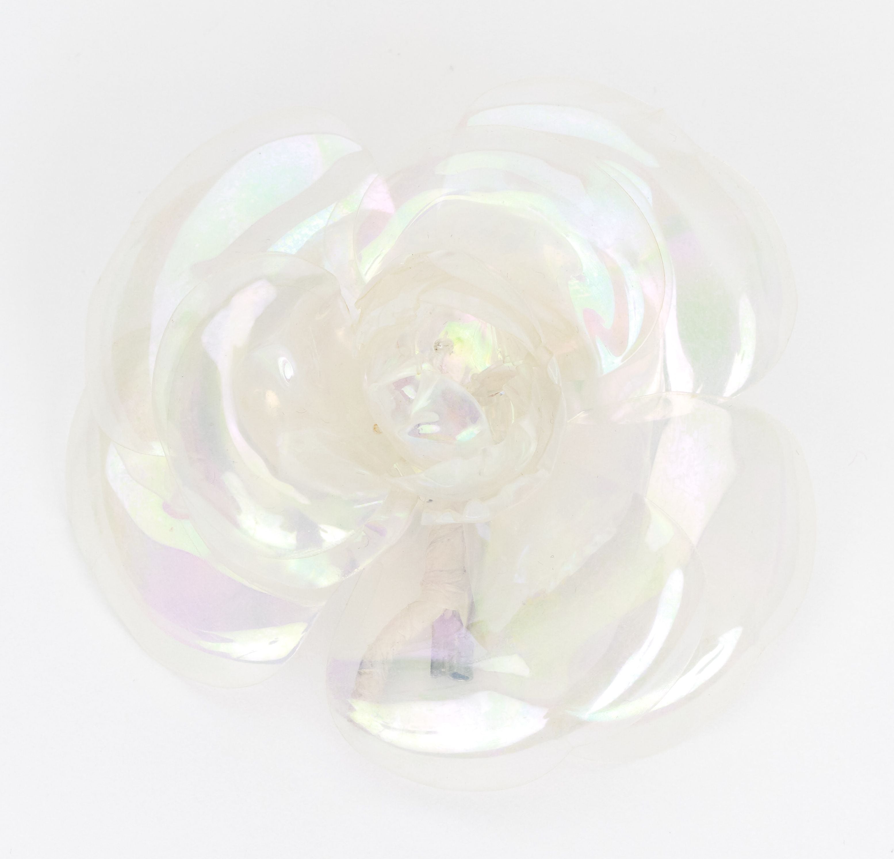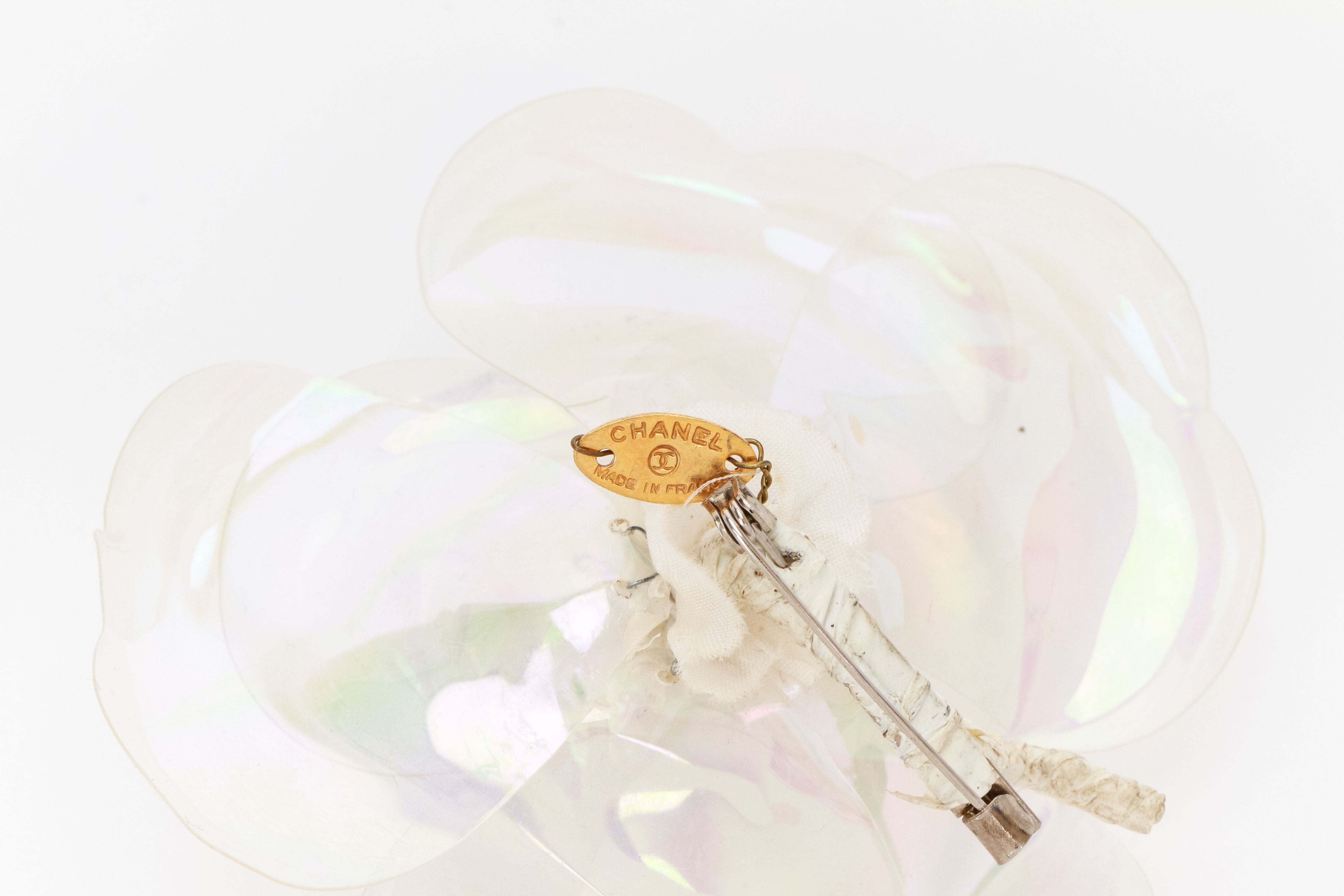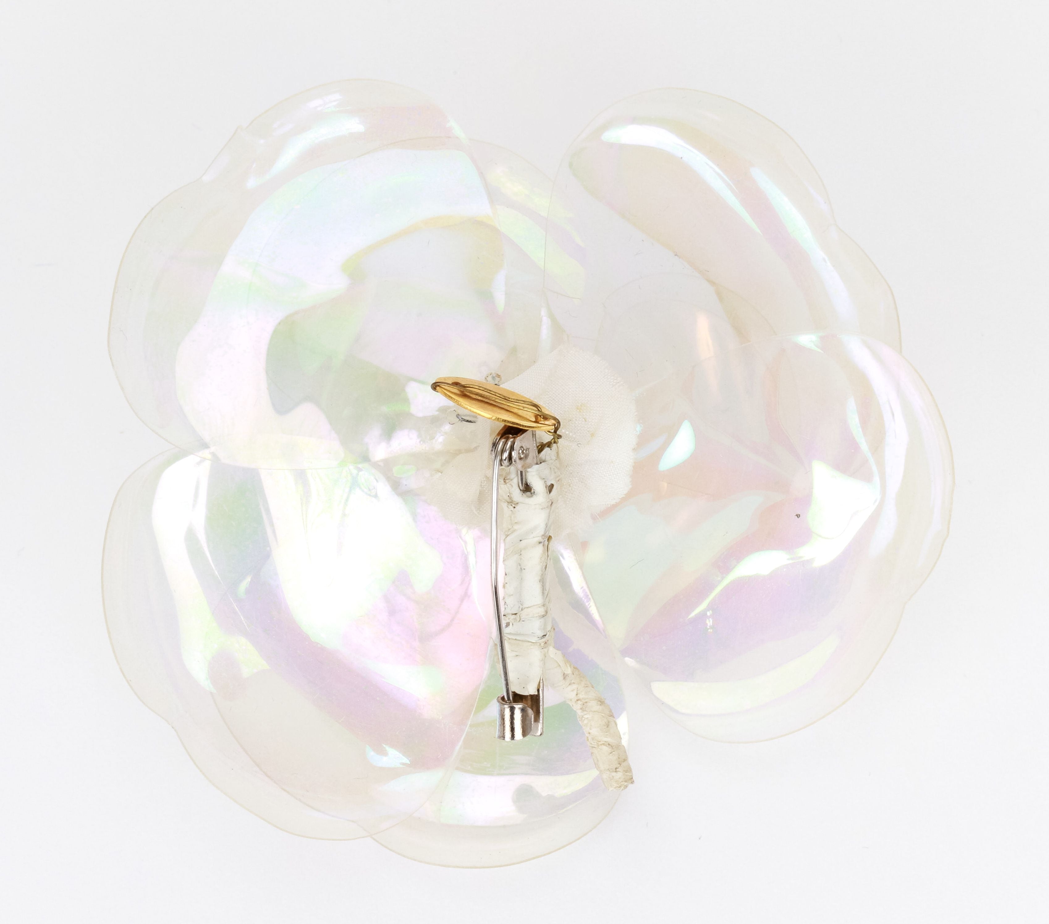 Chanel large see-through camellia brooch, 3" diameter. comes with velvet pouch.