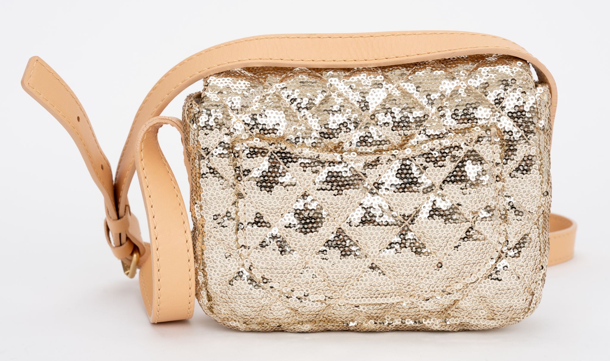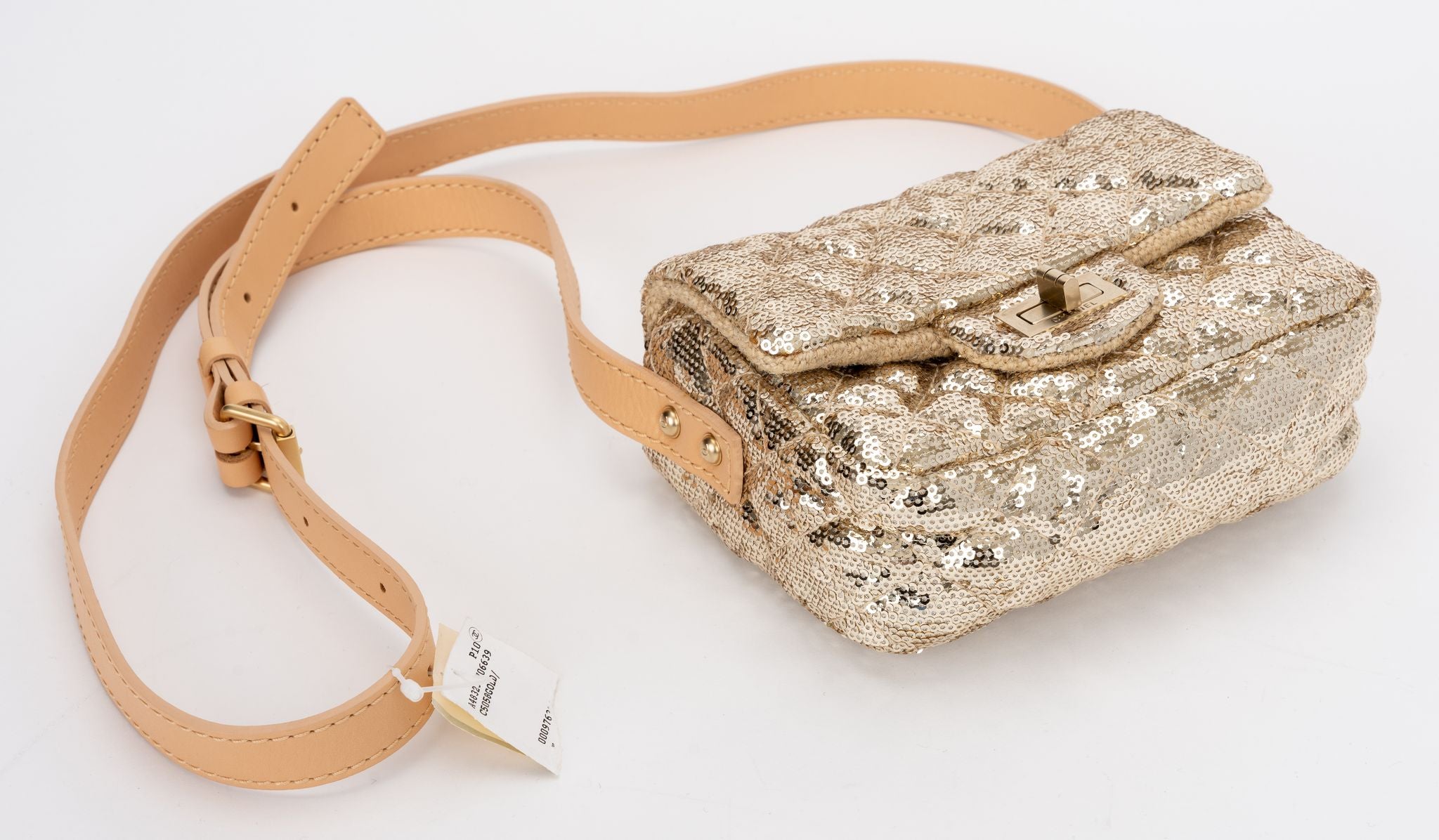 Chanel Mini Easy Sequin Reissue Flap Bag from the Spring 2010 Collection by Karl Lagerfeld. Sequins with antiqued gold tone hardware. Single adjustable shoulder strap. Features a twill interior lining and a single interior pocket. Turn lock closure. Shoulder drop 22". Collection 13. Original tag, hologram, id card, booklet and original dust cover .