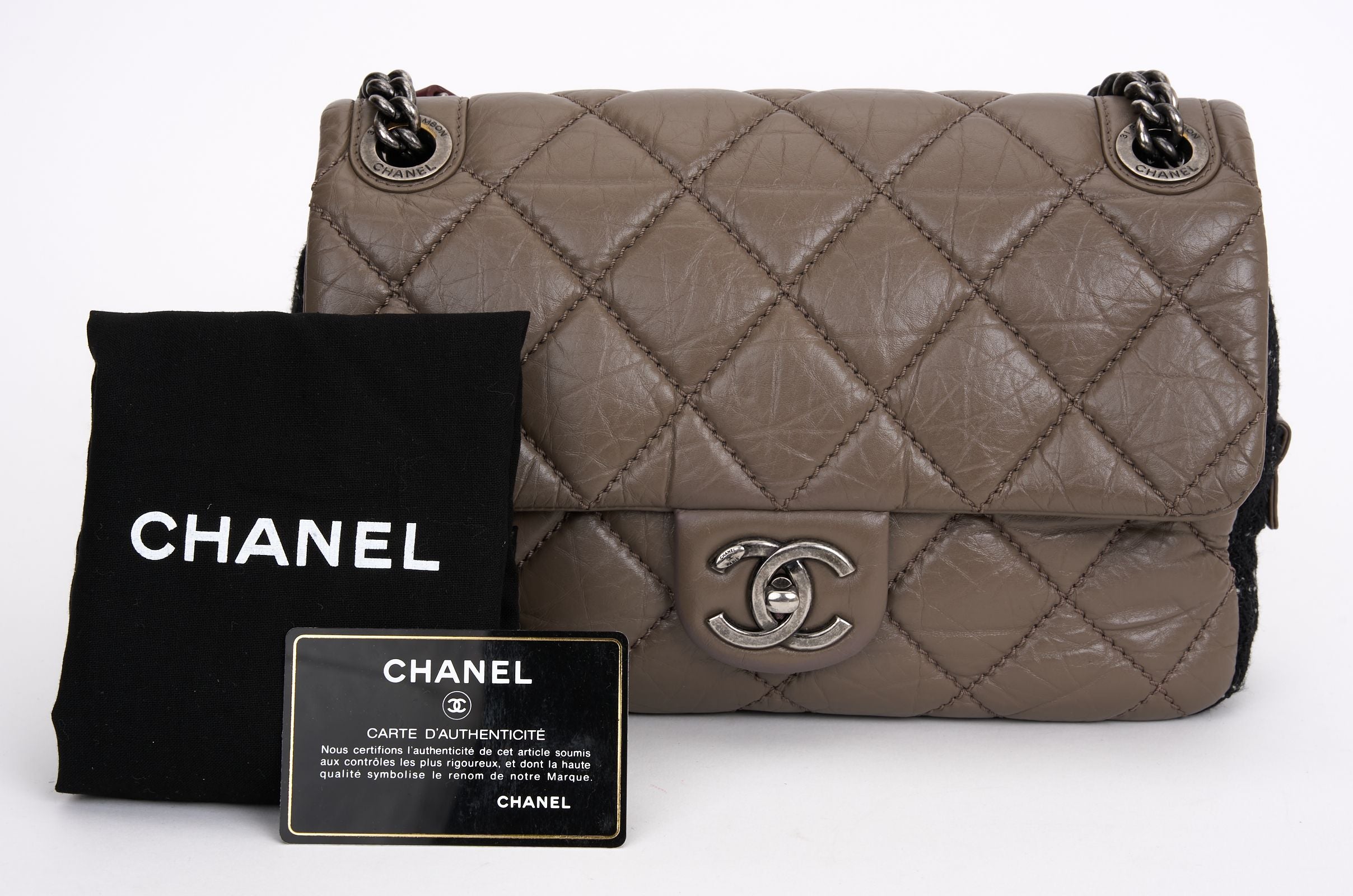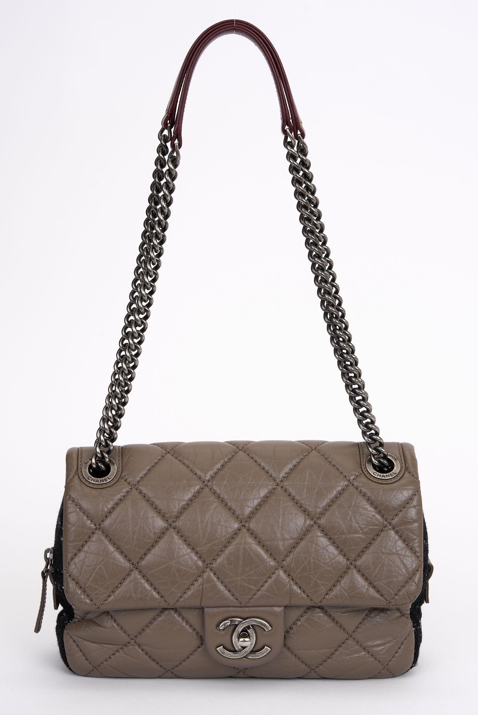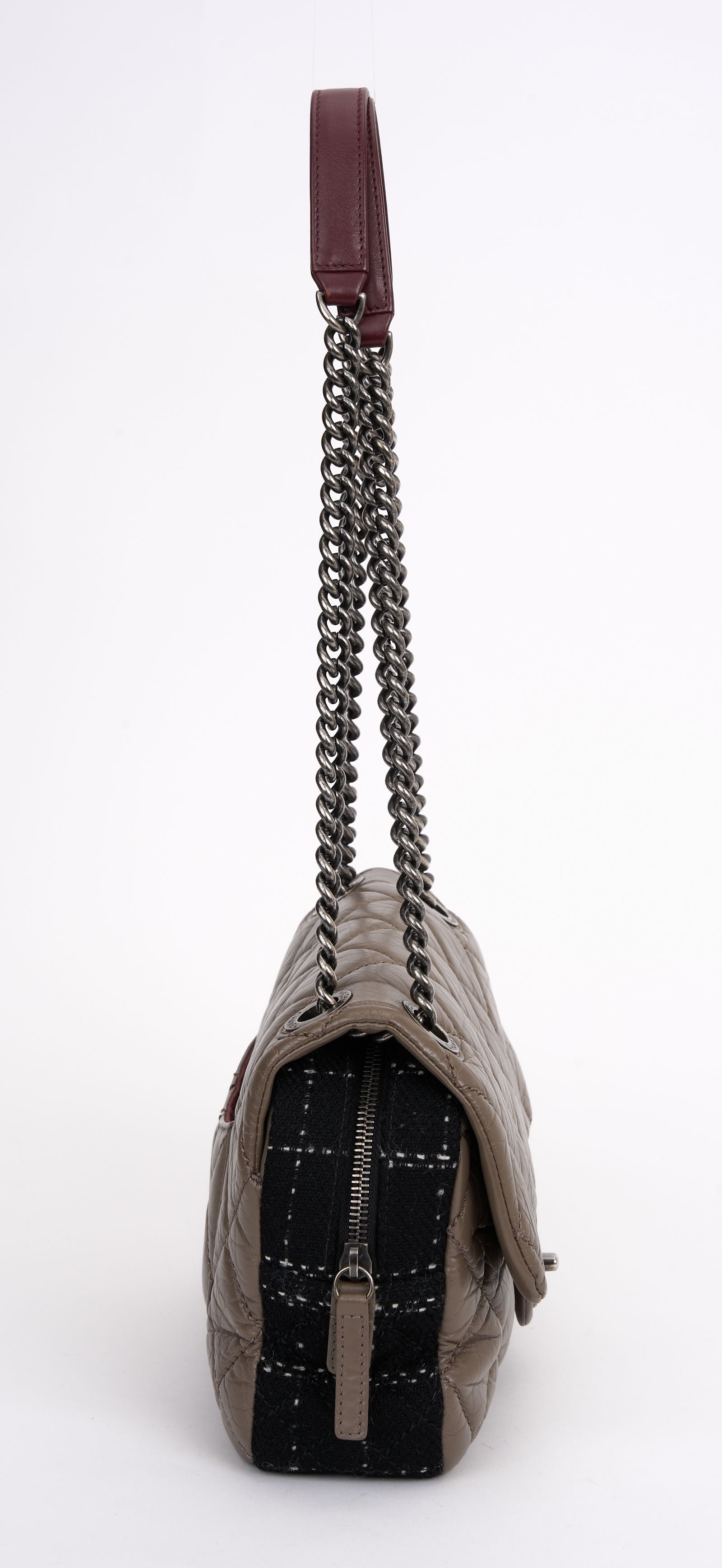 This Chanel shoulder bag from the Fall 2013 collection by Karl Lagerfeld features quilted calfskin, interlocking CC logo, gunmetal hardware and a wool interior trim. Dust Cover and ID included. First two numbers of hologram are 18. Strap Drop - 12".