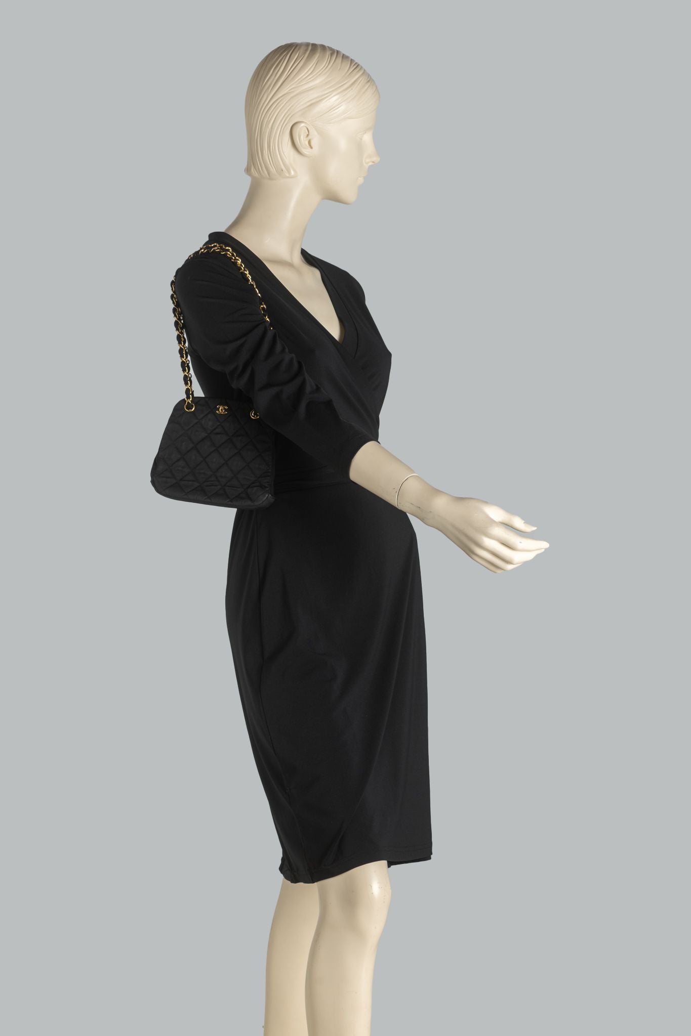 This Chanel Matelasse Chain Shoulder Bag in black toile has gold hardware and a chain link shoulder strap and a classic CC logo on the front. The top is fastened by a clasp that opens up to a roomy interior with two slit pockets. Comes with hologram and original dust cover. Late 80s collection.
