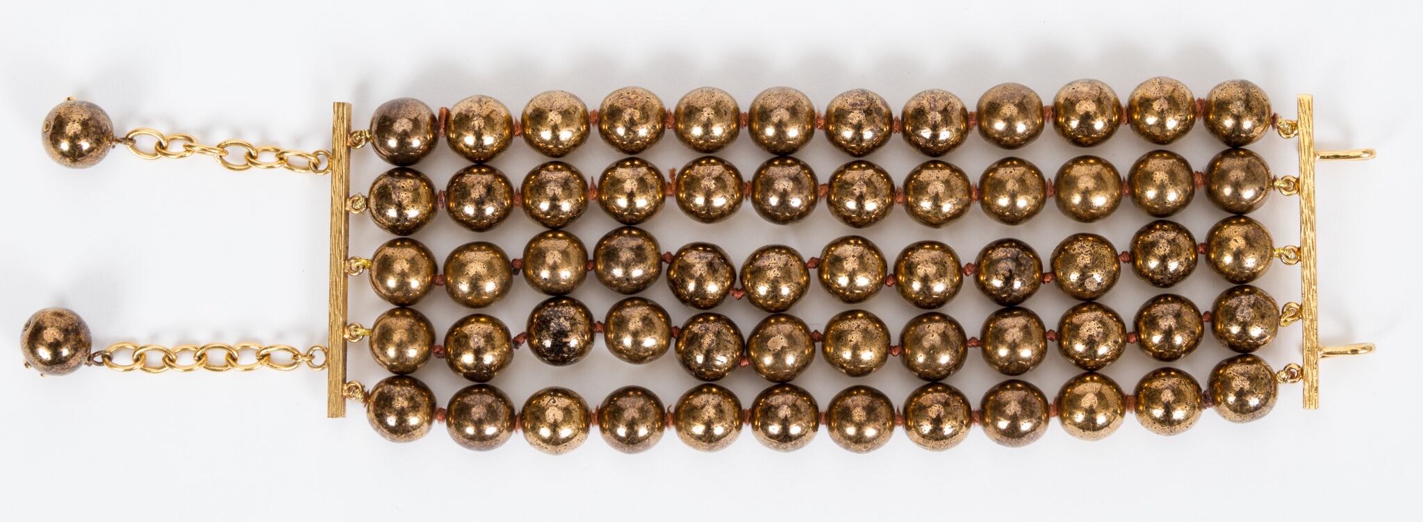 Chanel five-strand bronze-colored glass bead bracelet with two dangling logo beads on the end. Missing year tag; late 1980s. Extra 1.5" extension. Comes with original box.