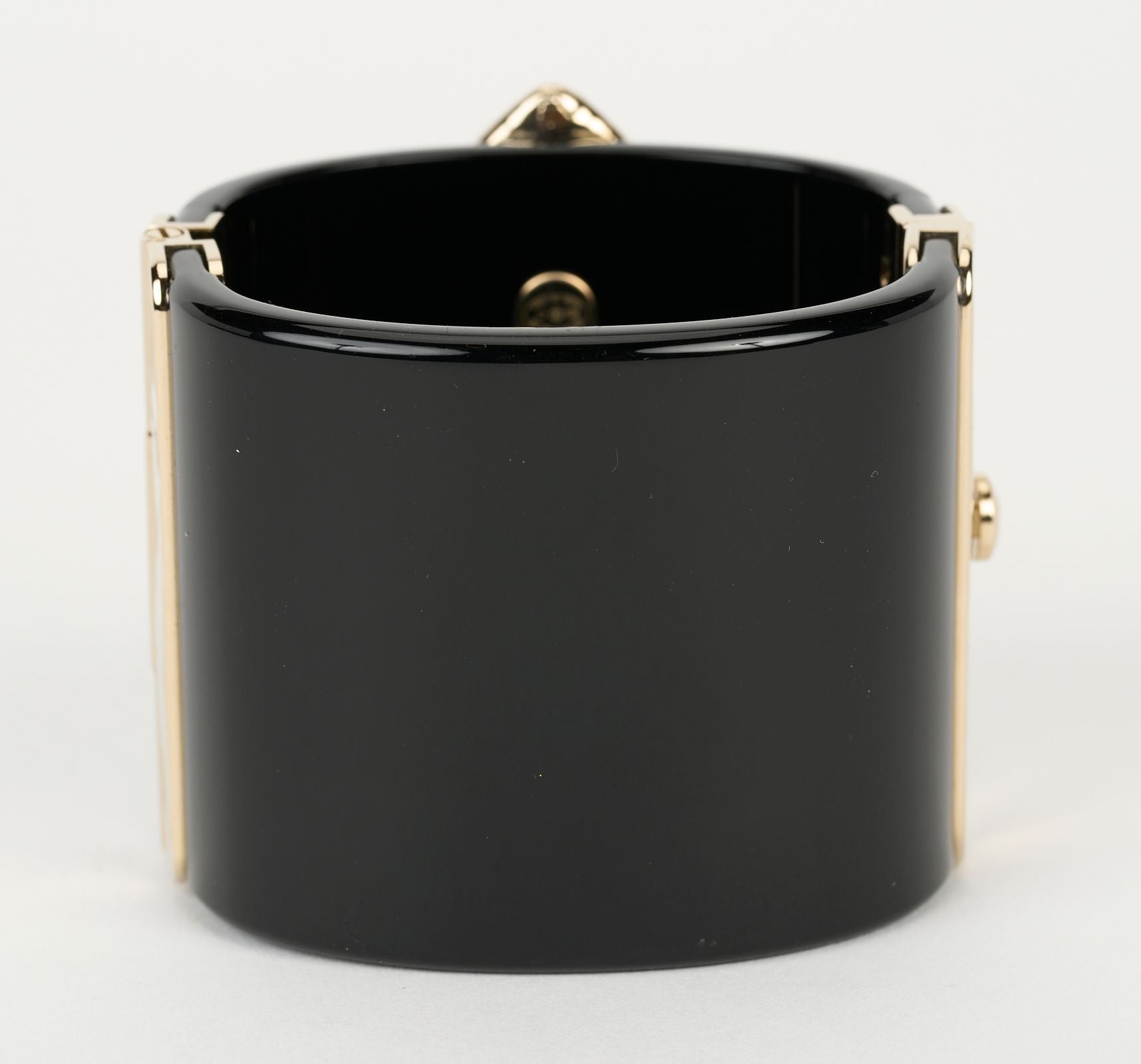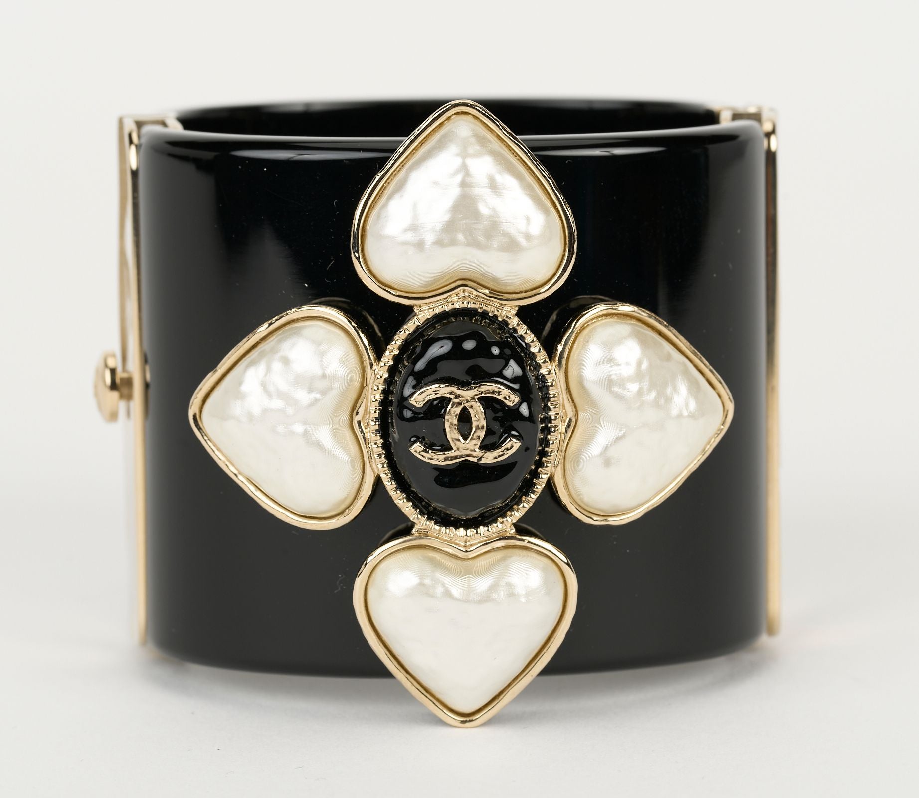 This Chanel Resin Pearl Enamel CC Cuff Bracelet in Black, Pearly White and Gold. This cuff is adorned with enamel and pearl stones on a polished gold plate and a Chanel CC logo. Circumference - 6.50 ". Cruise 2022 collection. Brand new in original box.