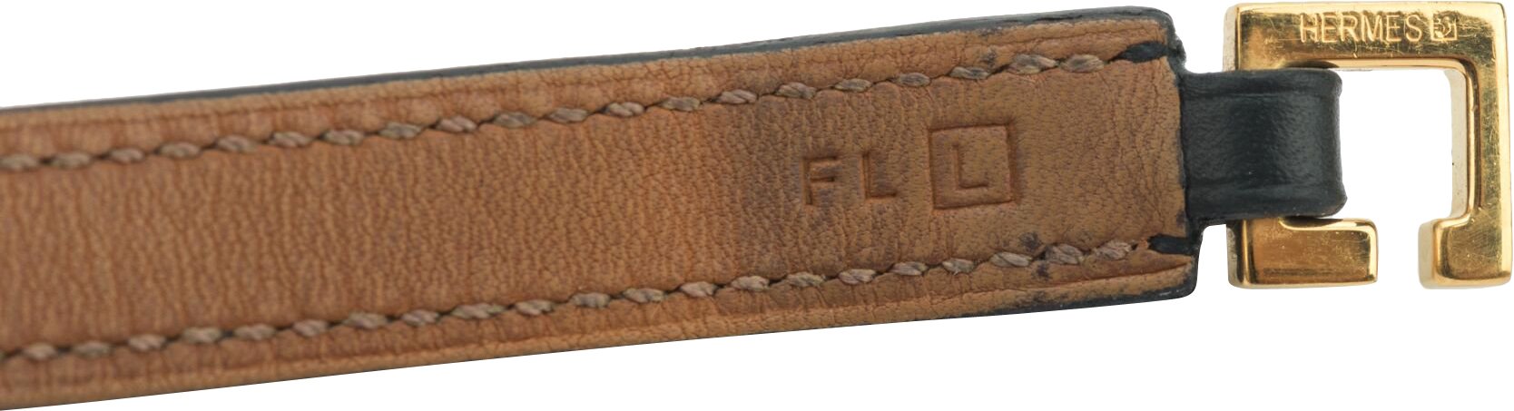 Hermès black leather double-strand bracelet with goldtone medor accent. Size small. Date stamp L for 2008. Comes with original suede pouch.