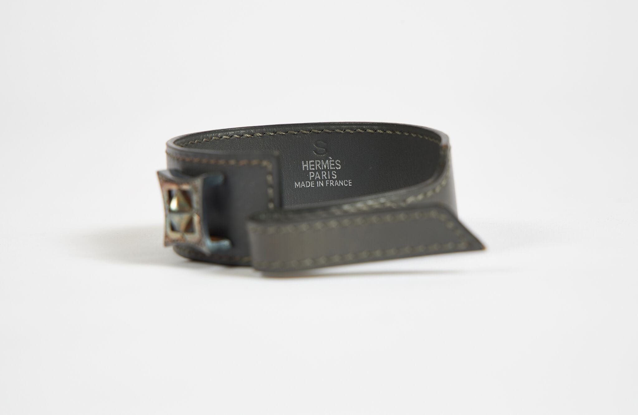 Hermès handmade gray box calf leather and sterling silver Tuareg bracelet. Adjustable length. Dated "D" in a square for 2000. Limited edition. Velvet pouch included. Minor wear.