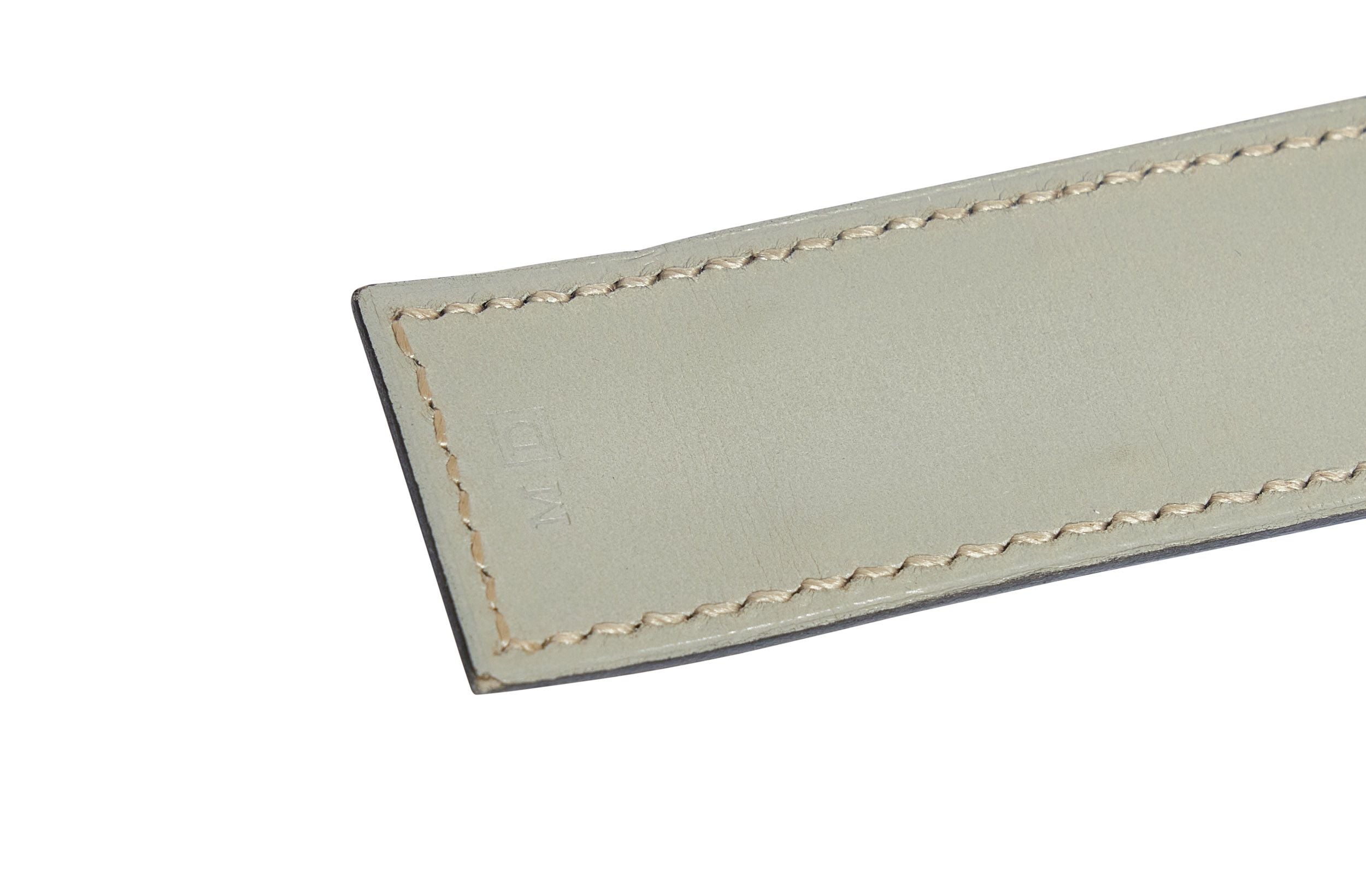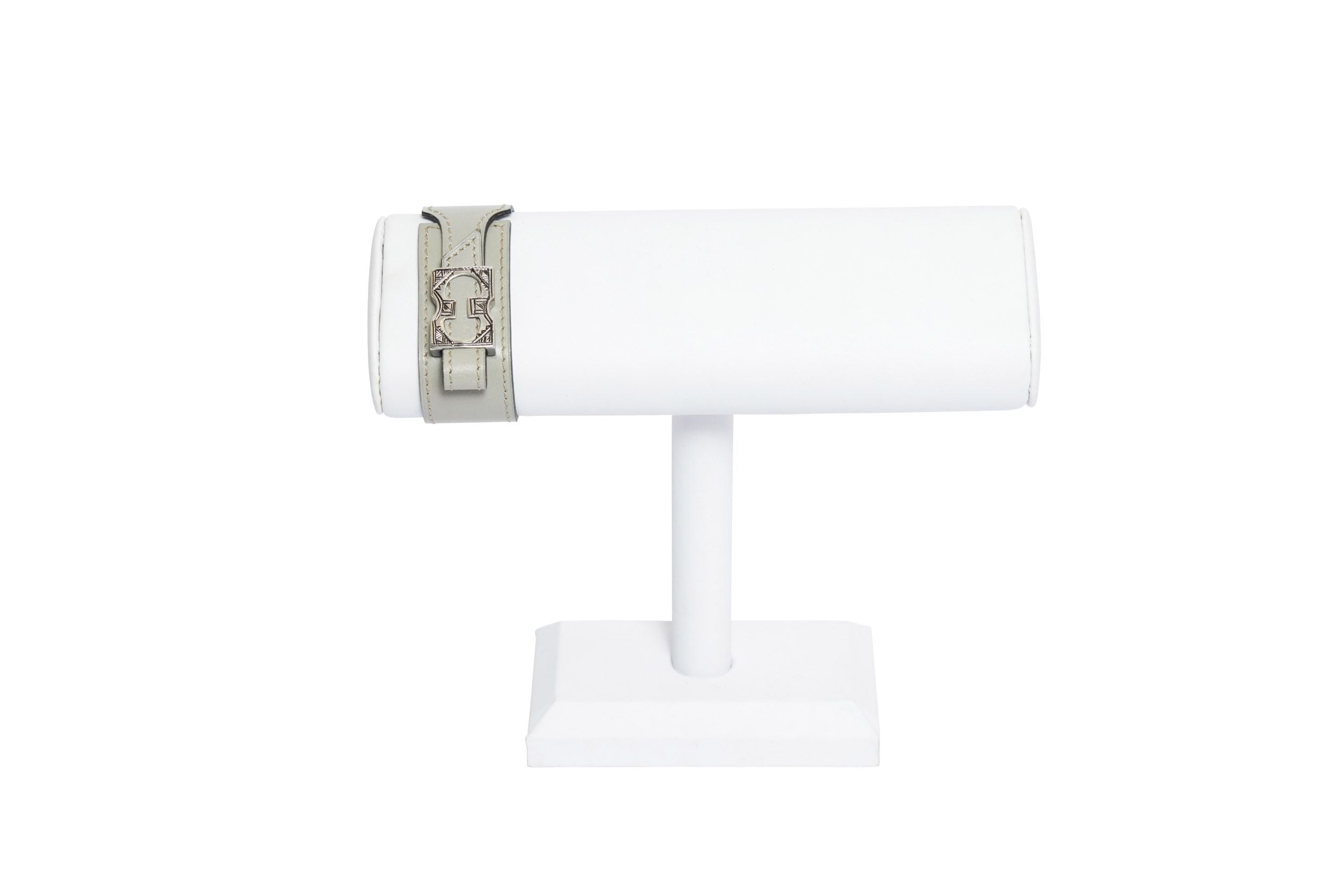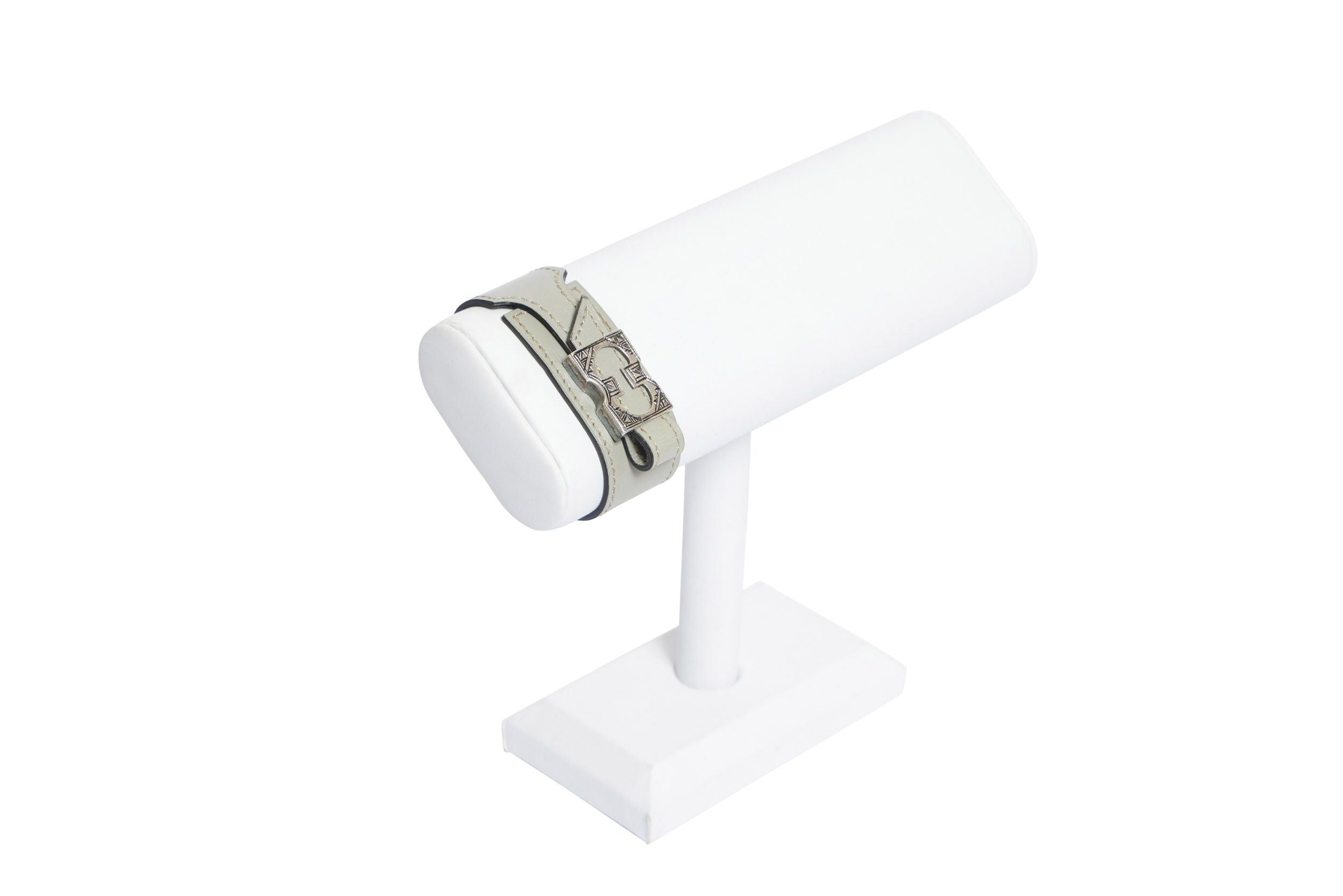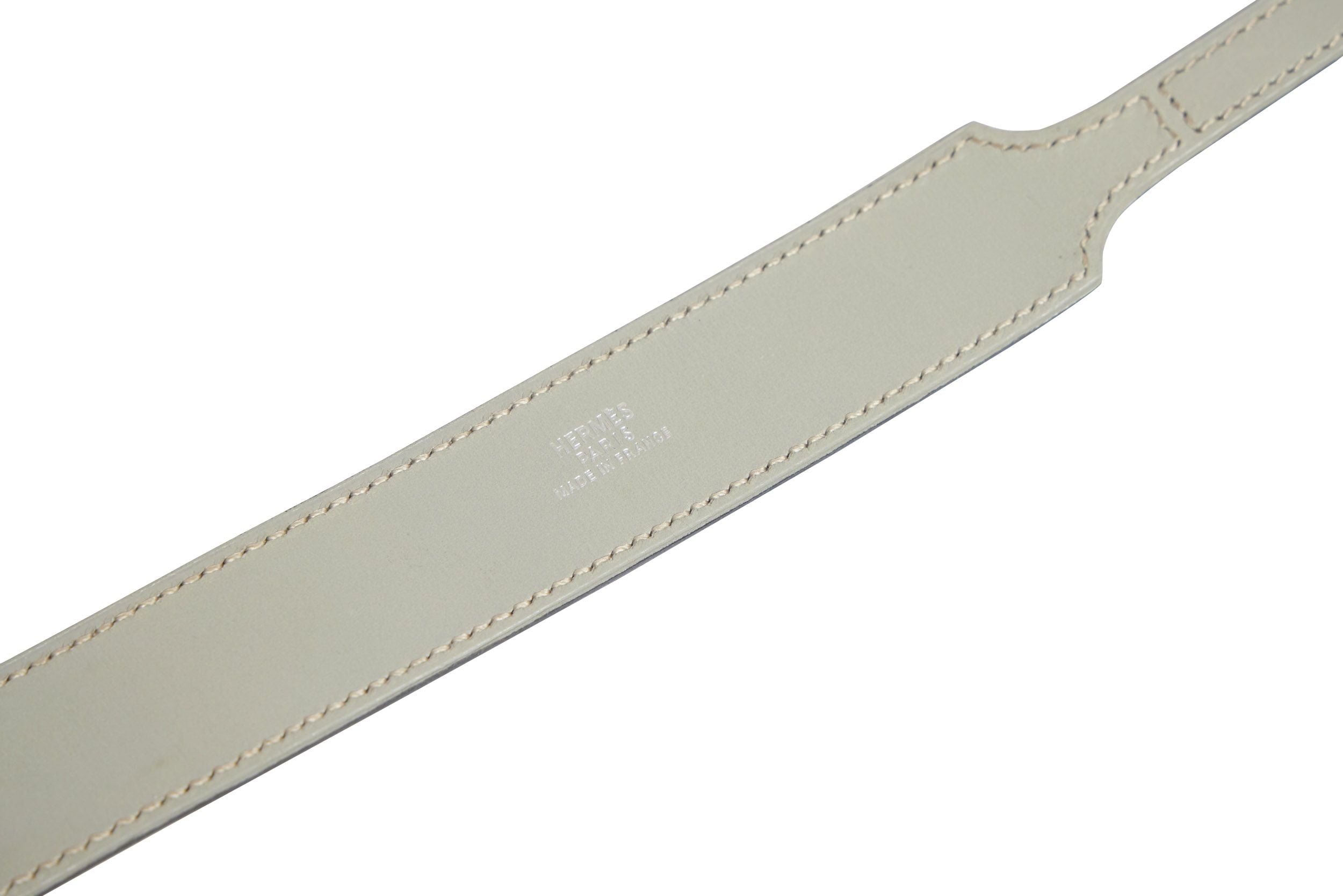 Hermes Touareg sterling silver bracelet. The leather is pearl grey calf leather. The bracelet closes with a small buckle. The piece is adjustable.