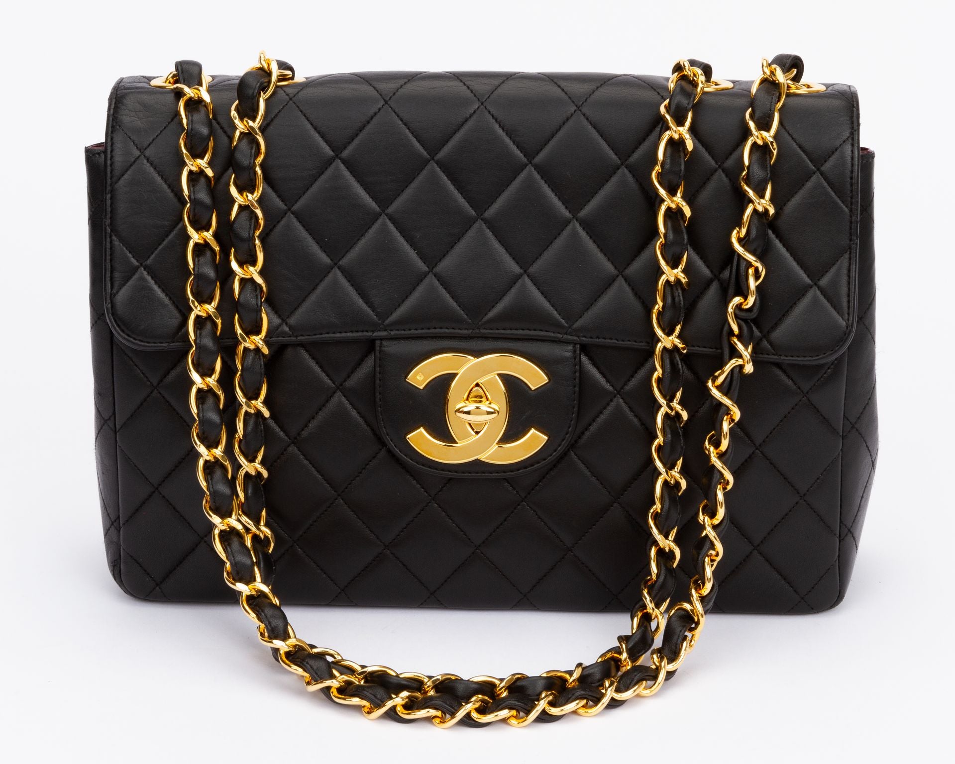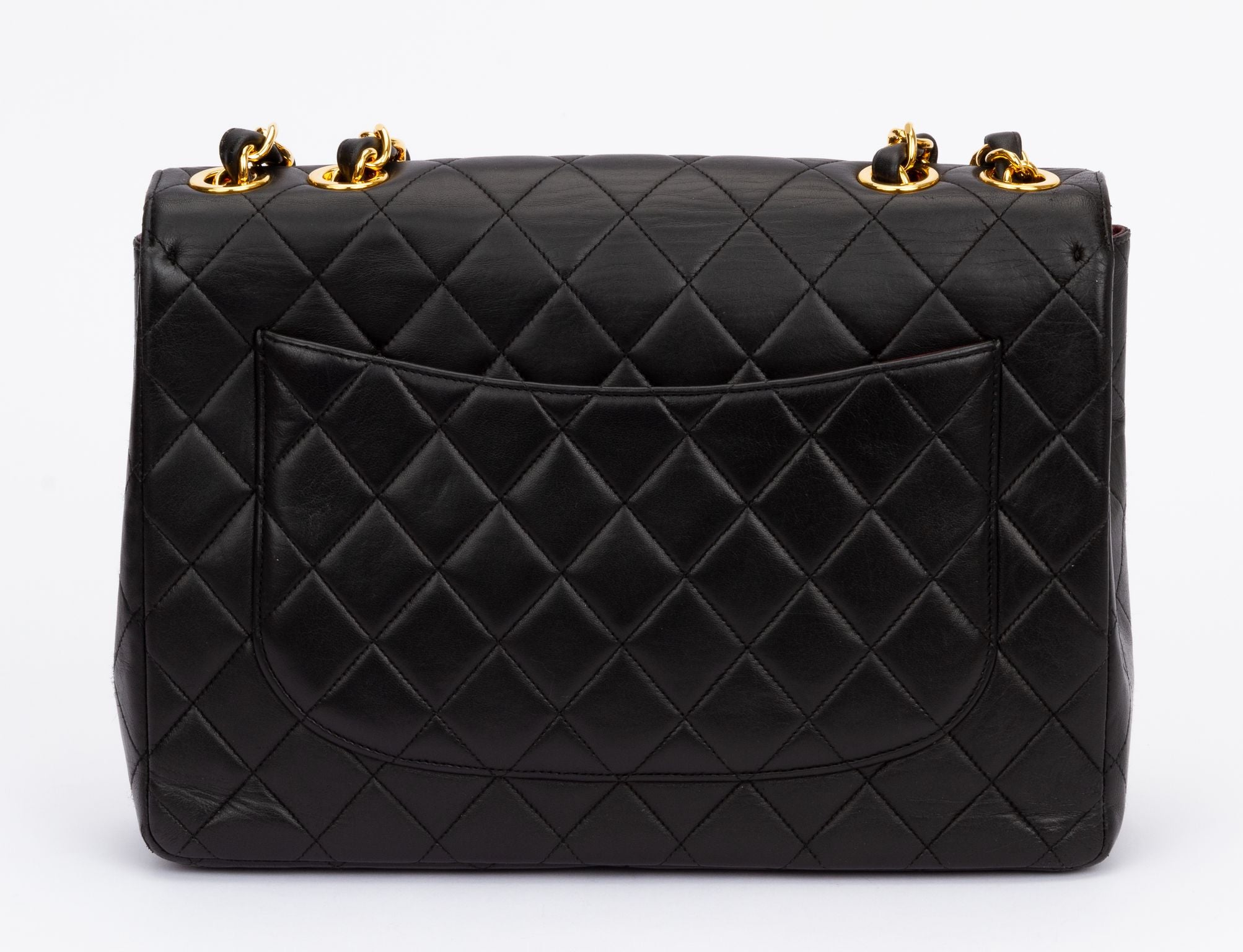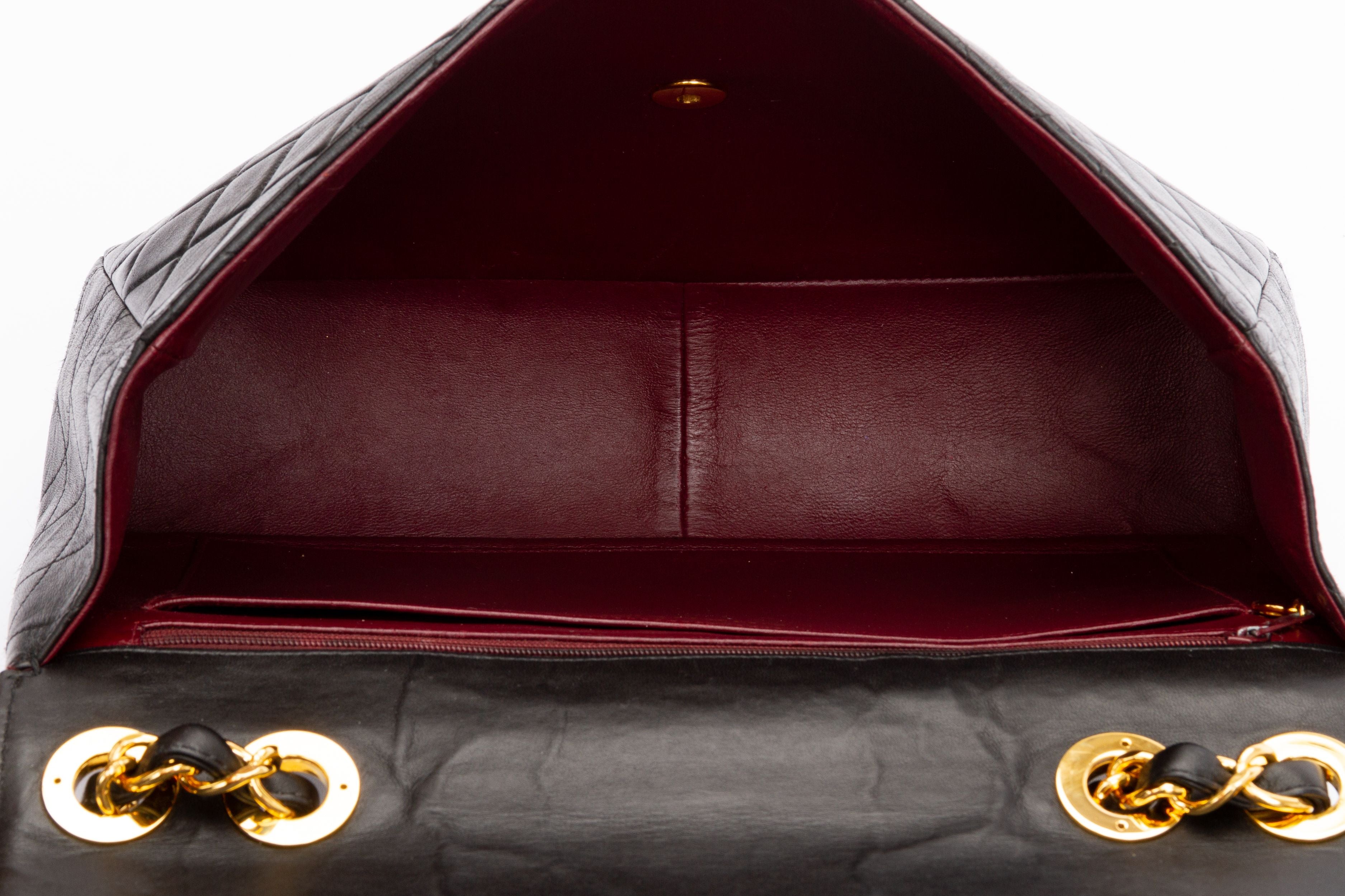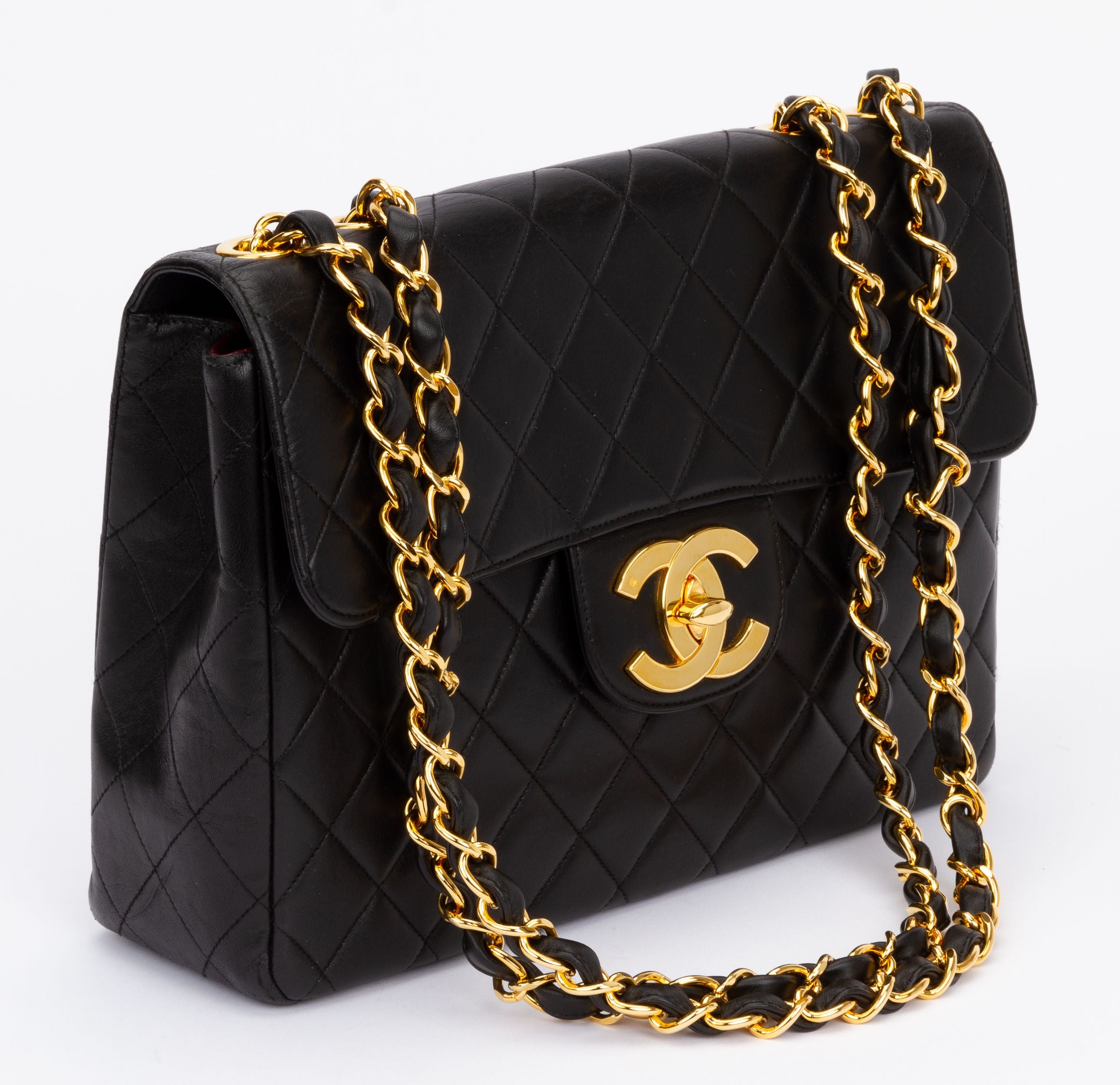 Chanel 90s jumbo black lambskin flap with 24kt gold plated hardware. Excellent condition. Shoulder drop 13" / 24". Collection 5. Includes hologram, Certificate of Authenticity and original box.