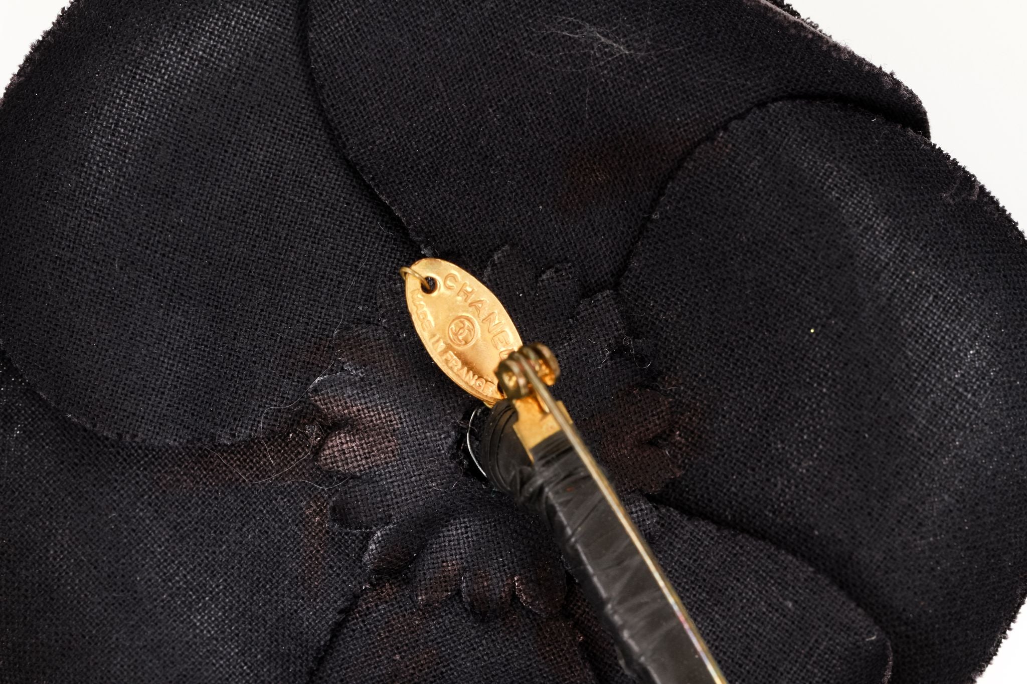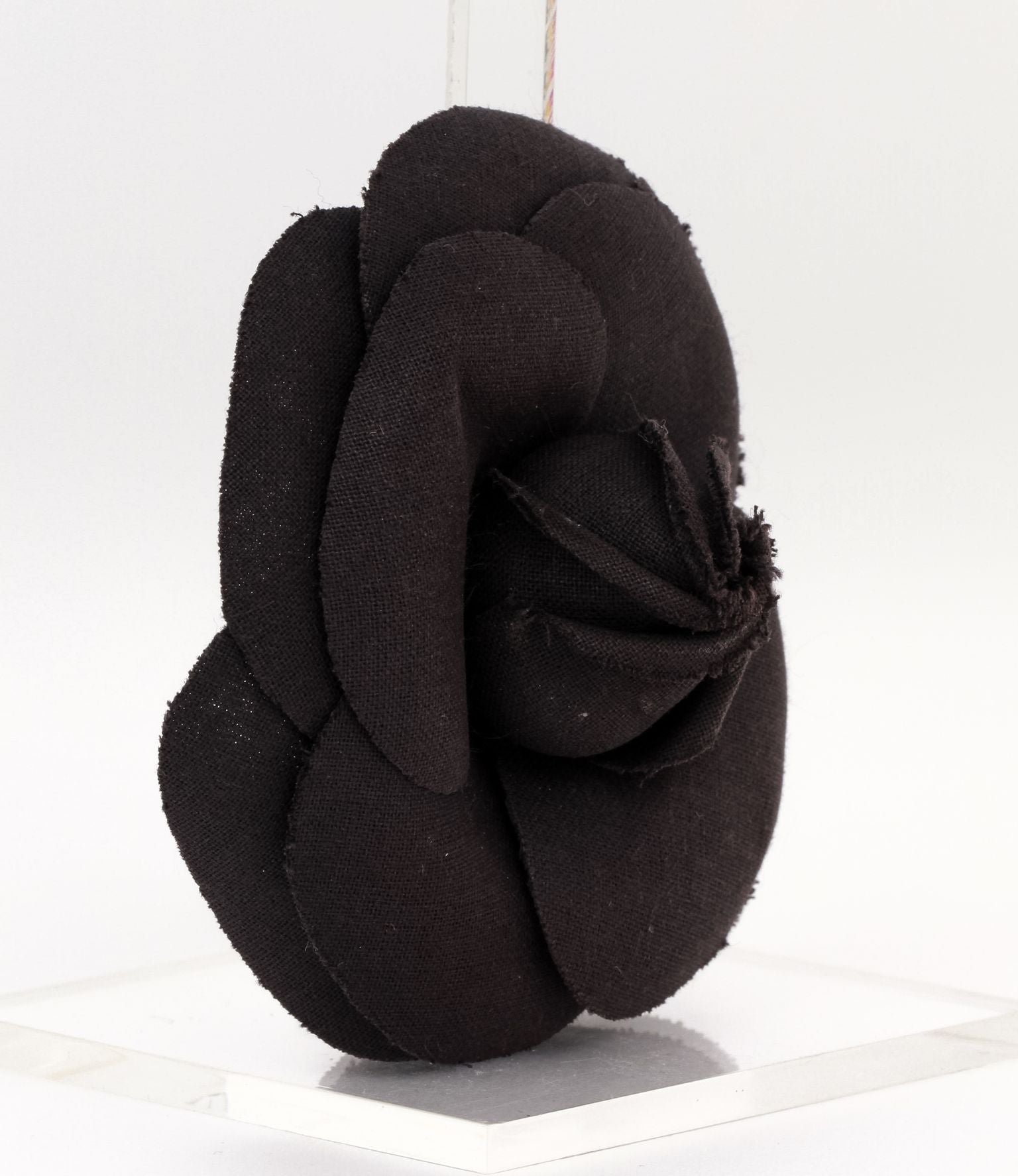 Chanel large black fabric camellia brooch, 3.5" diam. Comes with original pouch.