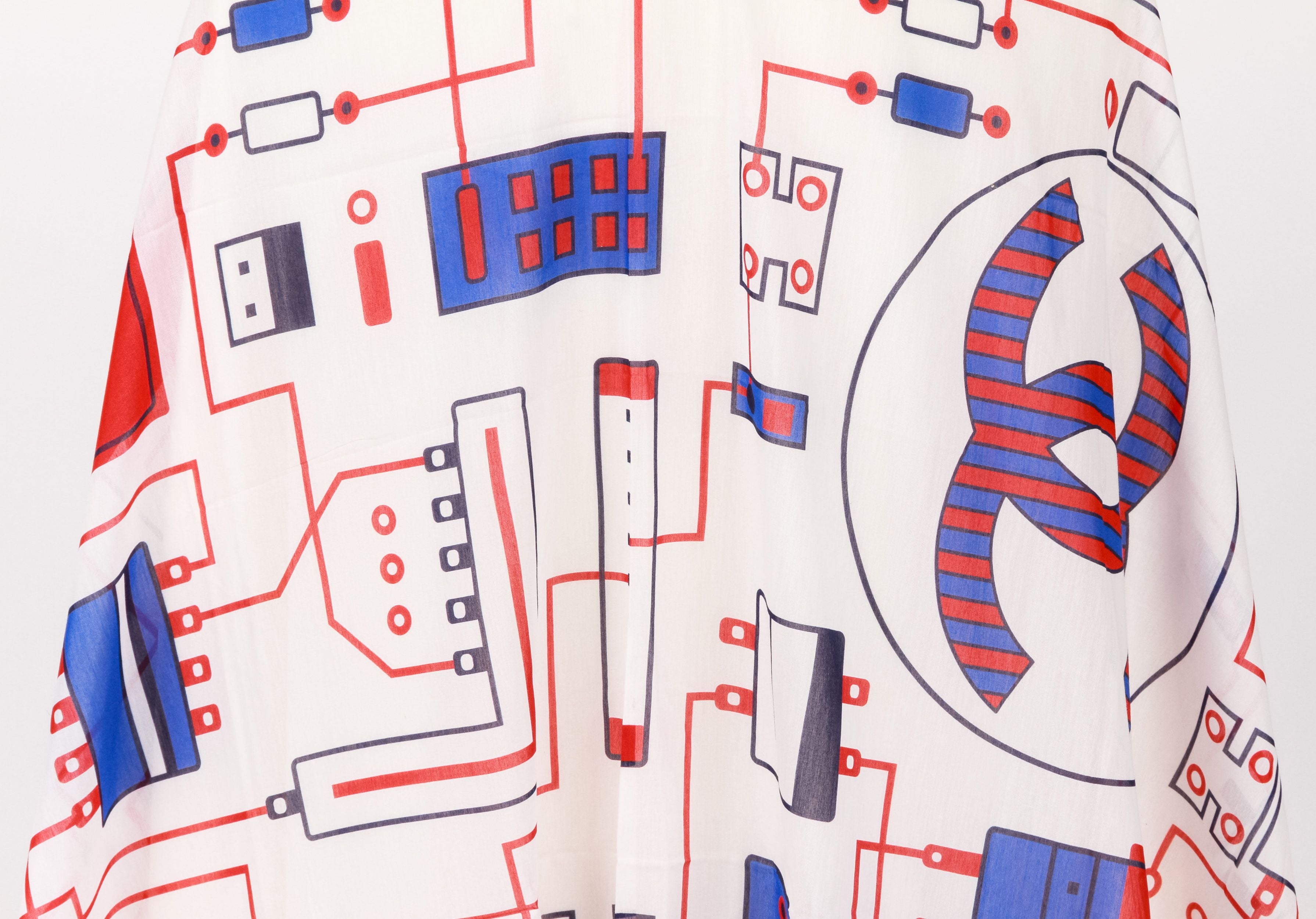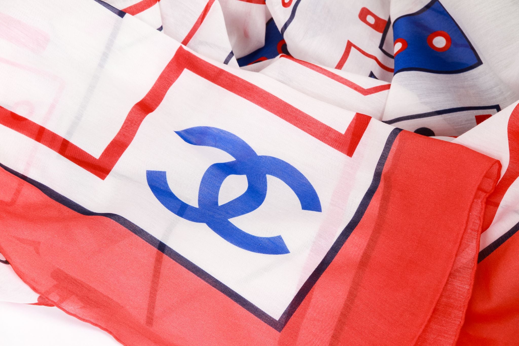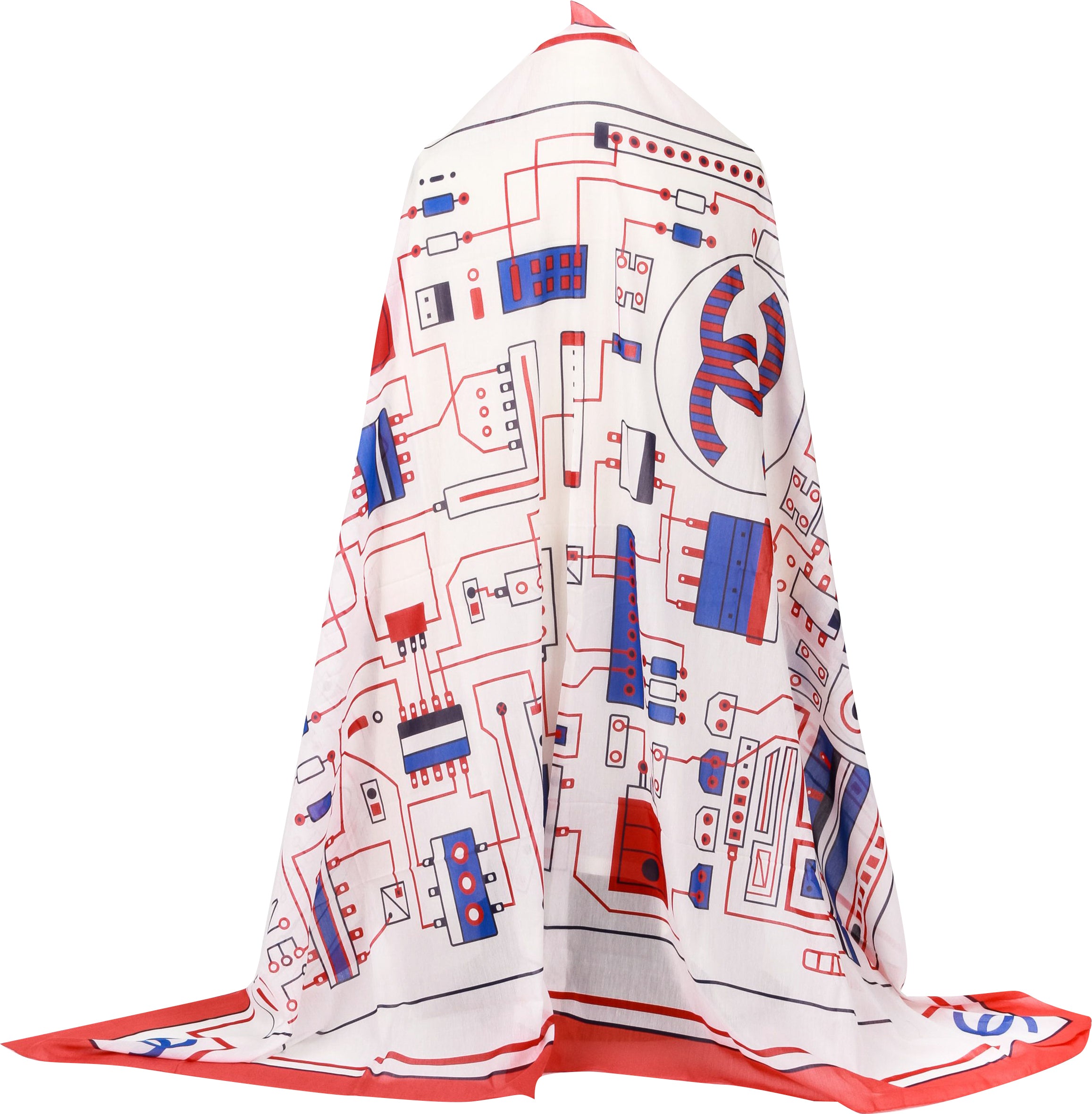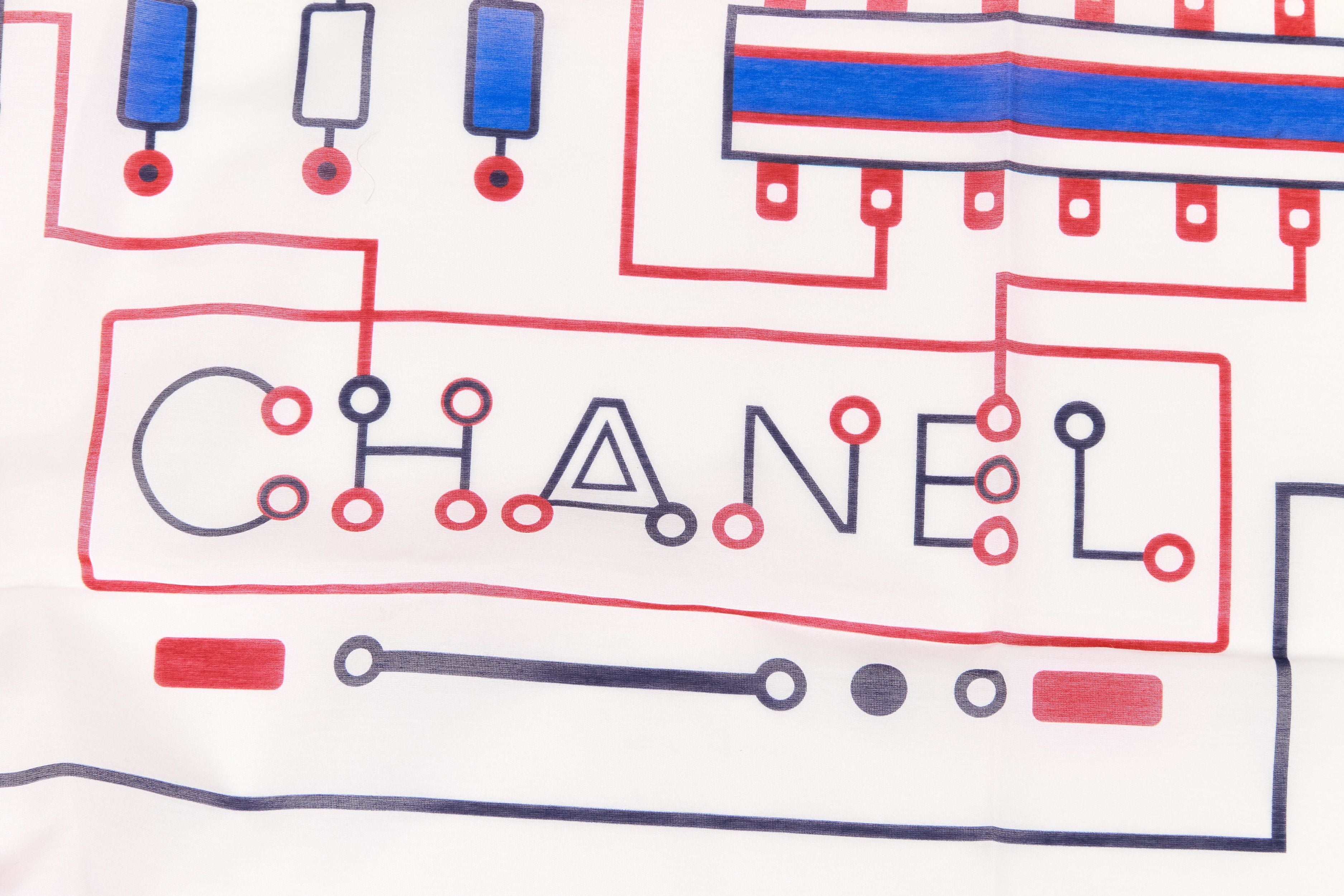 Chanel new oversize sarong/shawl, red, blue and white geometric design, 70" x 52", 80% cotton, 20% silk.
