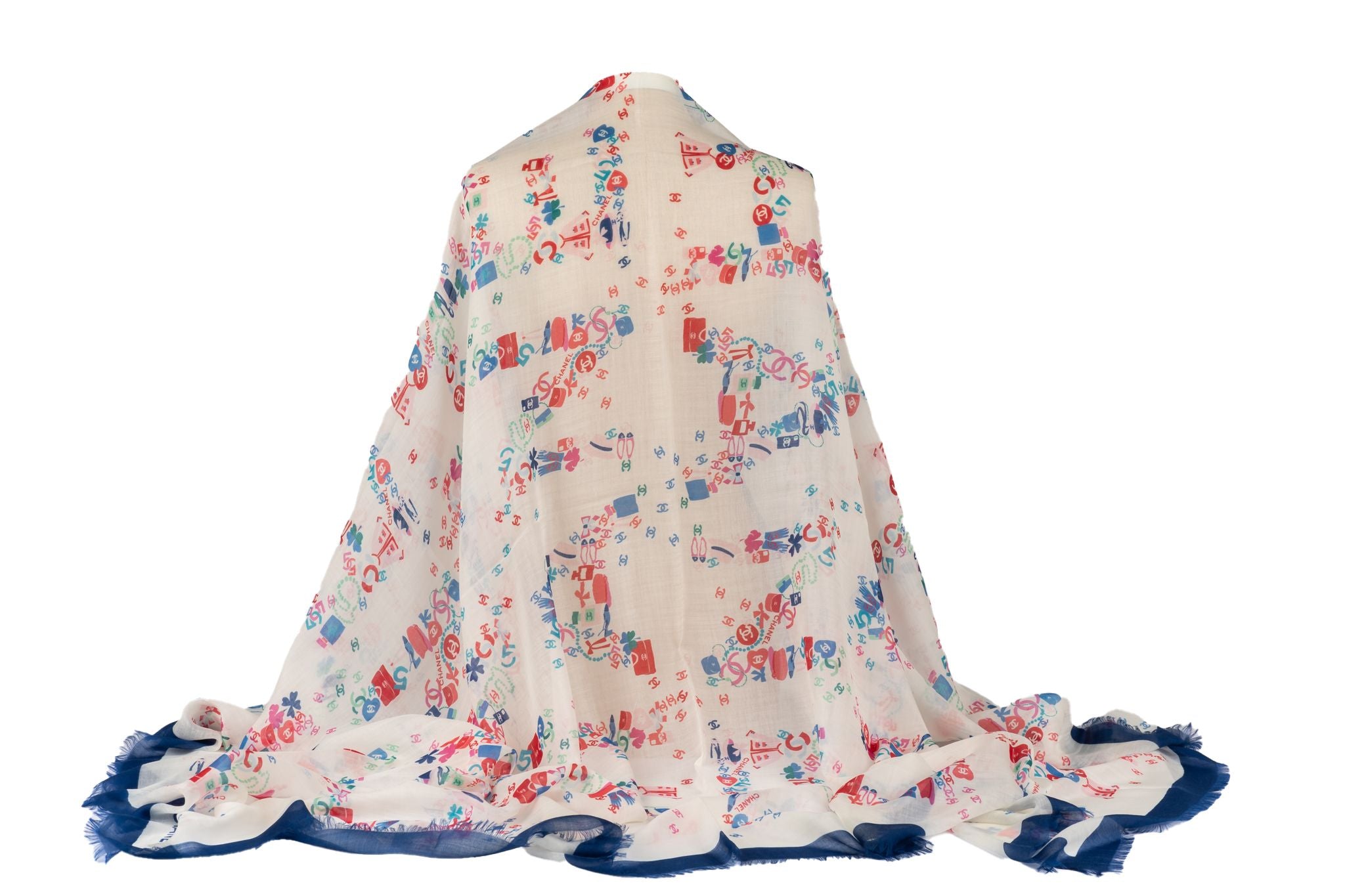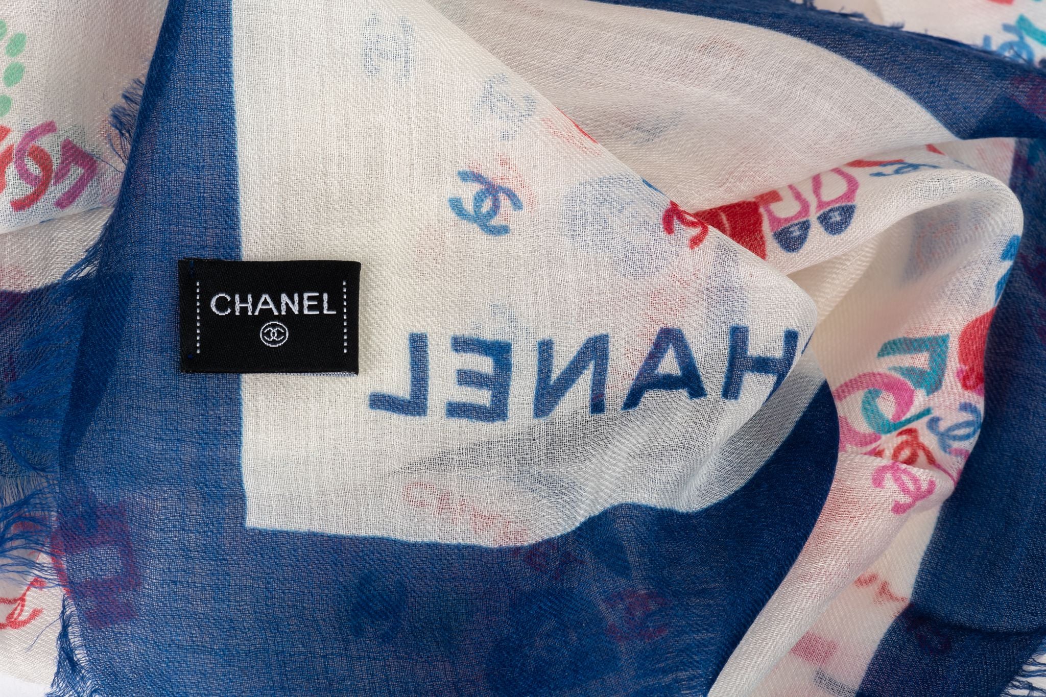 Chanel new lettering cashmere shawl in white and blue . Original care tag.