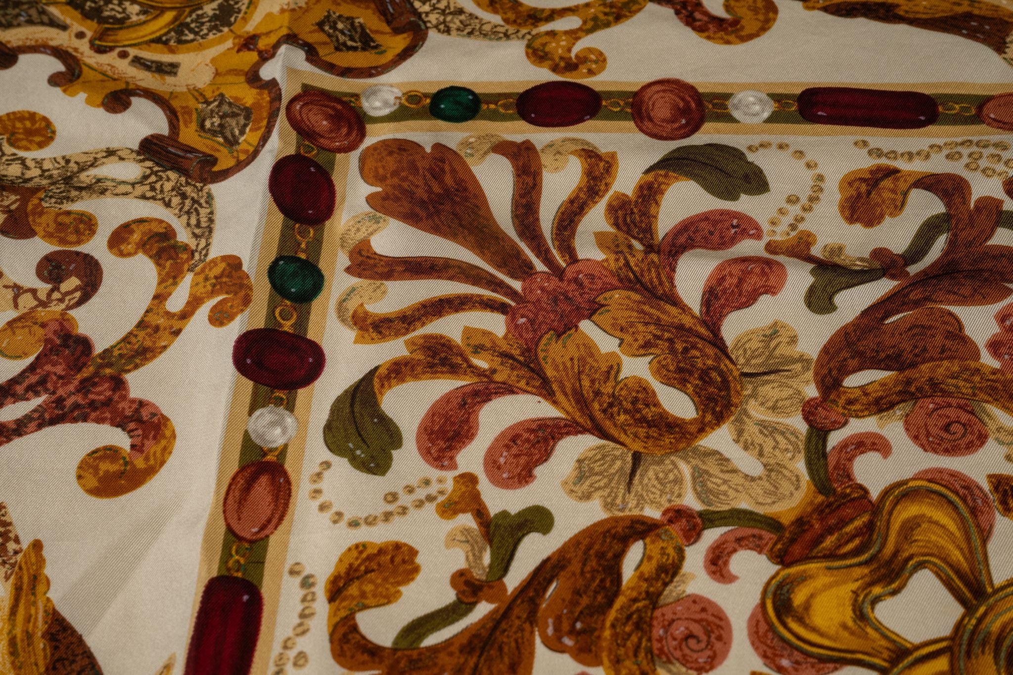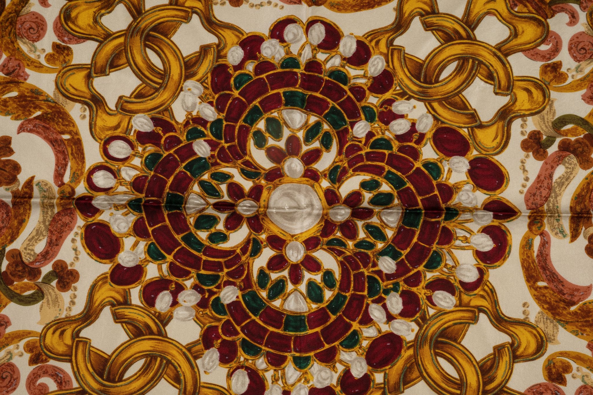 Chanel "Bijoux" 100% silk scarf in cream, brown, and naturals. Vintage from the 80s. Excellent condition.