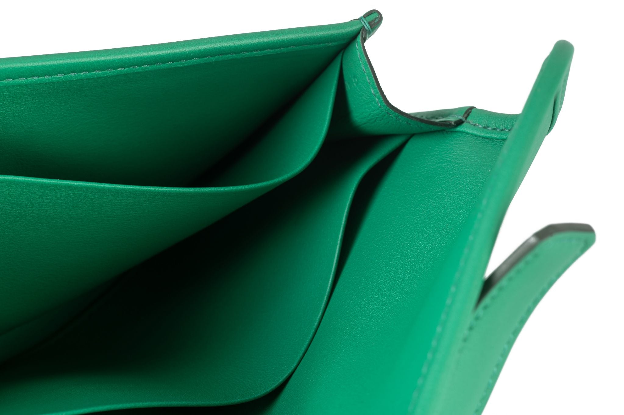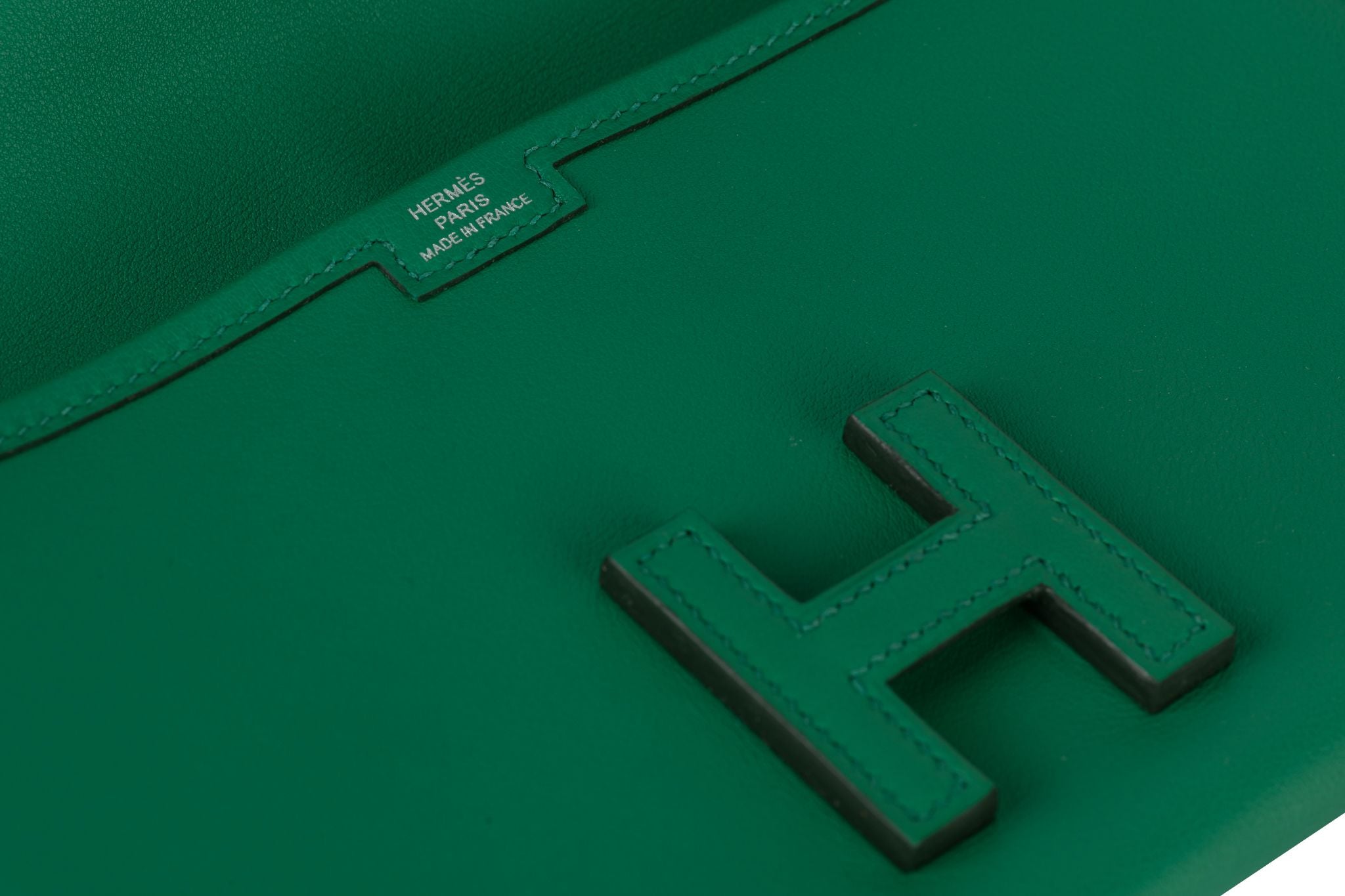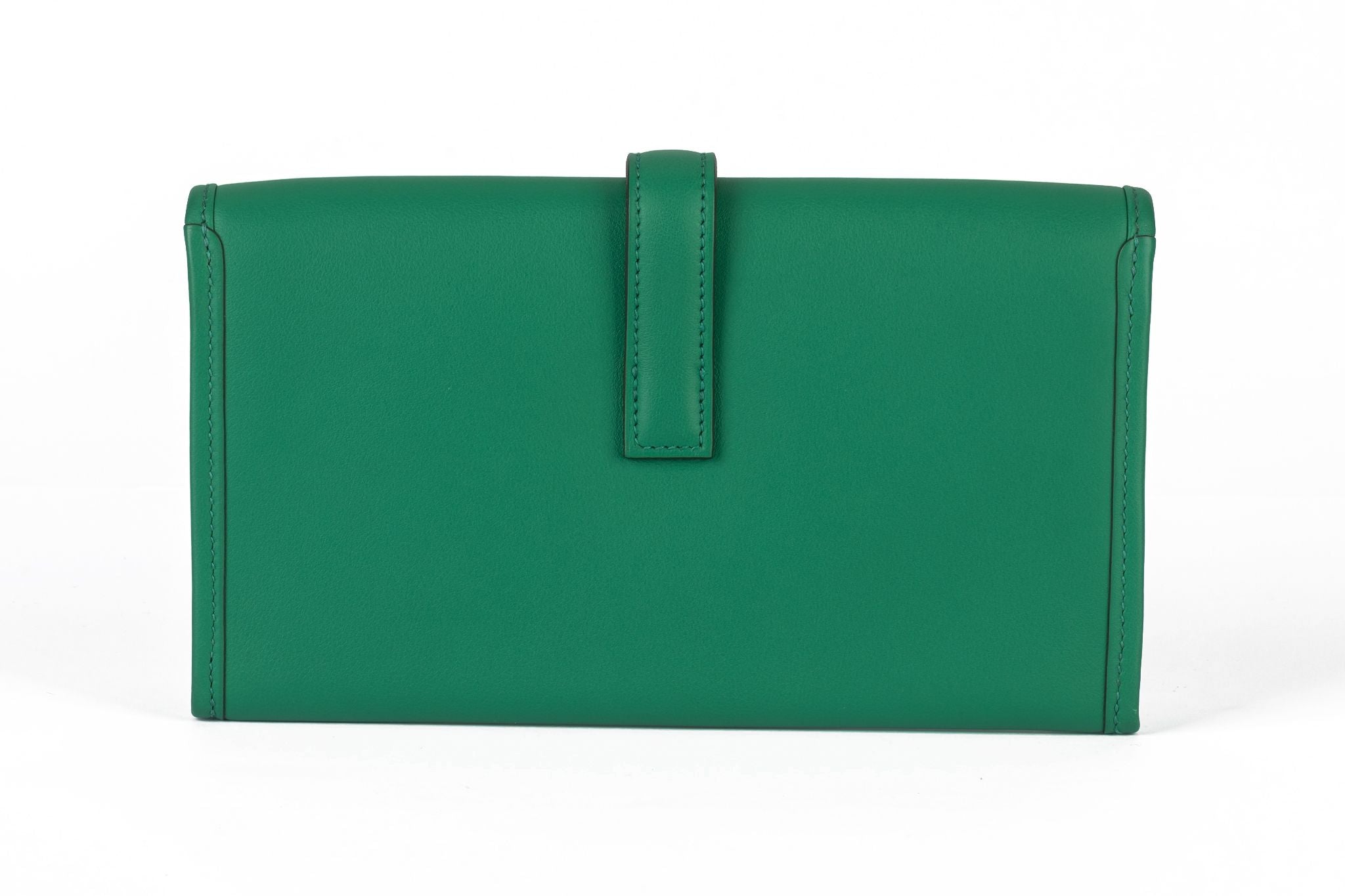 This Hermès Swift Jige Elan Clutch in Vert, features calfskin leather, a cross-over flap and a strap that tucks under a leather Hermes "H." This opens to a leather interior. Comes with original box. First letter C.