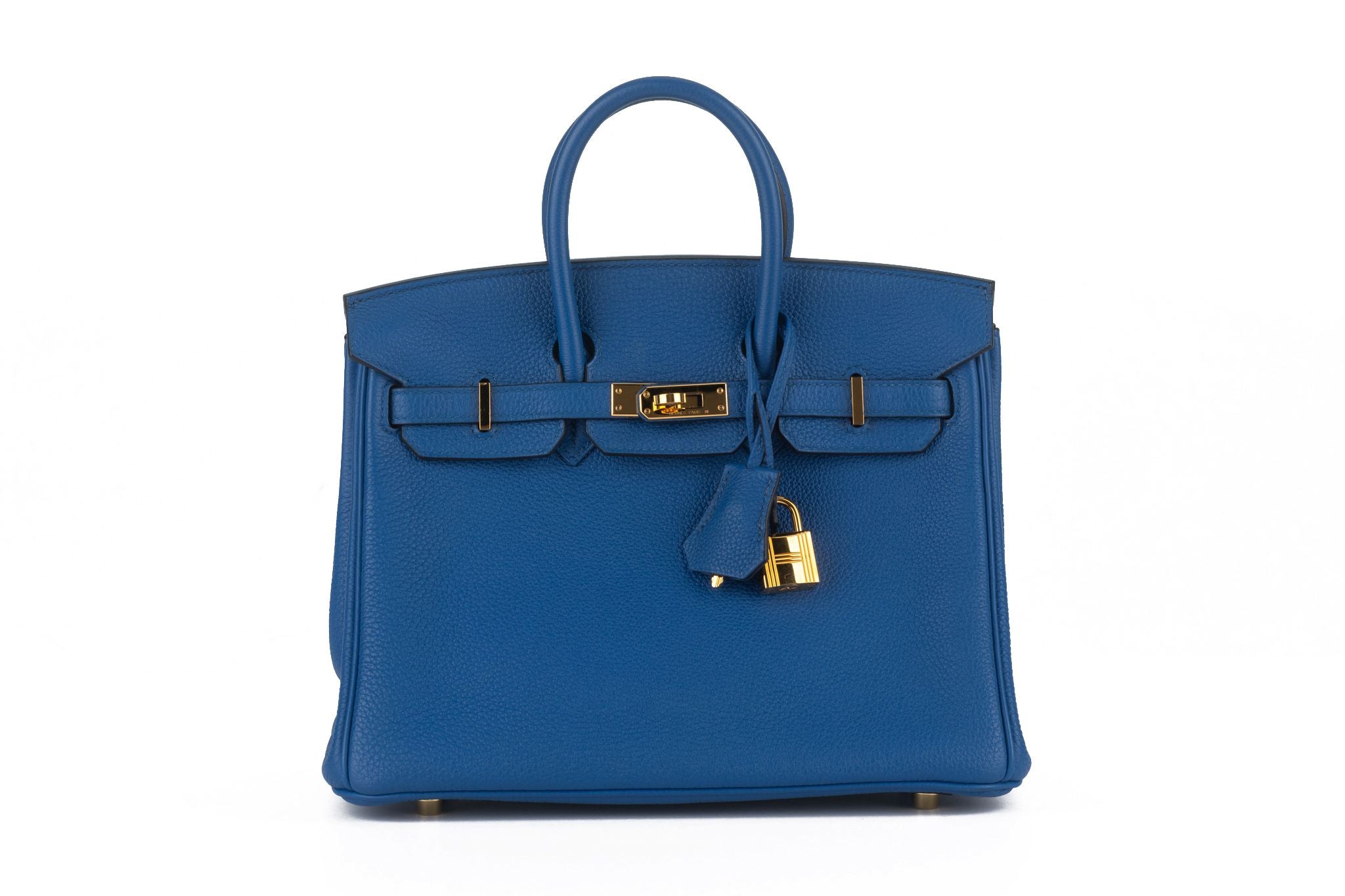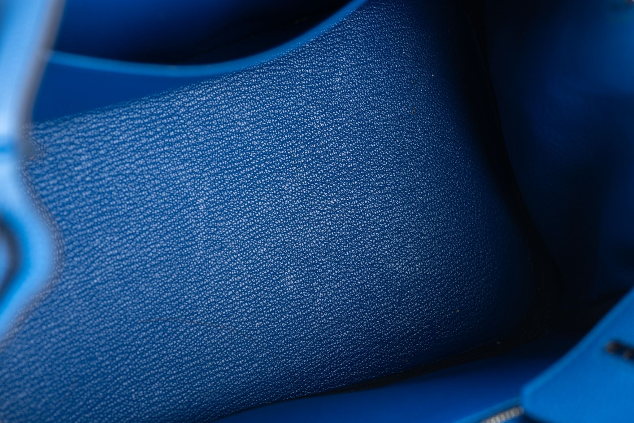 The Birkin 25 in electric blue togo leather with gold hardware and has tonal stitching, front flap, two straps with center toggle closure, clochette with lock and two keys and double rolled handles. The interior is lined with chevre leather. Includes rain protection, original dust cover First letter Z. Excellent preowned condition.