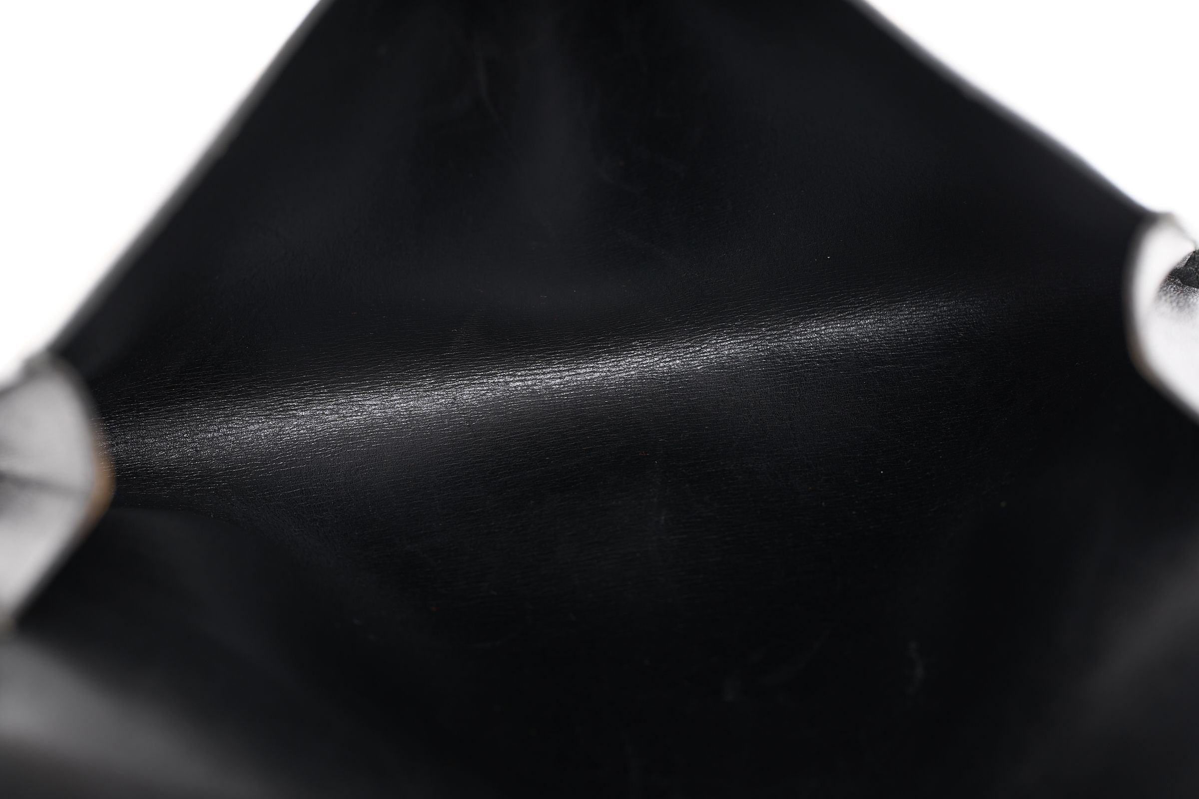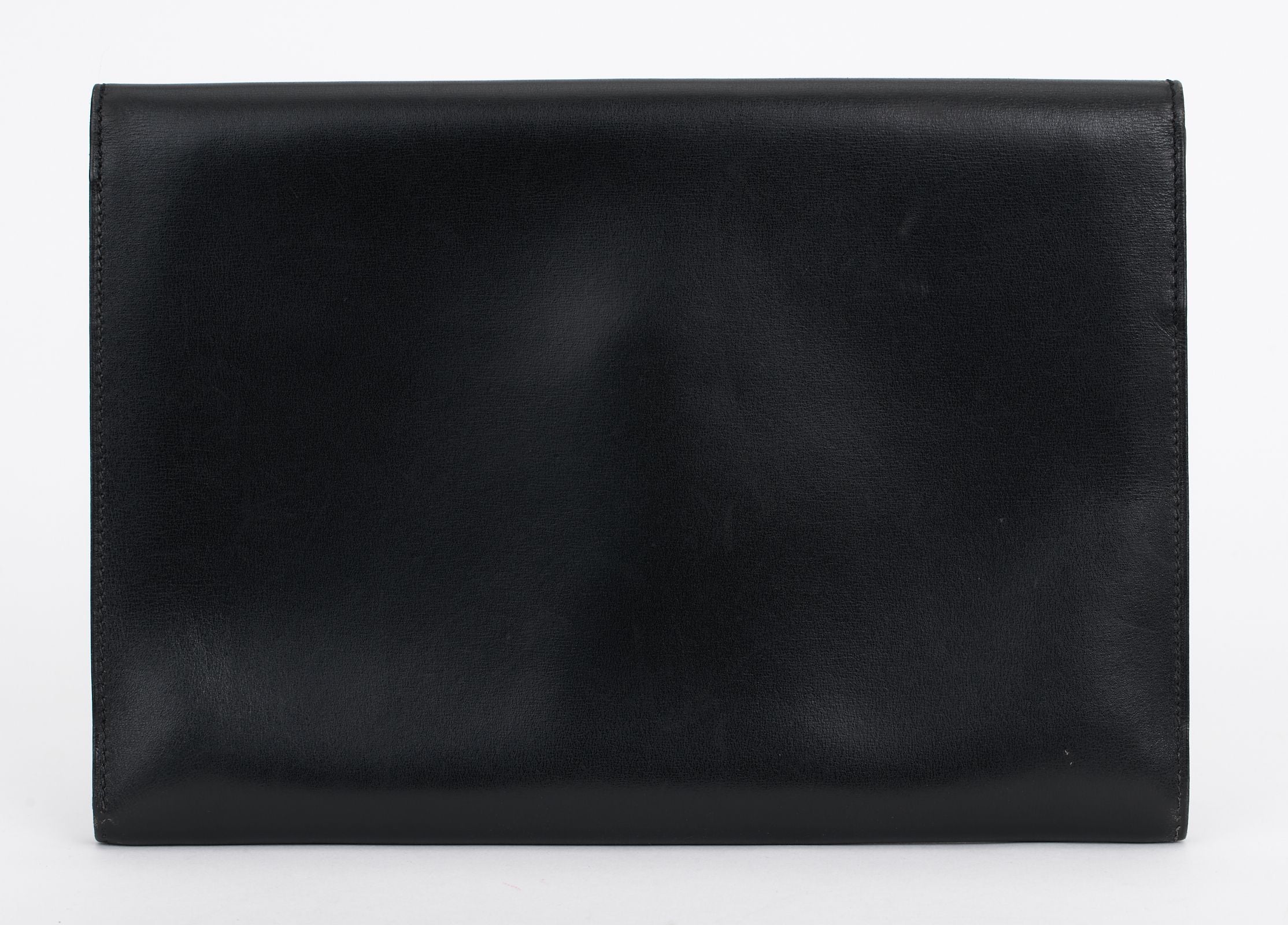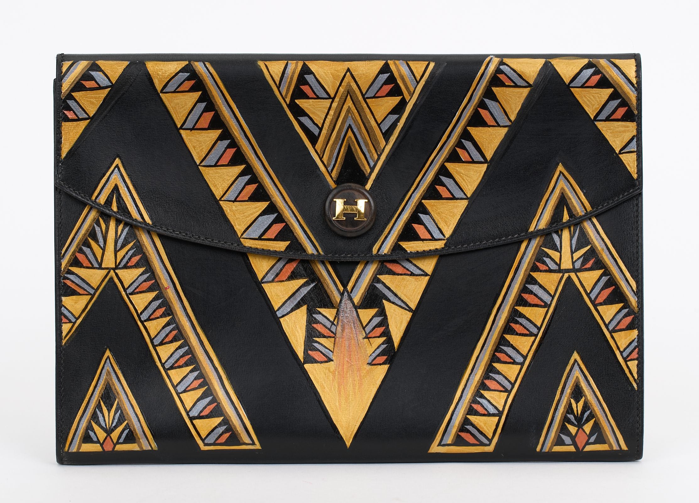 Hermès vintage black box calf rio clutch, hand painted by an American artist. The inspiration for this art deco design is the Chrysler building . Comes with original dust cover.