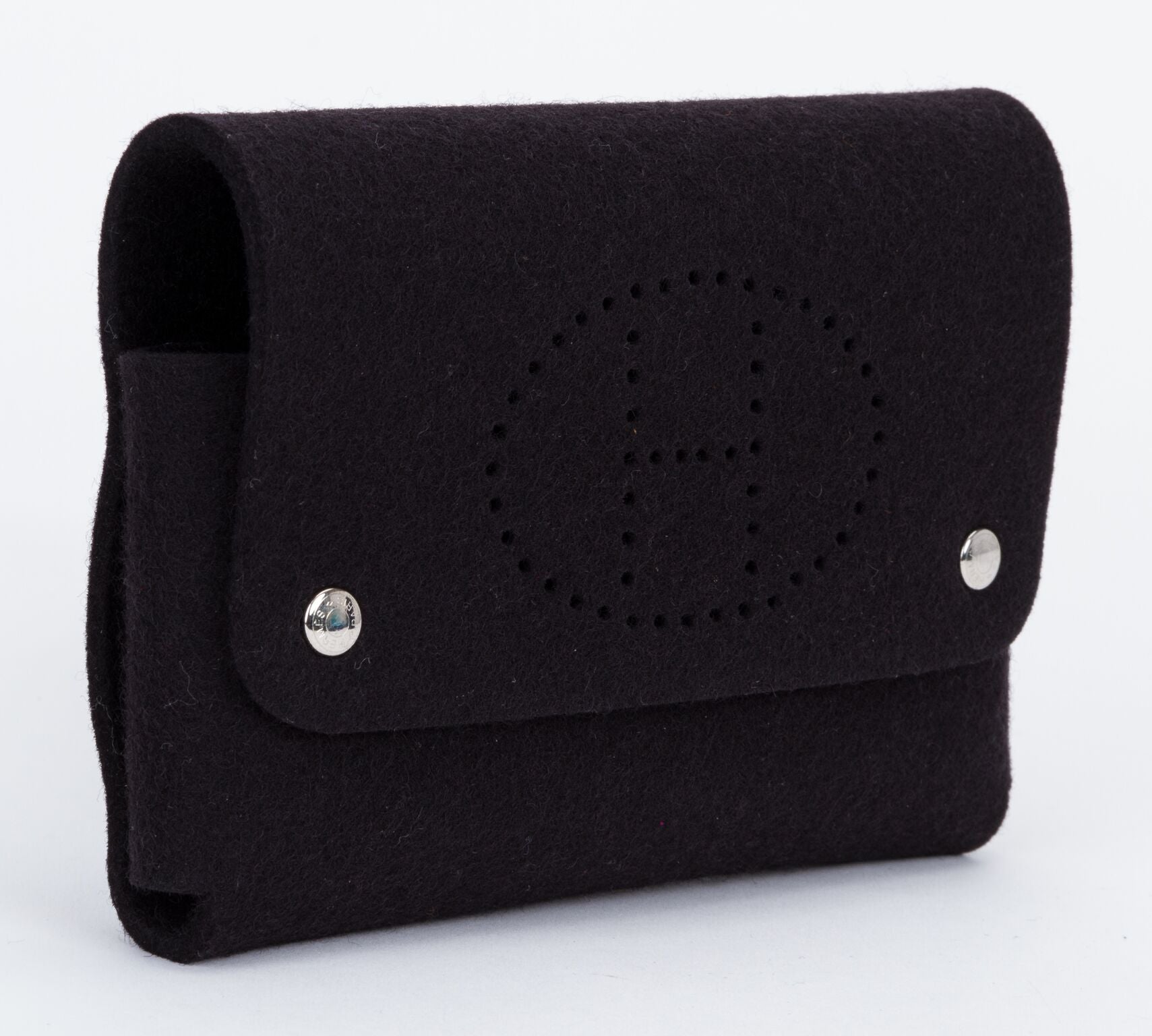 Hermès multifunctional black felt pouch with "H" perforated logo on front. Comes with original box and gift bag.