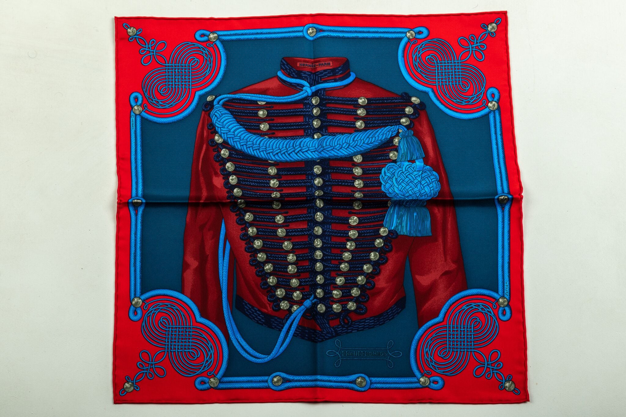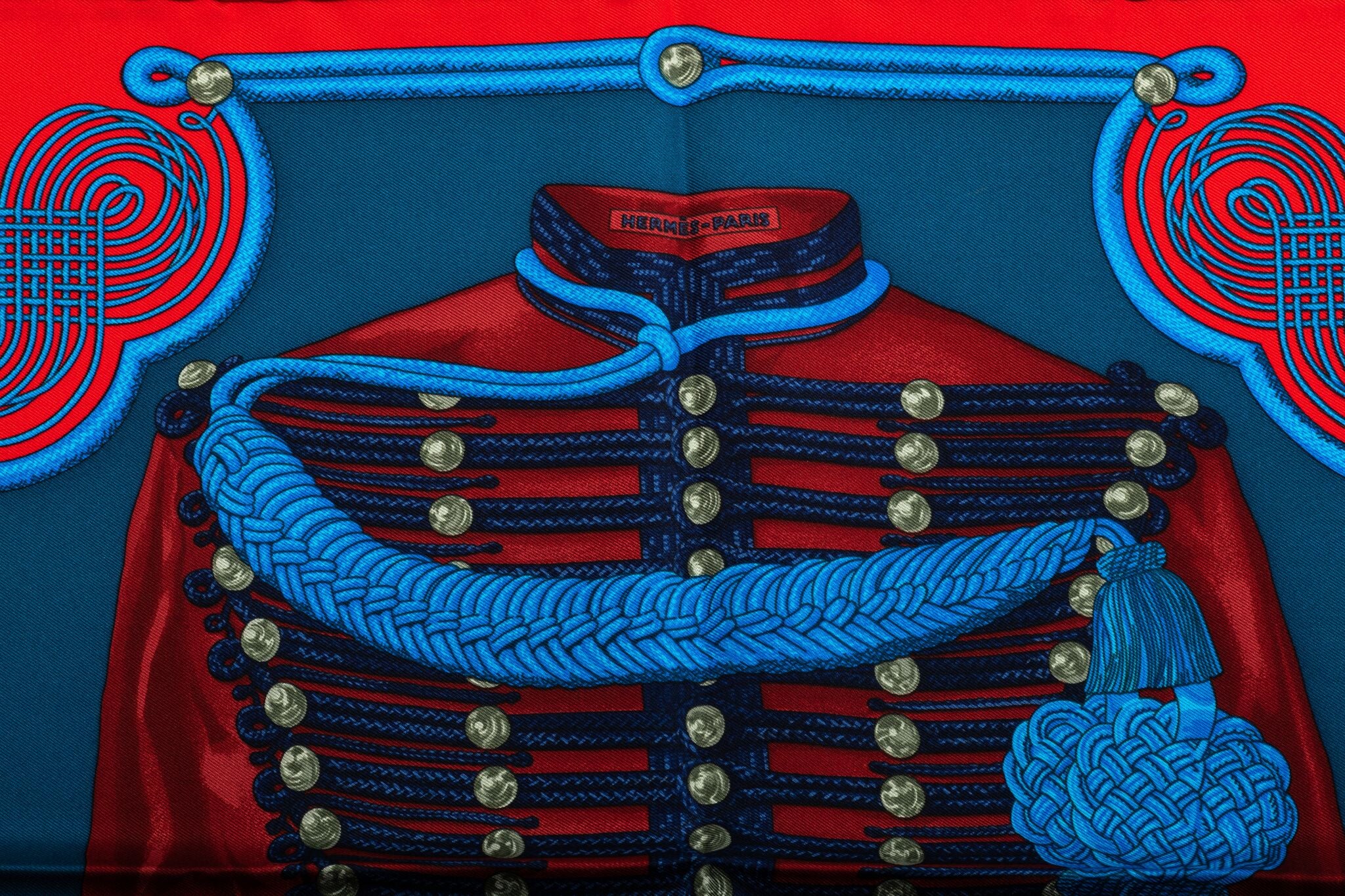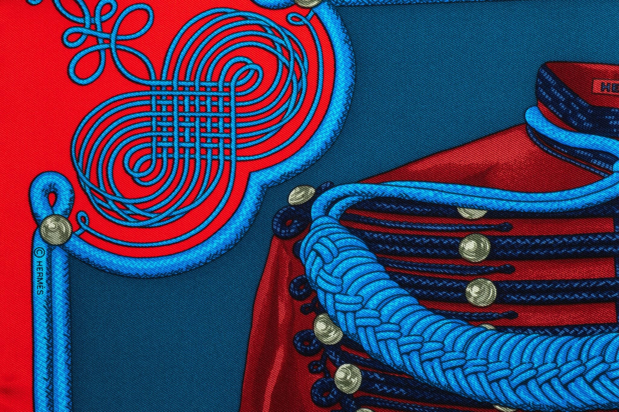 Hermès limited edition blue-and-red silk Brandebourgs gavroche scarf. Hand-rolled edges. New in box.