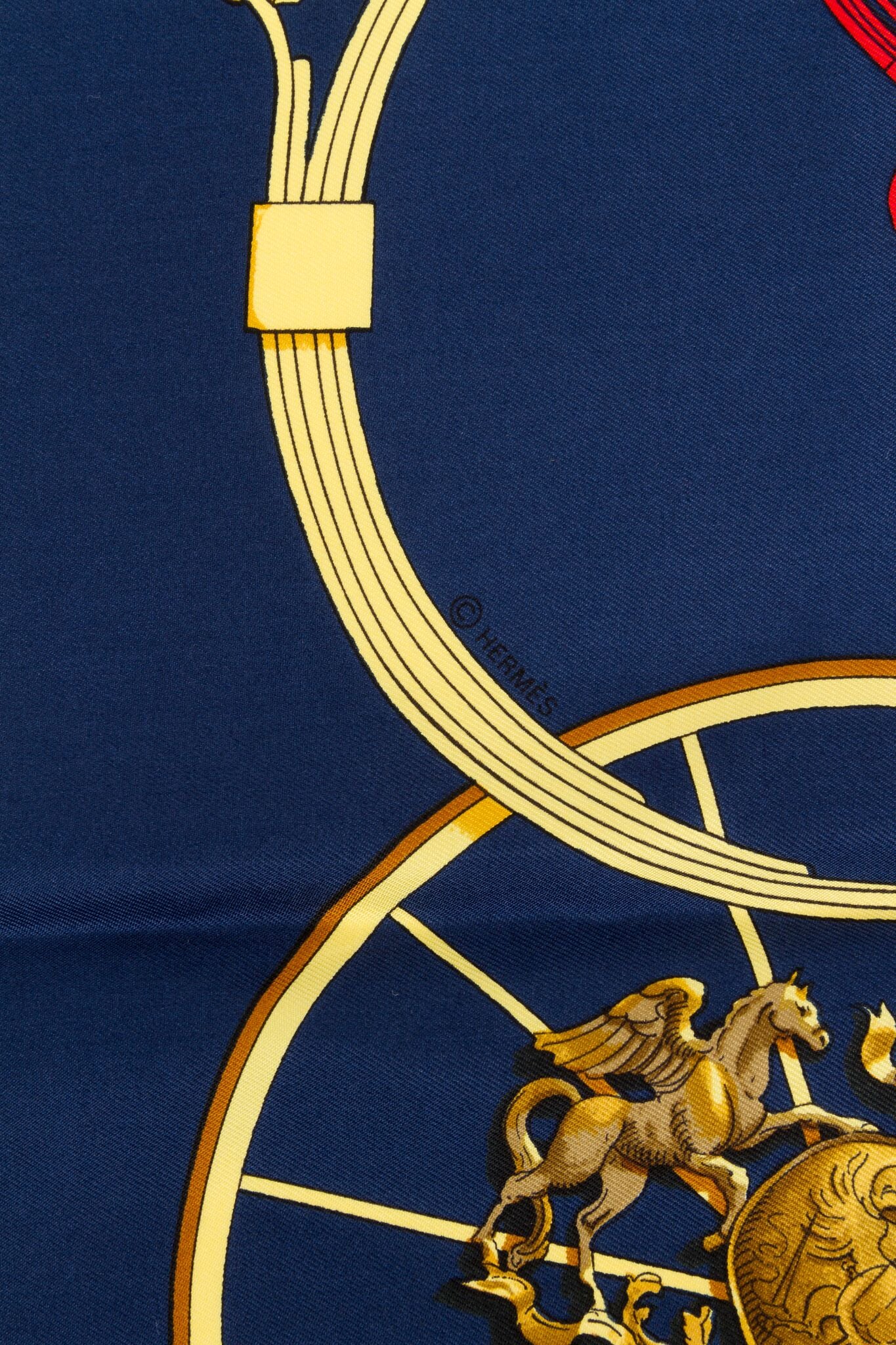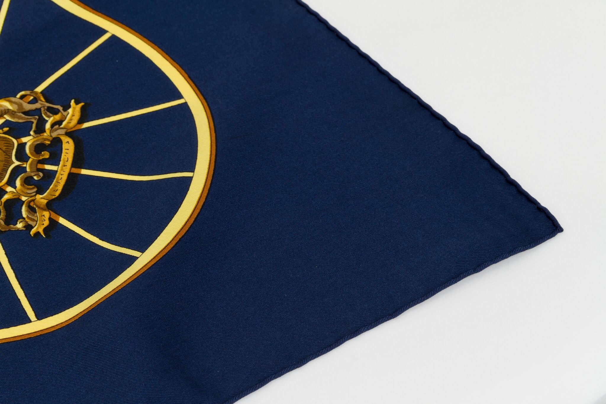 Hermès silk twill 35" square blue Springs scarf with gold tone carriage motif by designer Ledoux. Issue date was 1974. Hand-rolled edges.