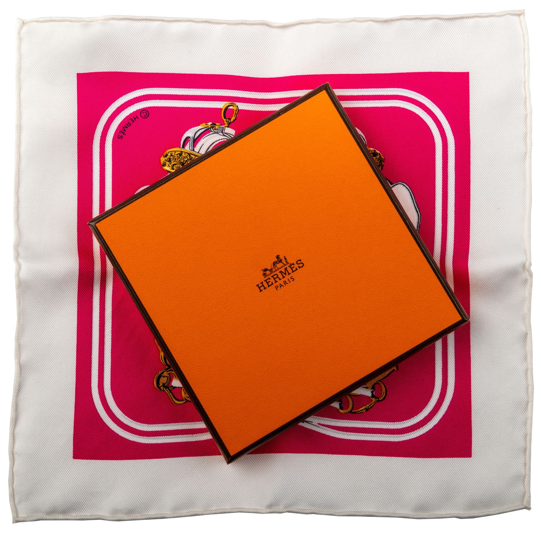 Hermes mini silk twill scarf with "brides de gala" famous design. 8", perfect as a bracelet or as a decoration on your bag. Brand new in box.