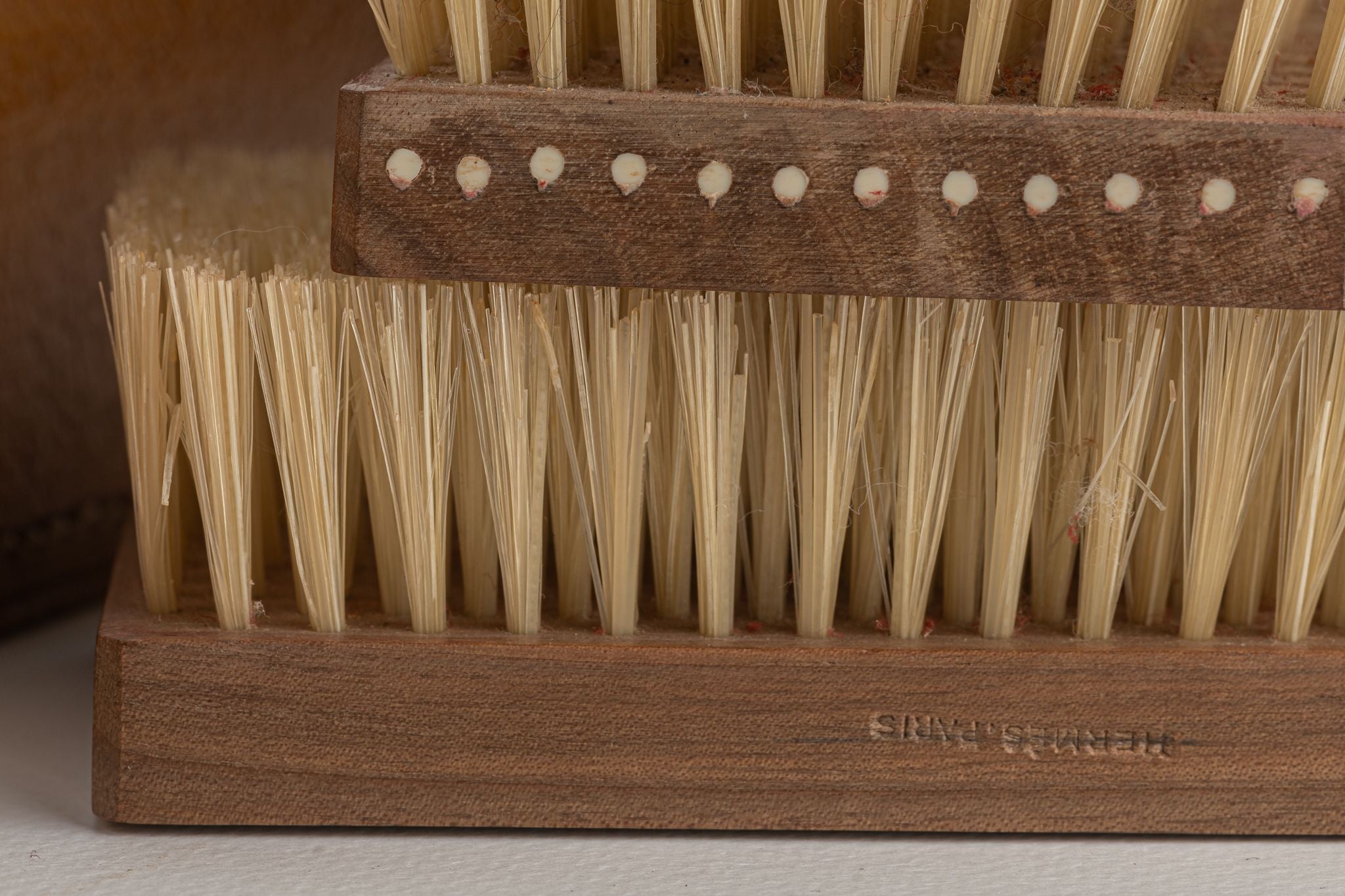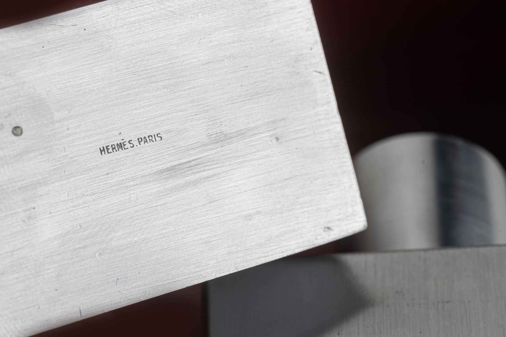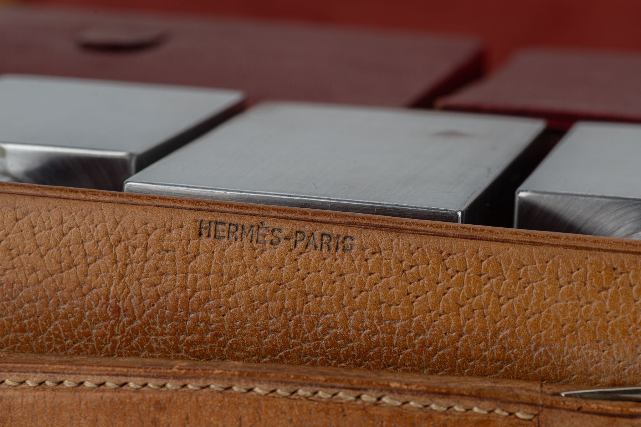 This Vintage Hermès grooming travel set is composed by a leather luggage with 2 silver metal bottles, 1 silver metal box, 2 wood brushes, 1 leather jewelry box, one bifold leather case with: 1 wood shoe horn, a silver metal razor, a blade holder, 1 leather pouch for a com, manicure set, 1 rectangular mirror.