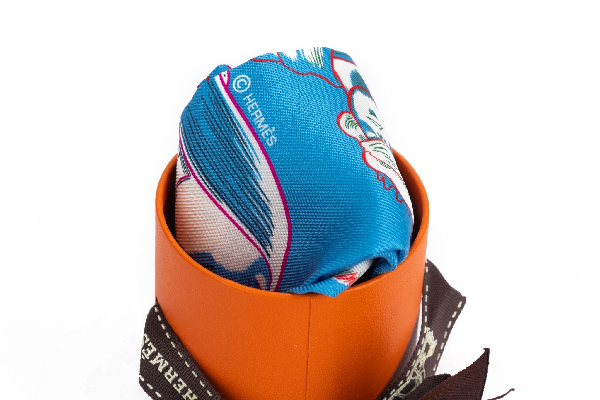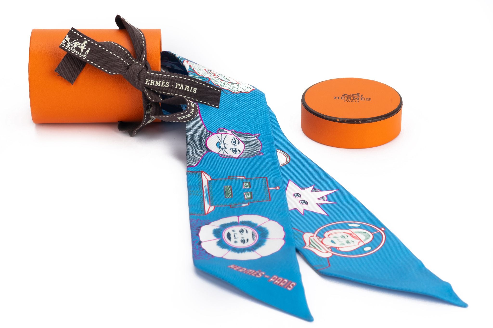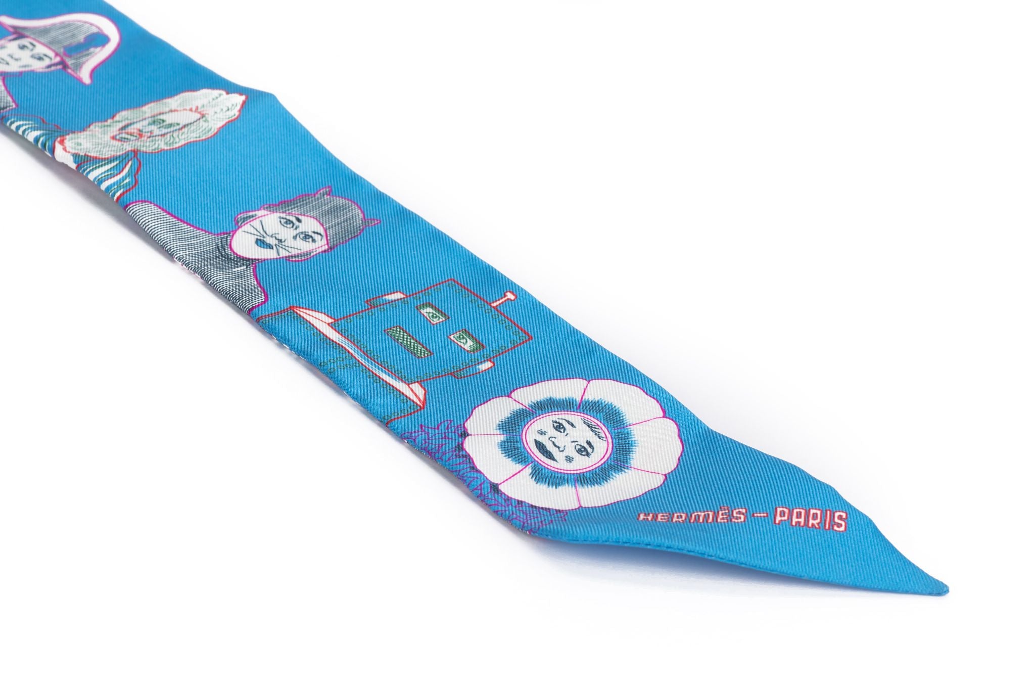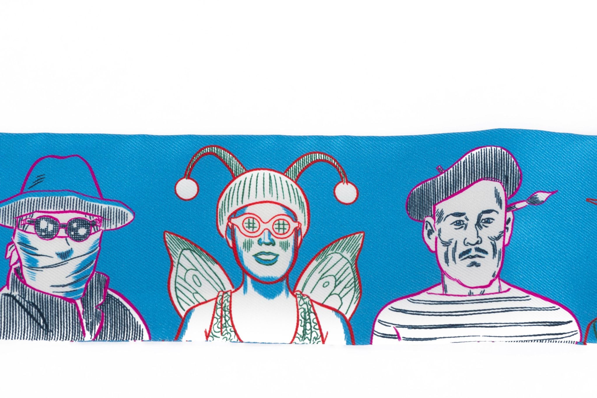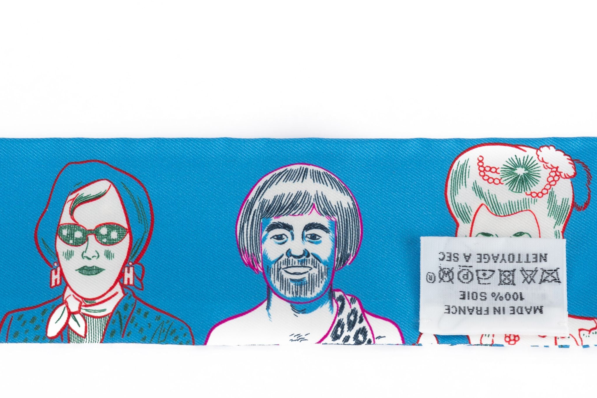 Hermès twilly with a comic pattern which shows different characters lined up. The scarf is new and comes in the original box.