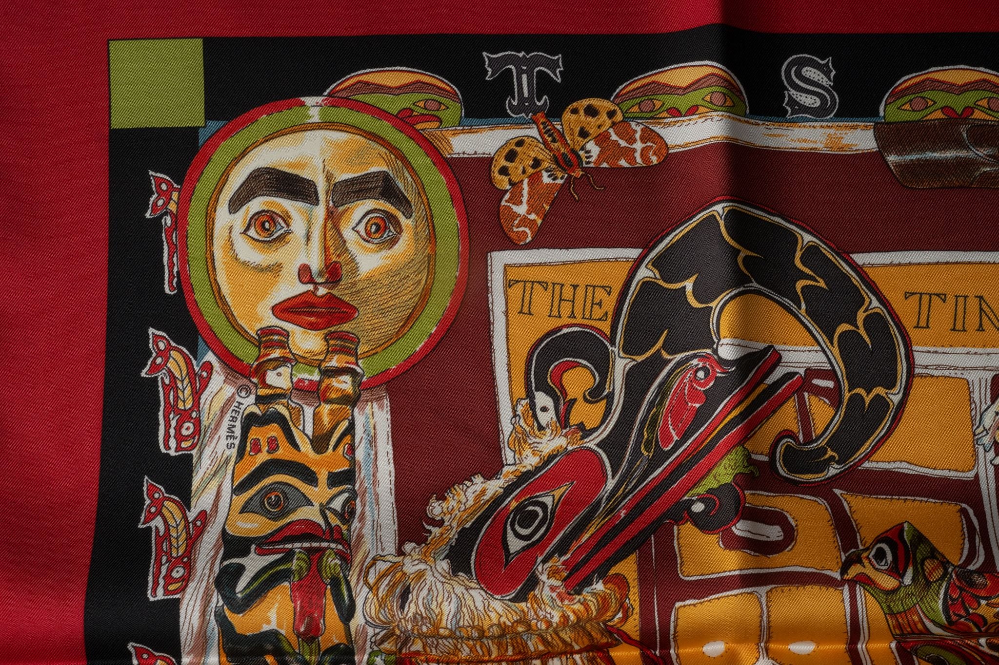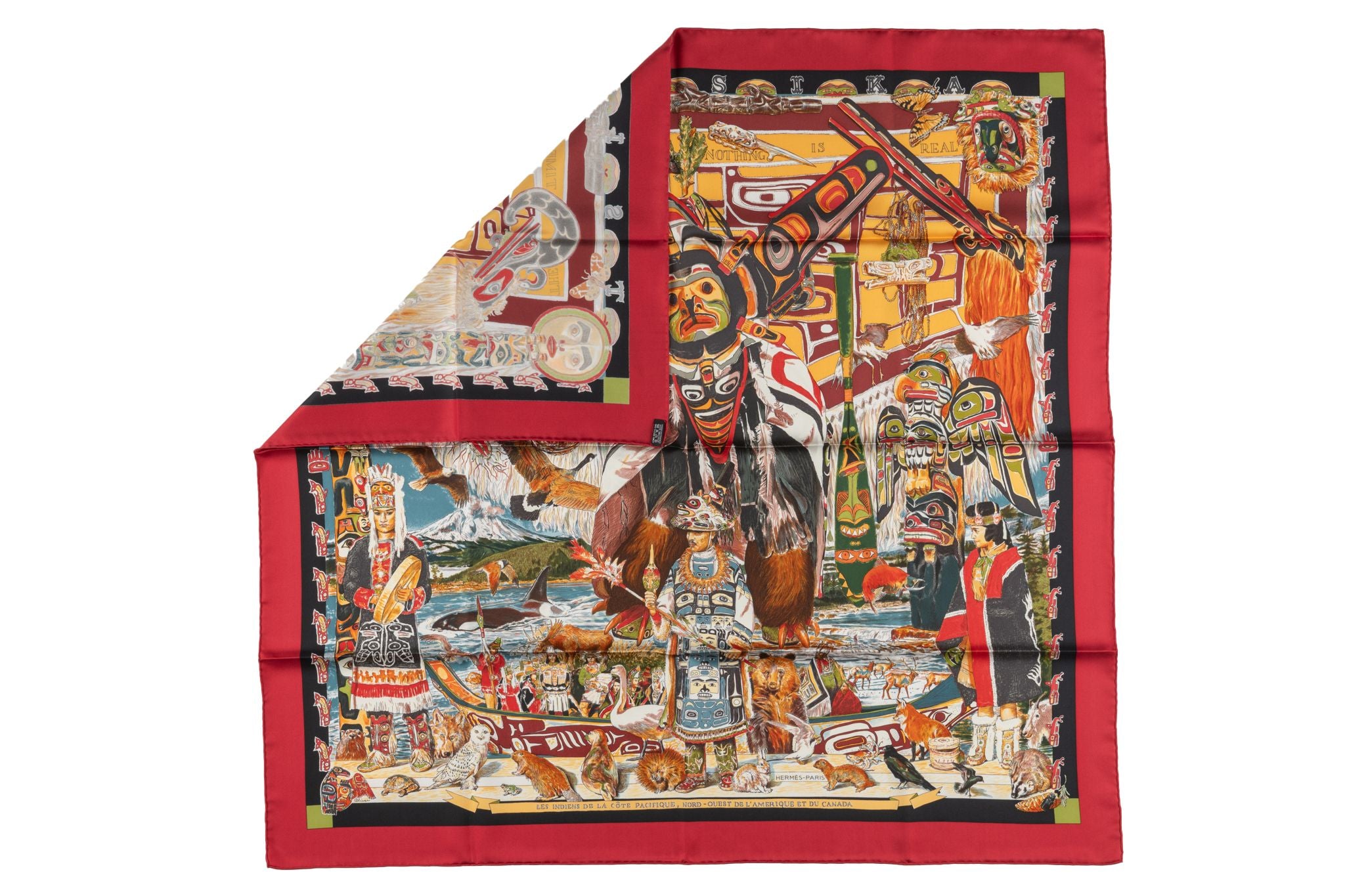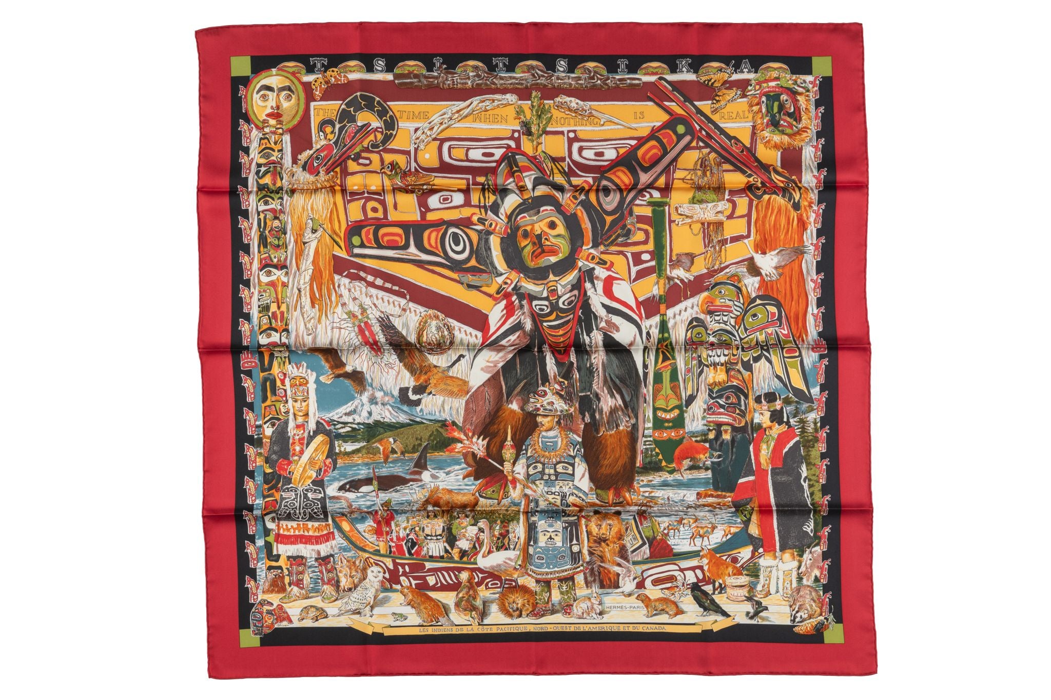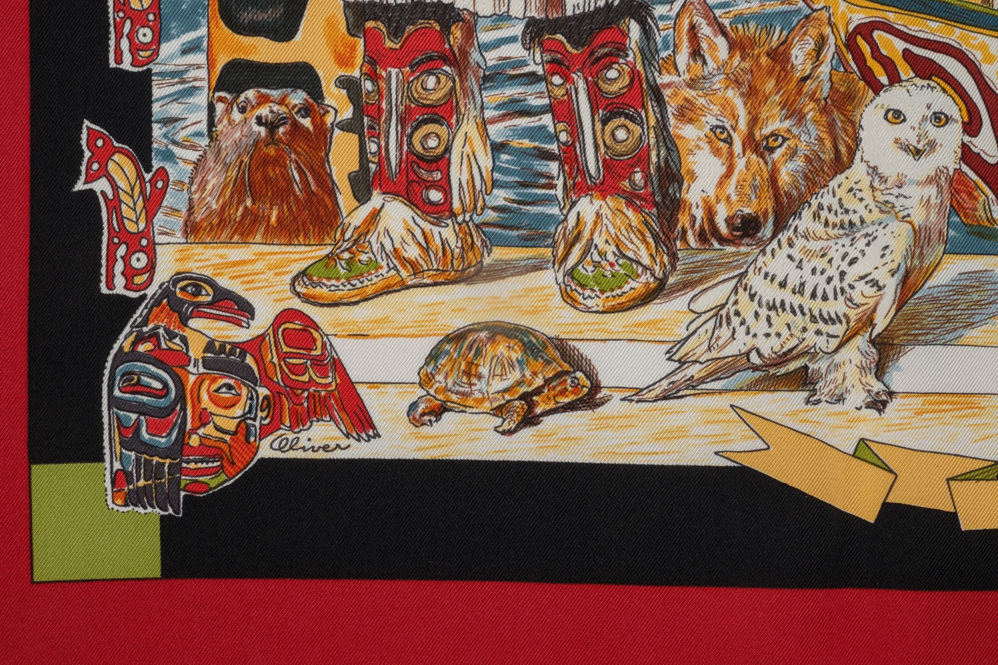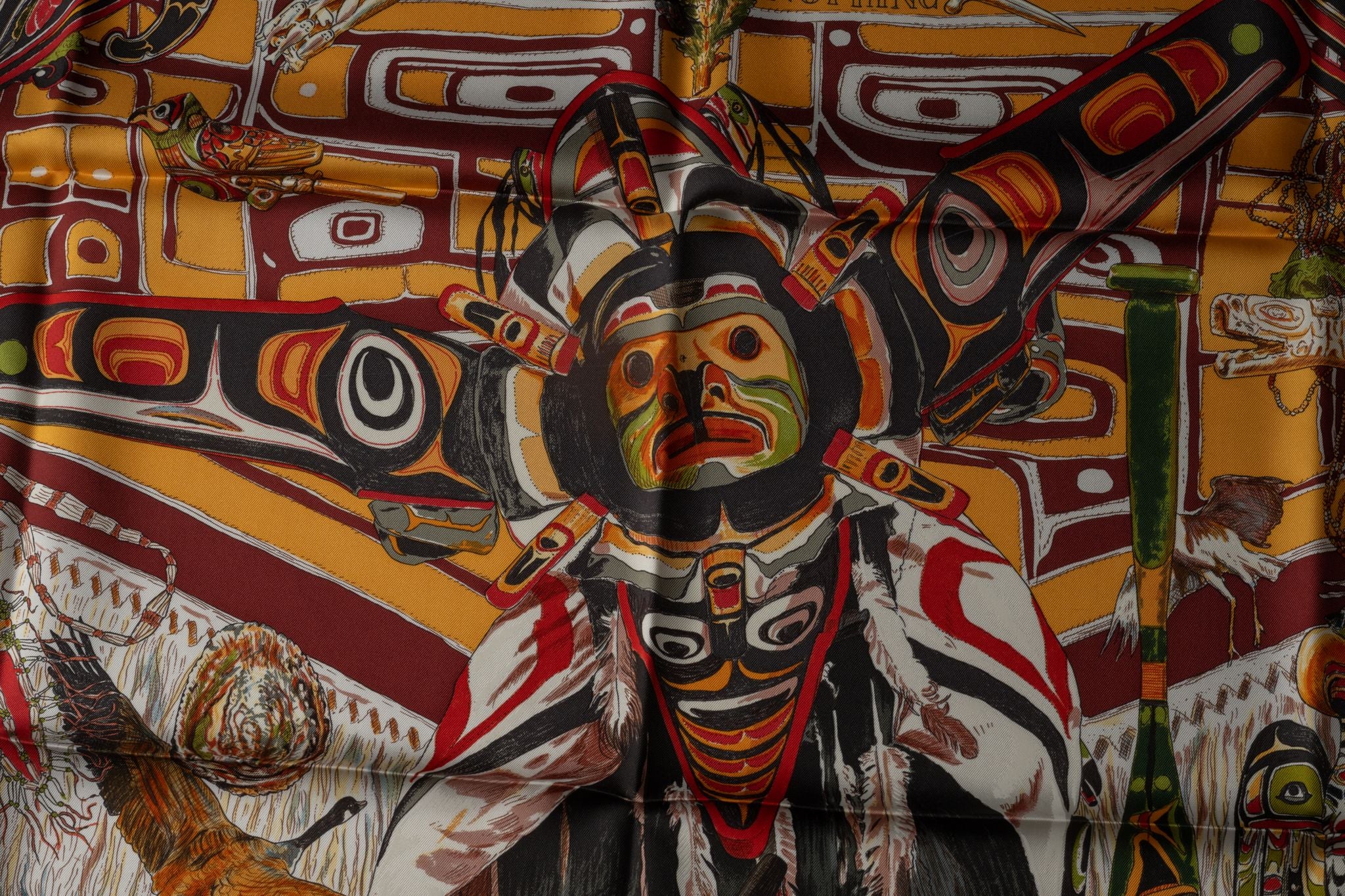 An extremely rare and collectable Hermès silk scarf by African American artist Kermit Oliver from A/W 2002. The design is called “Tsitsika (“Time When Nothing Is Real”) or “Les Indiens de la Côte Pacifique, Nord-Ouest de L’Amerique et du Canada” and is part of Oliver’s series of designs based on nature and ethnographic illustrations of Native American tribes in America and Canada. The design of “Tsitsika” focuses on the Kwakiutl people. Hand rolled edges.