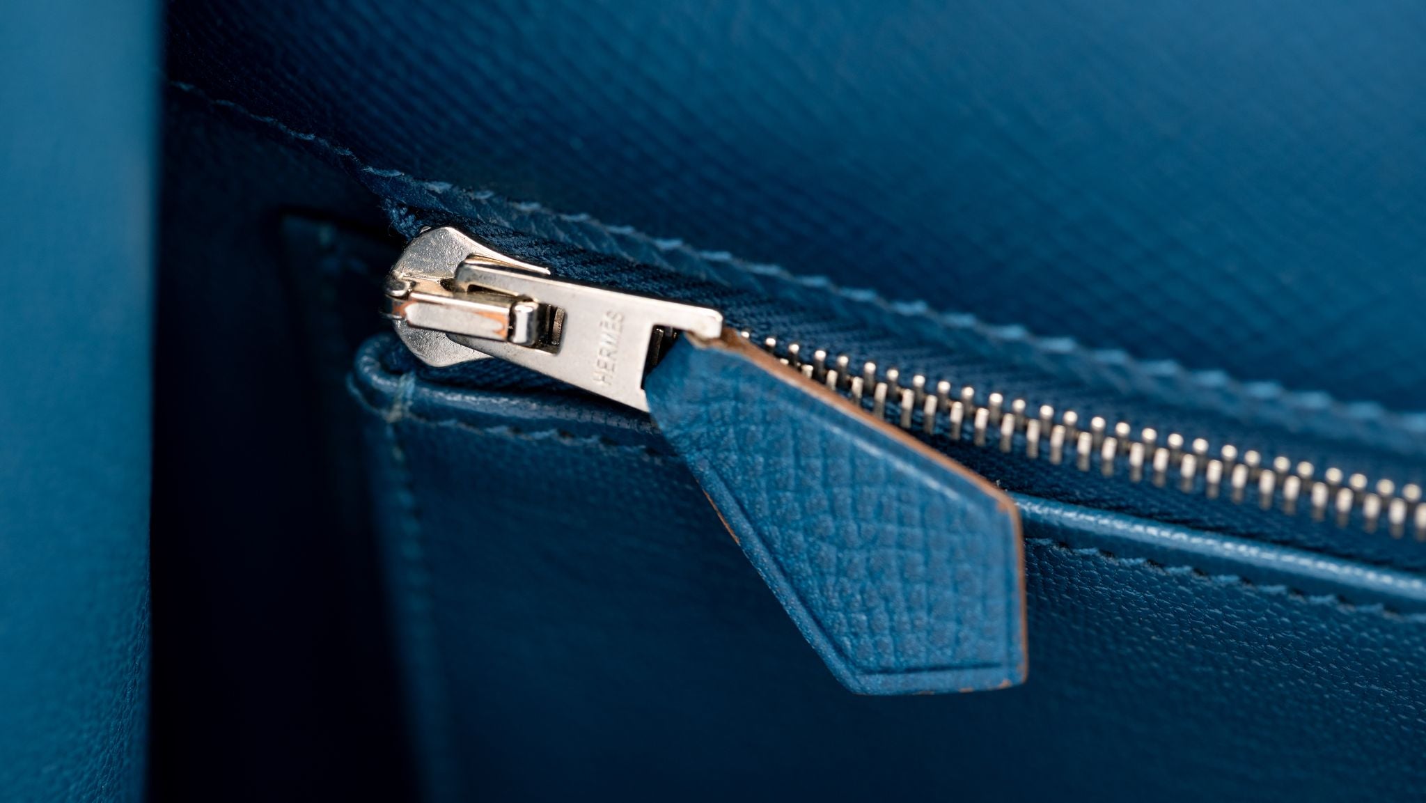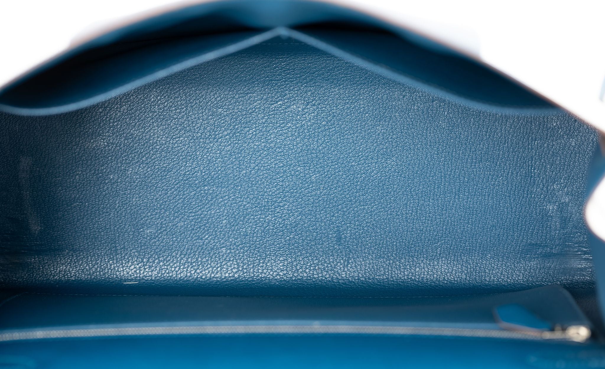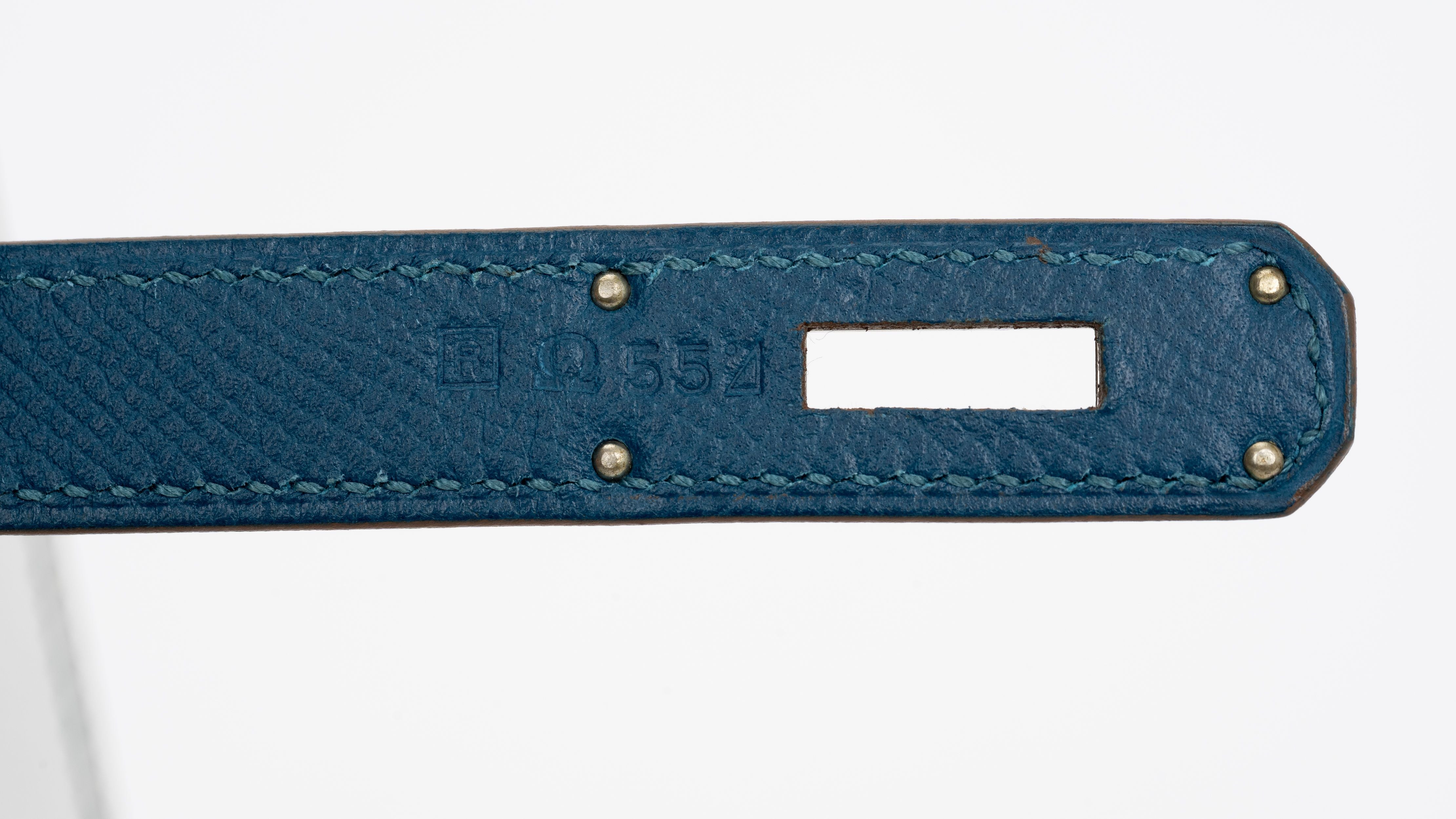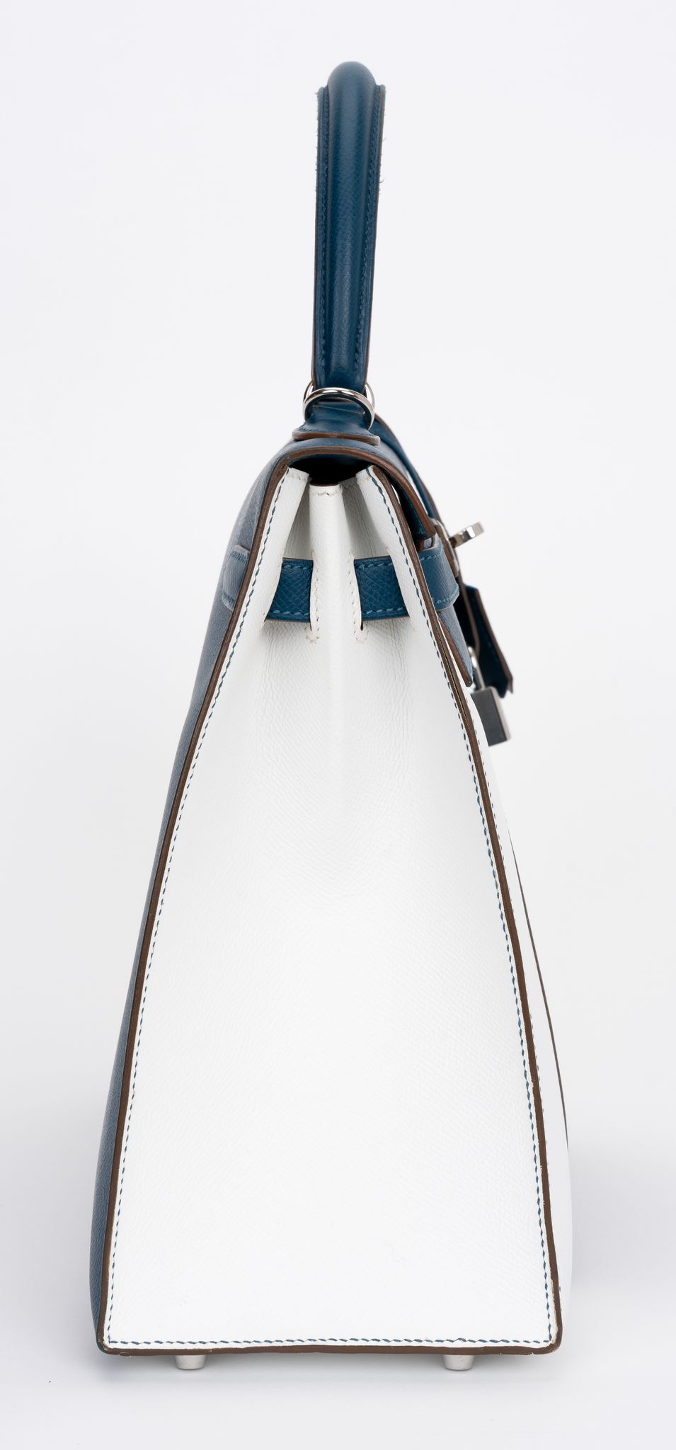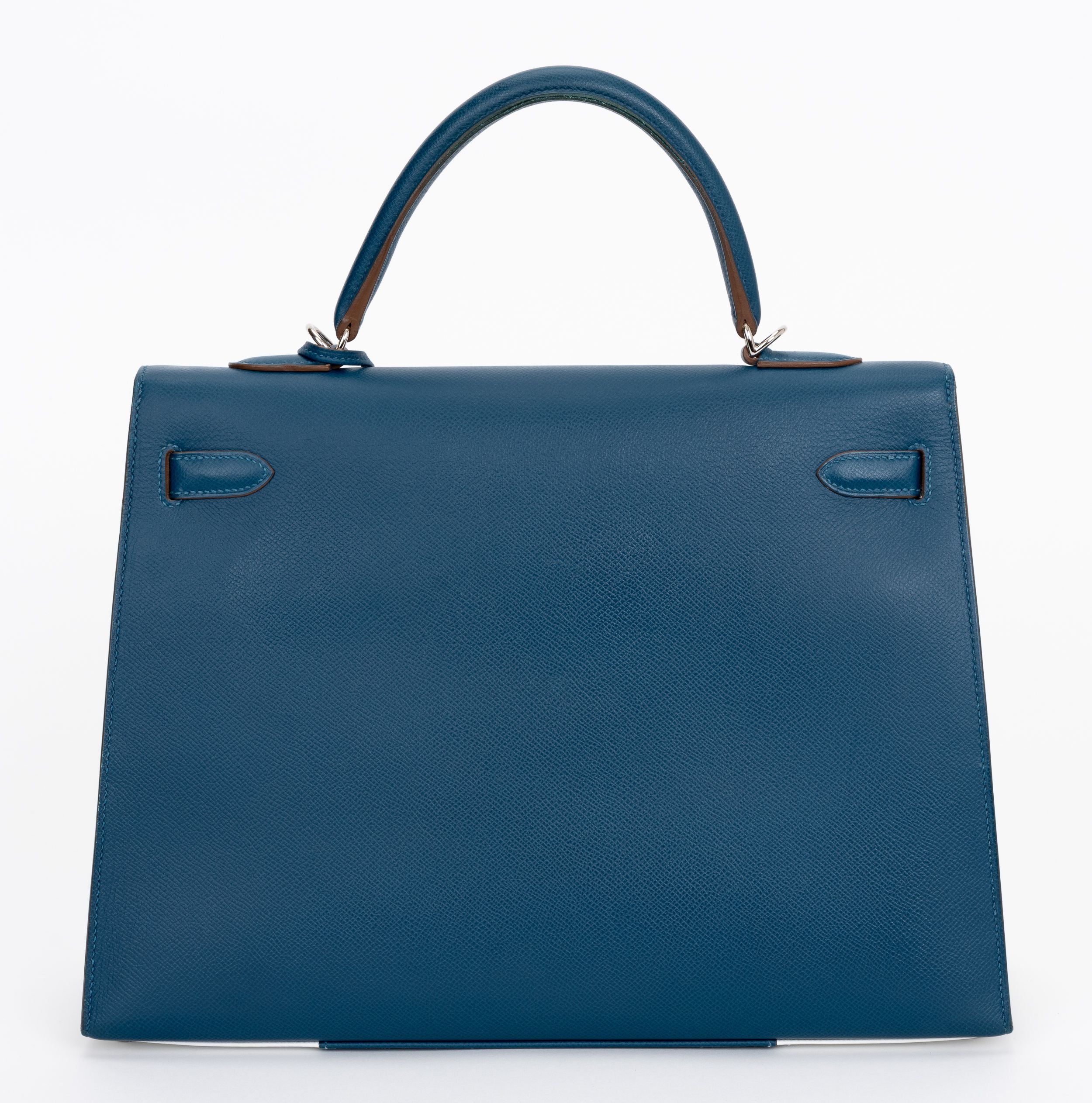 The Hermès Kelly 35 sellier Flag Handbag in Bleu Thalassa and White Epsom leather with Palladium hardware is a classic and rare find. Limited production customized item. Date stamp R. Comes with clochette, tirette, lock, 2 keys, small and large dust cover.