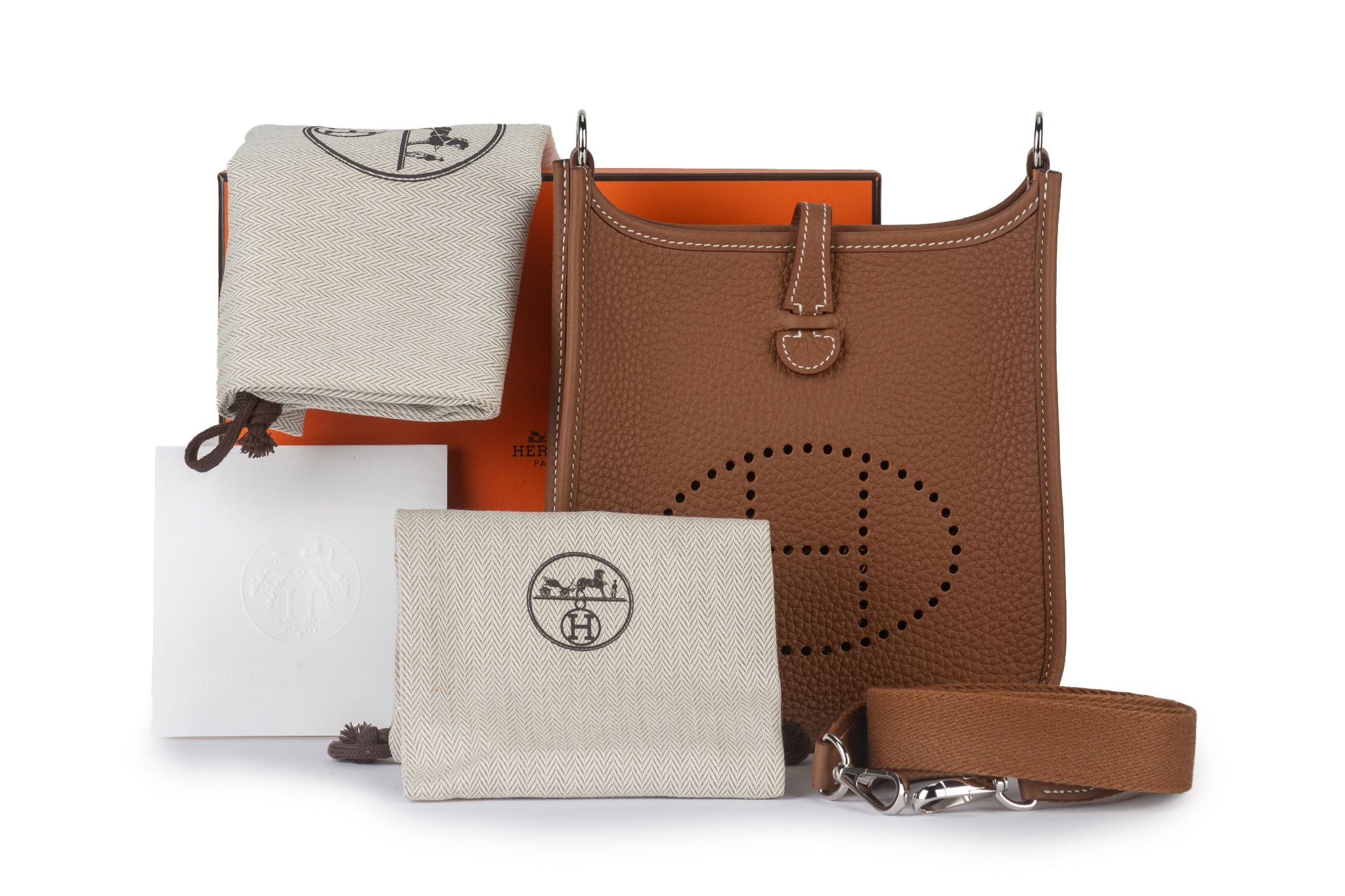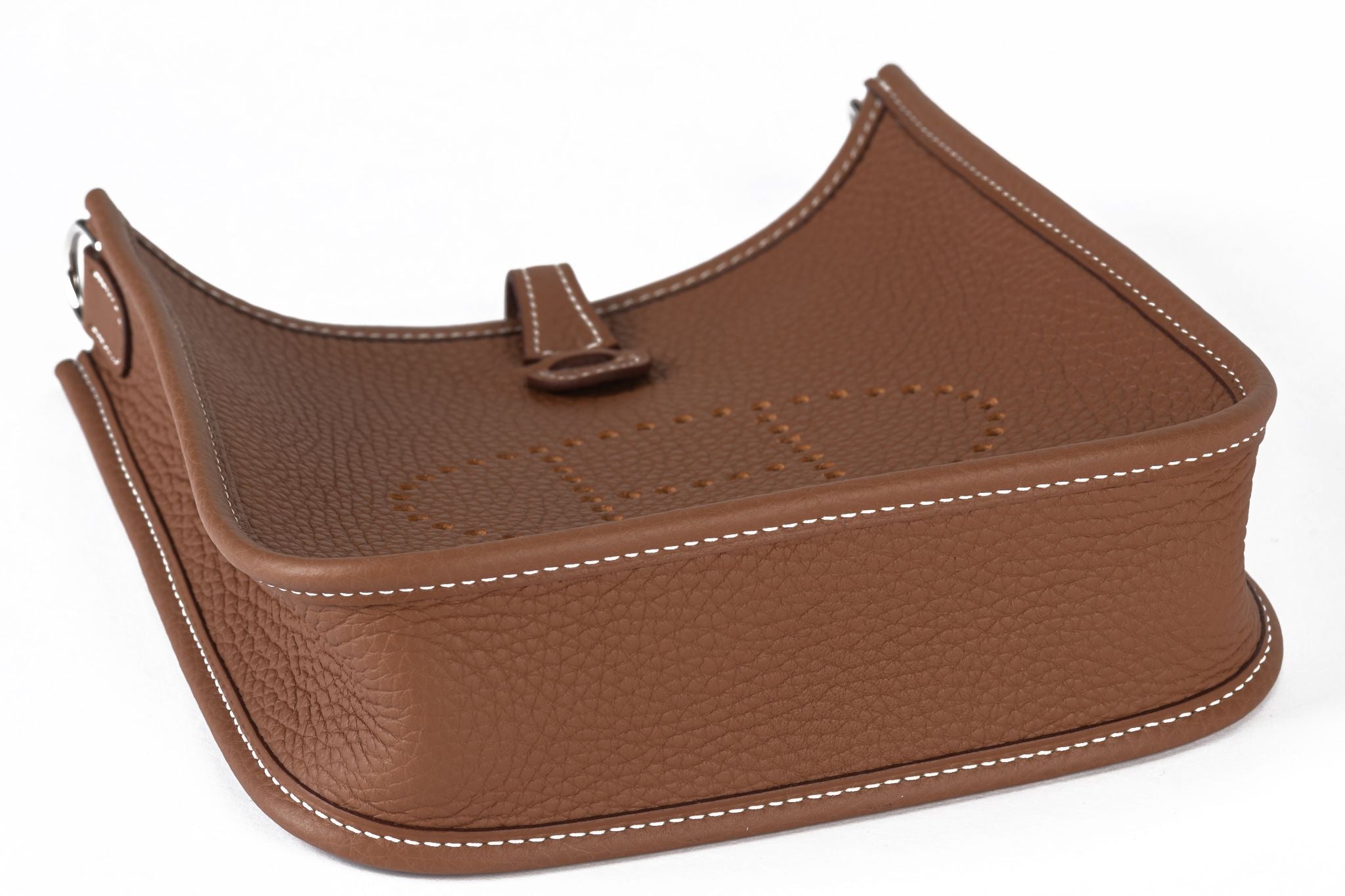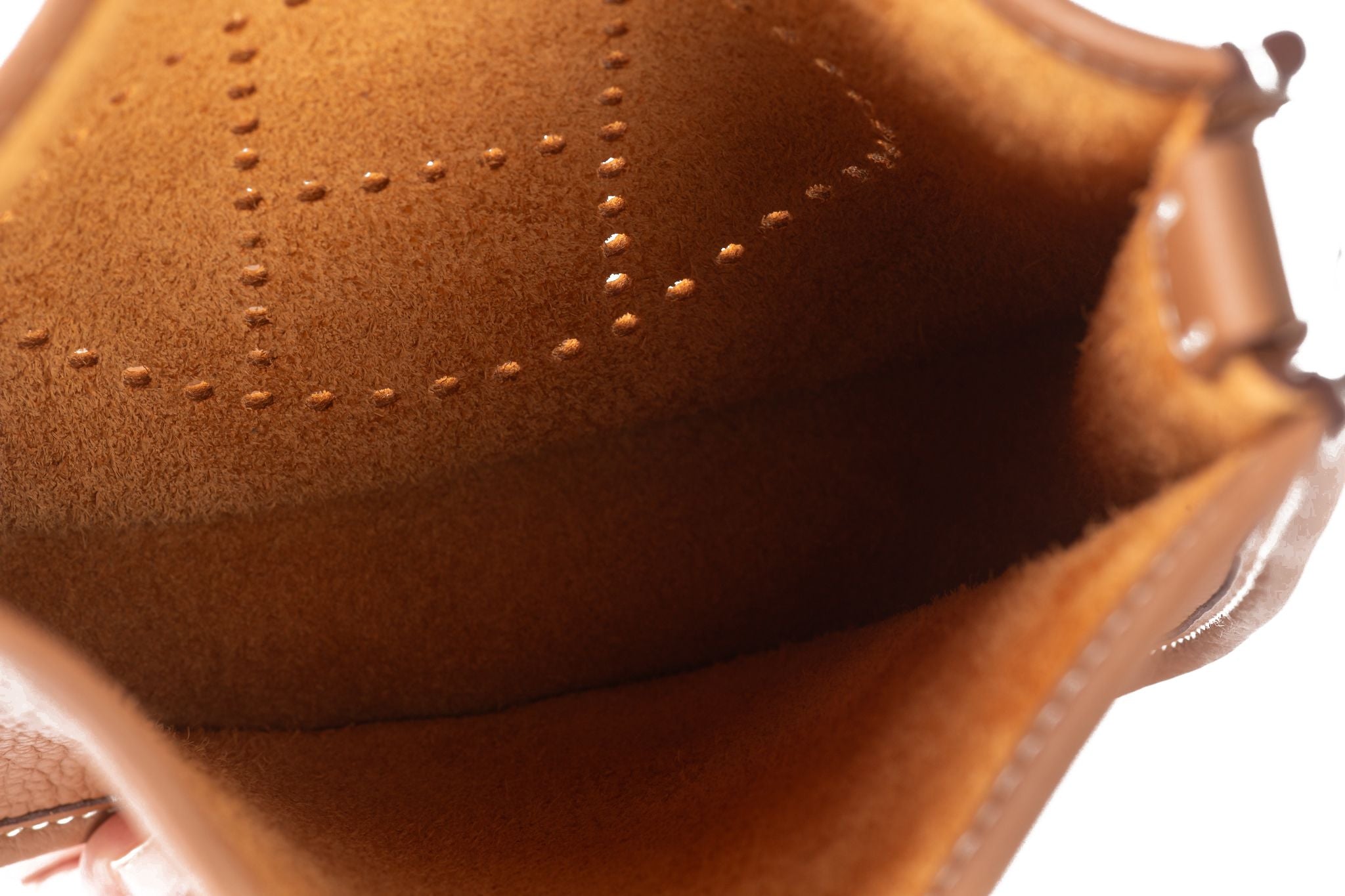 This Hermès Mini Evelyne Bag in camel brown leather features perforated logo detail, an adjustable shoulder strap, snap fastening, main compartment. Comes with booklet, original dust cover and box. Letter W for 2025.