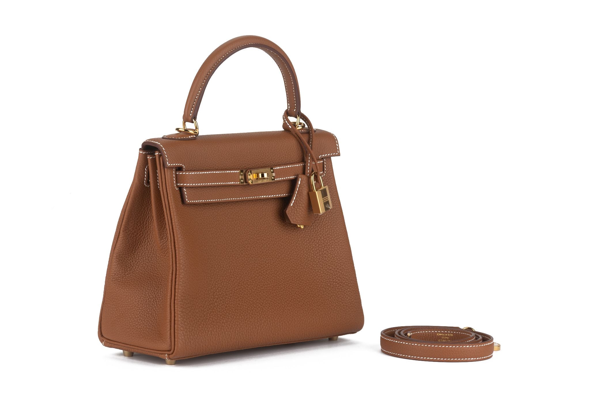 Hermès new Kelly 25 Retournè in gold Togo leather with white stitching and gold tone hardware. Comes with clochette, tirette, lock and two keys. Matching detachable shoulder strap. First letter W. Comes with booklet, original dustcover and box.
