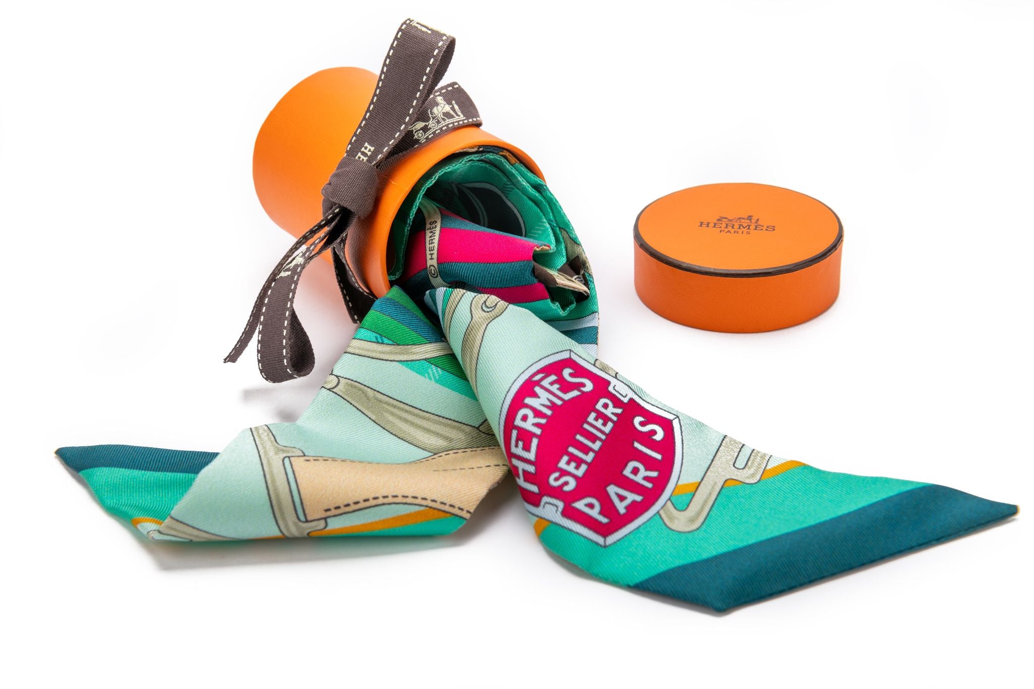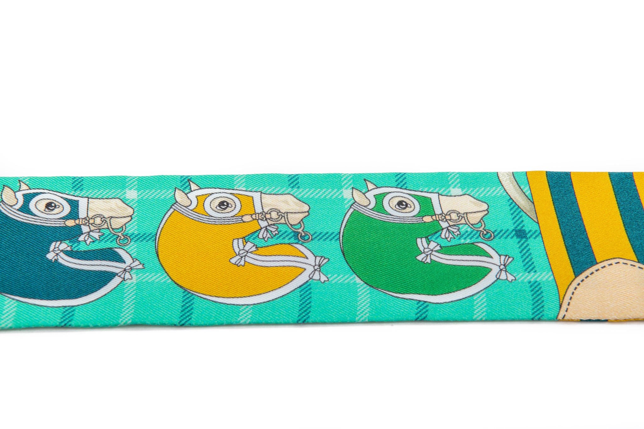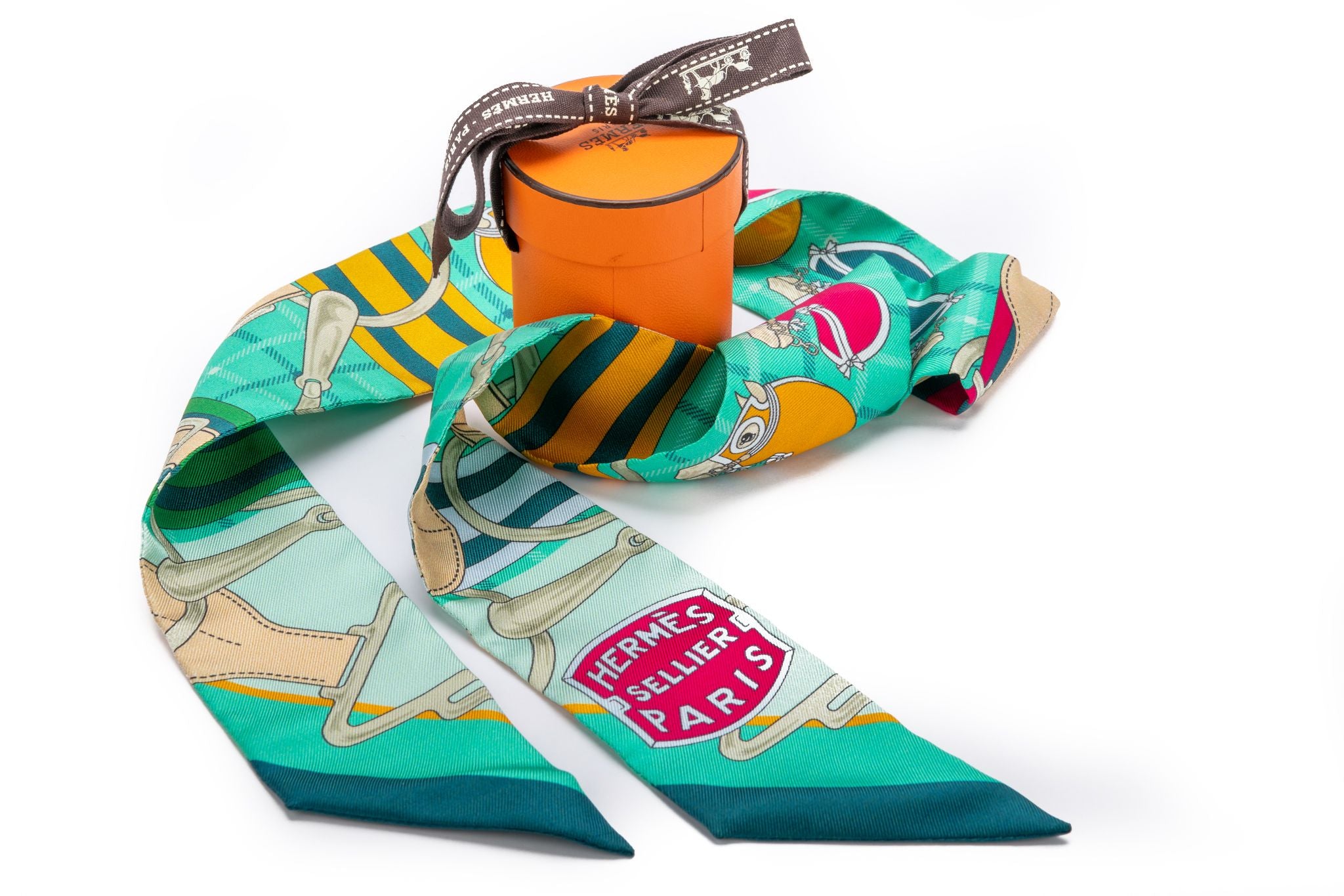 Hermès Sellier Twilly brand new. This scarf is made out of silk and has never been worn. It is multicolor with green base. The piece comes in the original box and is wrapped with the traditional Hermès ribbon.