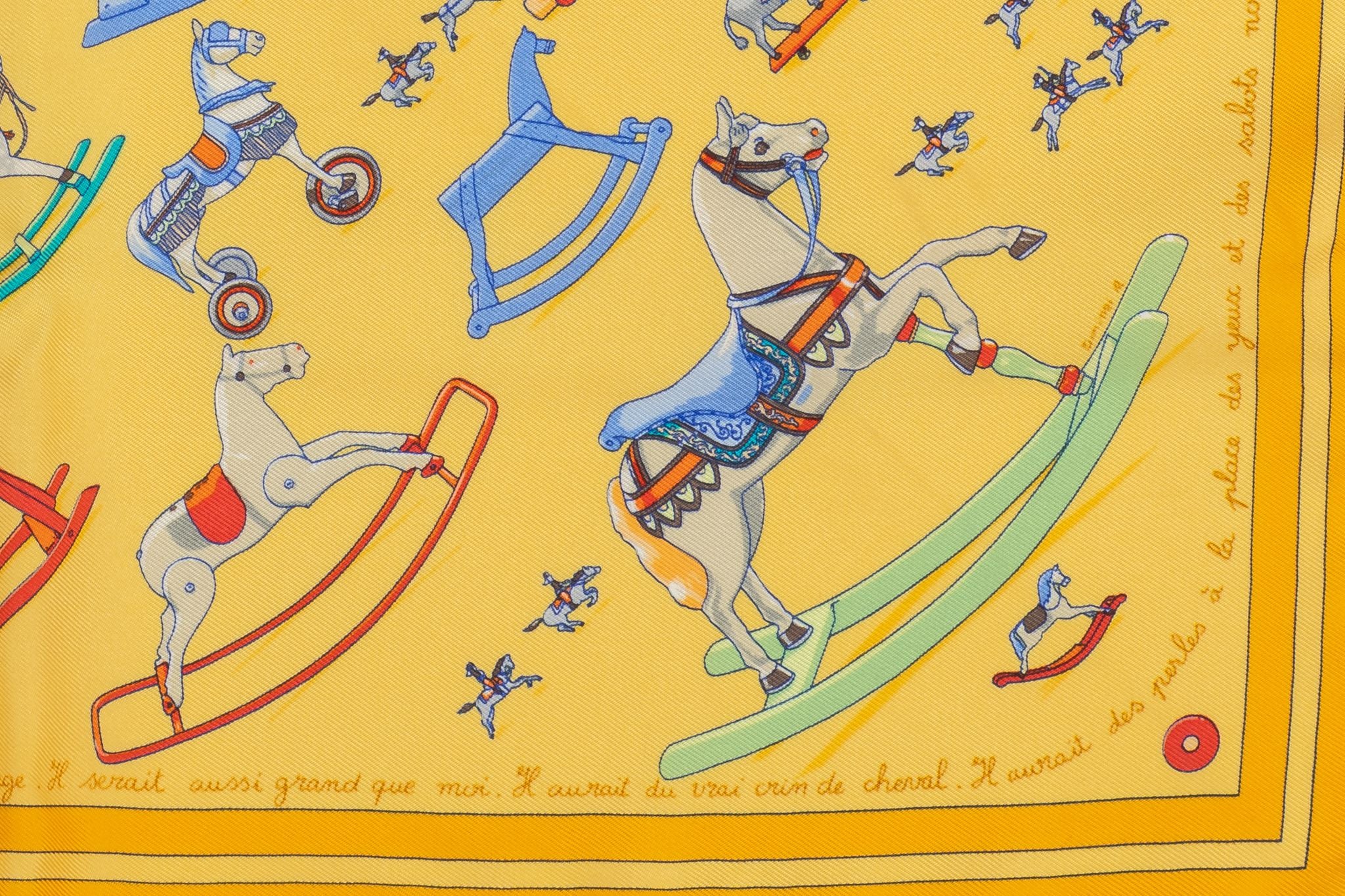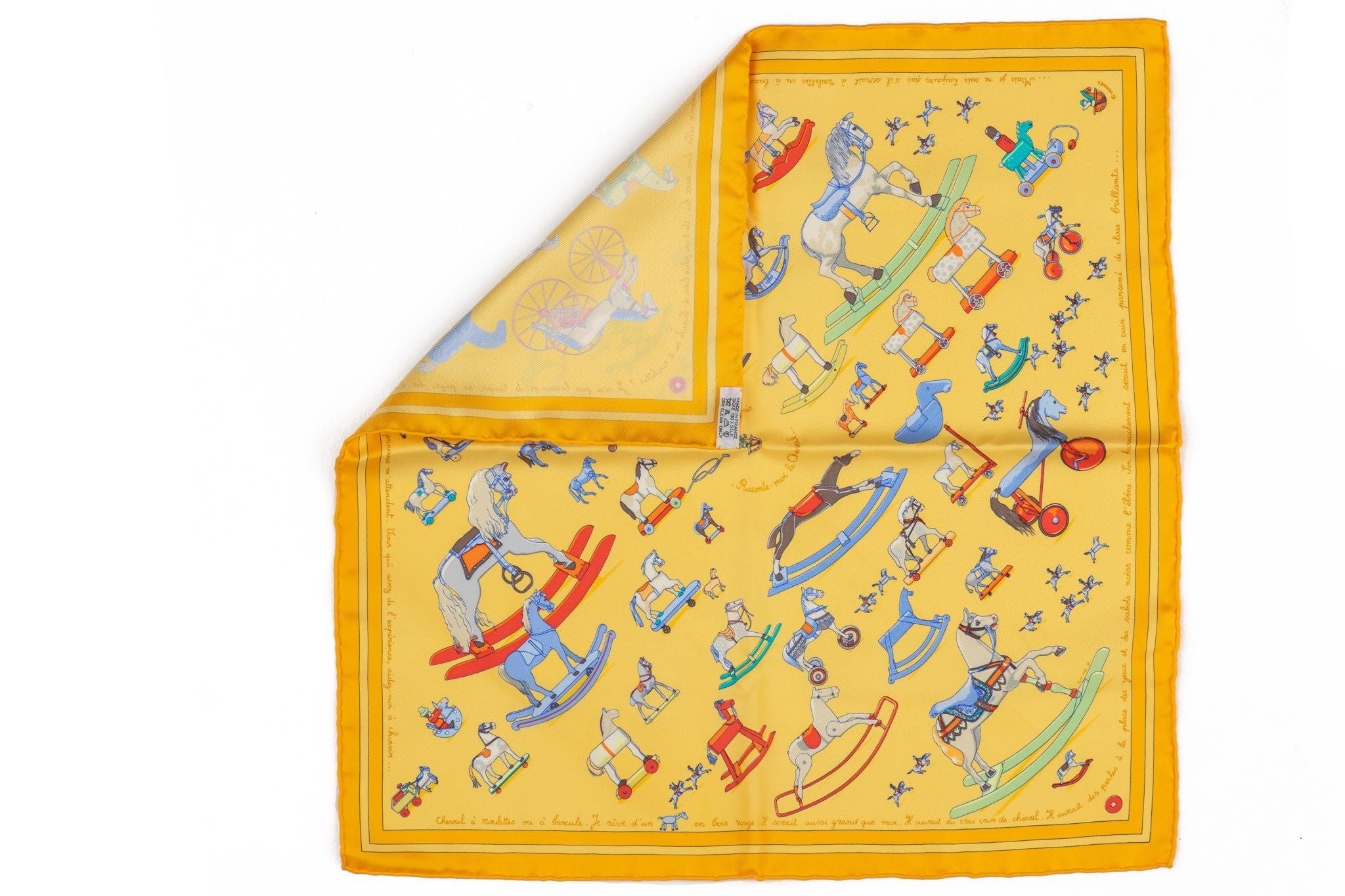 Hermès brand new “raconte moi le cheval” yellow silk scarf. Hand rolled trim. Comes with original box.