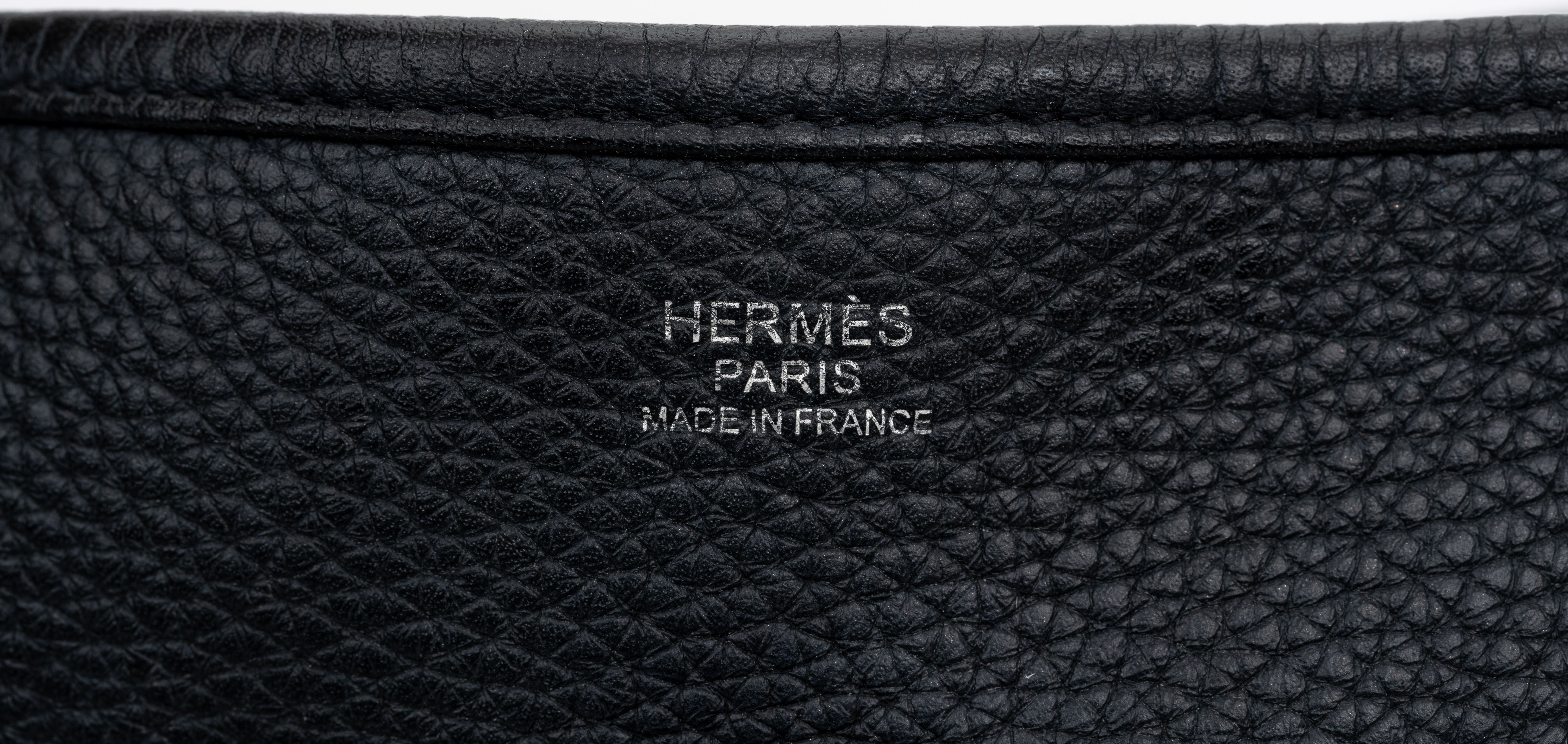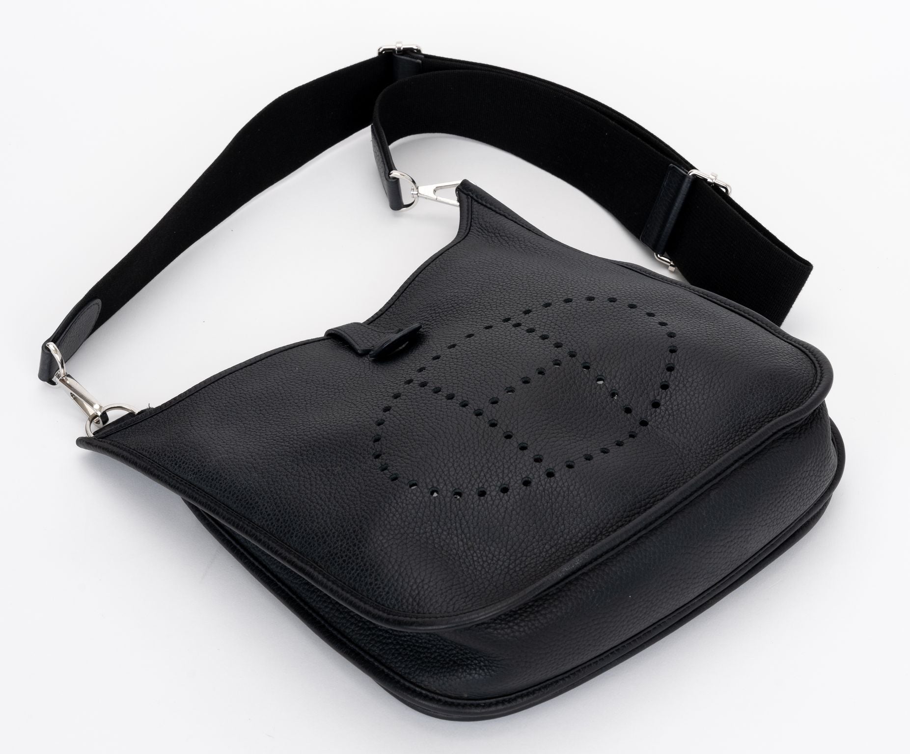 The Hermes Evelyne PM bag in black with Palladium hardware. The bag can be worn as a shoulder or cross body bag. Date stamp Z. Excellent condition, minor wear inside. Comes with original dust cover.