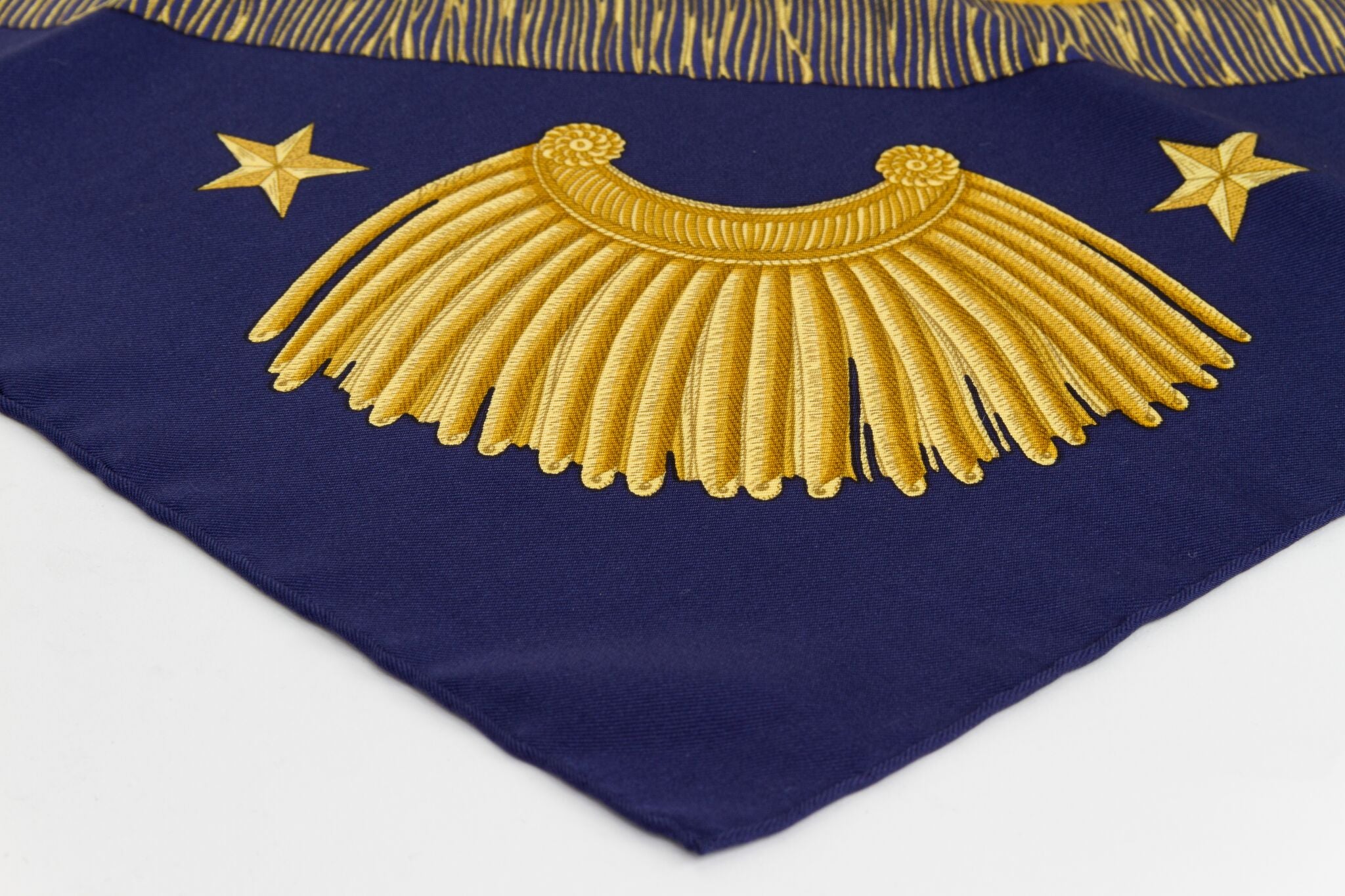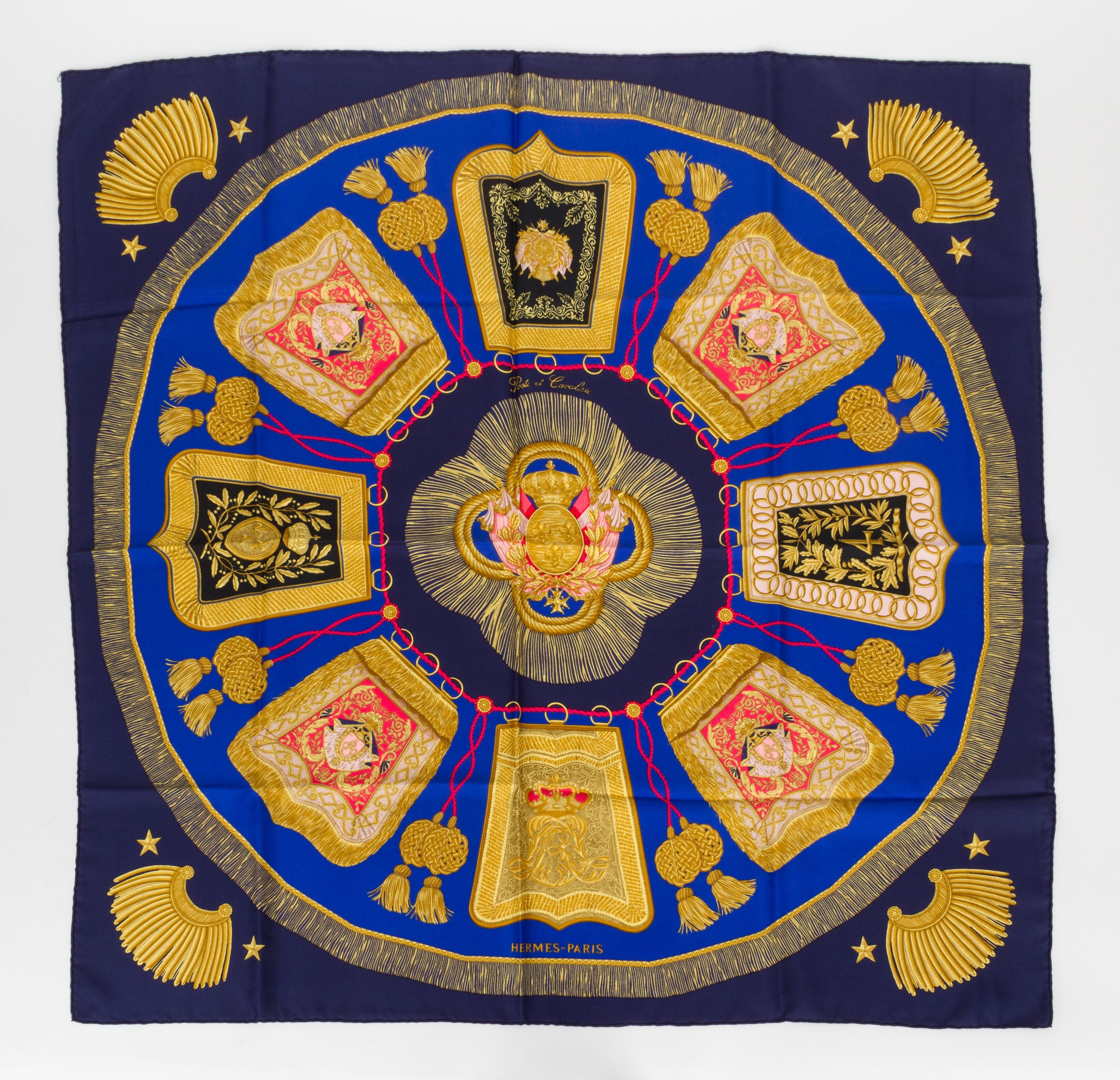 Hermès "Poste et Cavalerie" blue and bluette silk twill scarf. Hand-rolled edges.